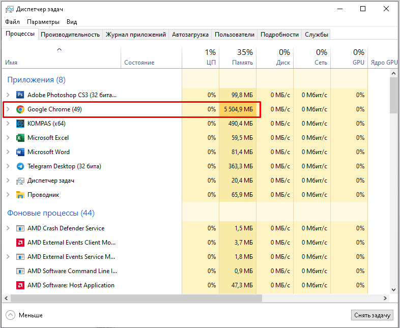 Задача посложнее — браузер Google Chrome. Для имитации деятельности в нем открыто 30 вкладок, 5 из которых — таблицы, 5 — текстовые документы, а оставшиеся — просто популярные сайты. Среди последних маркетплейс, электронная почта, интернет-магазин и даже ресурс с фриланс-услугами, в общем, все то, что может потребоваться в офисе. Согласно данным диспетчера задач, на это выделяется порядка 5,5 Гб. В итоге необходимый минимум для такой работы составит 8 Гб, ведь часть памяти потребуется отдать системе, а часть — встроенной графике.