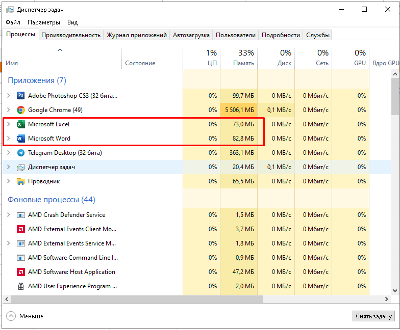 Ситуация меняется, когда в текстовых документах Word появляется множество изображений, а в таблицах Excel — обилие строк, столбцов, формул и элементов условного форматирования. В таких сценариях потребление ОЗУ превышает 4 и даже 8 Гб. Кроме того, значительно возрастает нагрузка на процессор.