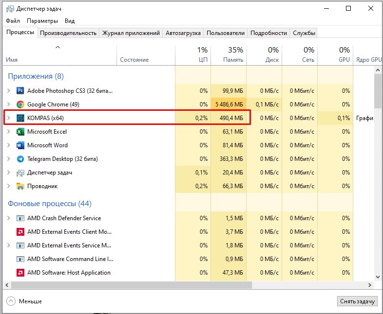 Сценарии использования ноутбуков не ограничиваются текстами и таблицами. Многие устройства применяются для решения прикладных задач, например, проектирования металлоконструкций. Имитировать такую деятельность поможет Kompas 3D с открытой моделью светового щита. Диспетчер уведомляет, что приложению хватило около 500 Мб — не так много по сравнению с браузером. Разумеется, показатель пропорционален сложности сборки и может достигать 32 Гб. Но это уровень проектных институтов, для которых не предназначены обычные рабочие ноутбуки.