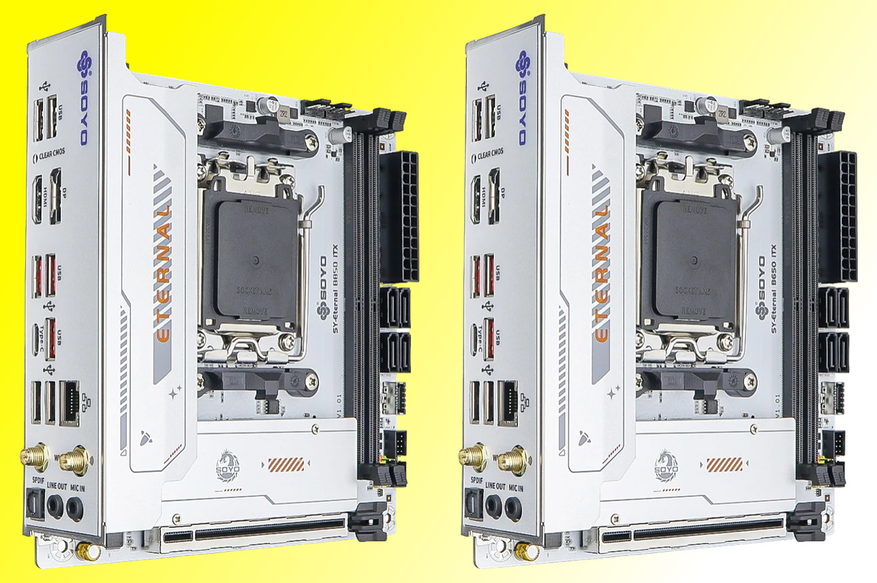 Компания SOYO выпустила материнские платы формата Mini-ITX Eternal B850 и B650 в белом дизайне. Обе модели обладают идентичными характеристиками, включая систему питания 10+1 фаз с DrMOS на 50А и один 8-контактный разъем CPU power.