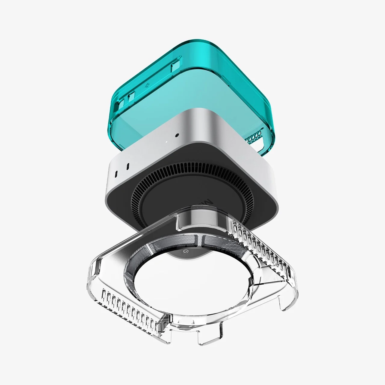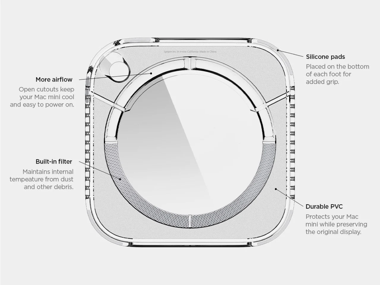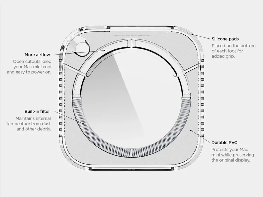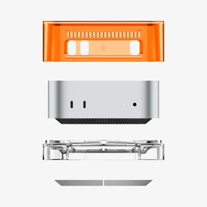 В основание корпуса встроен пылевой фильтр. Прозрачная подставка приподнимает Mac mini над поверхностью стола, обеспечивая дополнительную циркуляцию воздуха под устройством.
