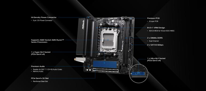 Плата получила чёрный текстолит и радиаторы, формируя единую эстетику для миниатюрных систем. Её основу составляет 8+2+1-фазная система питания и 8-слойная печатная плата, обеспечивающая стабильность даже при высоких нагрузках. Для оперативной памяти предусмотрены два слота DDR5 с поддержкой модулей объёмом до 128 ГБ, включая нестандартные 24 и 48 ГБ, а также разгон до DDR5-8200+ МГц.