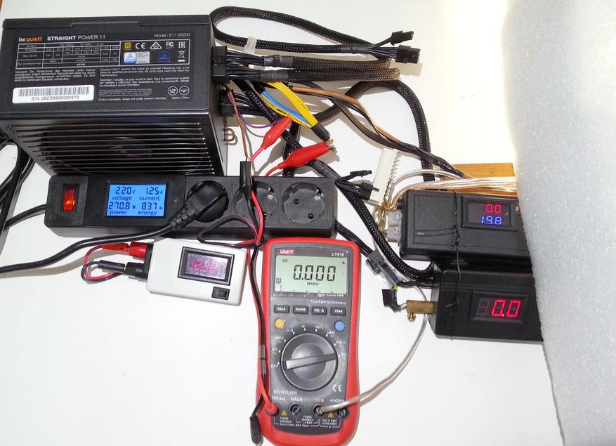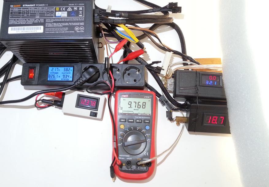 Как обычно, я не стал изобретать велосипед и в качестве нагрузки использовал лампы накаливания мощностью 55-60W, плюс примитивную электронную нагрузку. Поскольку БП Be quiet! Straight Power 11 650W имеет 4 отдельных линии со своей защитой, то пришлось немного модифицировать стенд и добавить несколько приборов. Дабы не было холиваров по точности, приведу небольшое сравнение приборов. Сравнение с источником образцового напряжения (ИОН) на базе самой точной из серии микросхемы AD584LH: