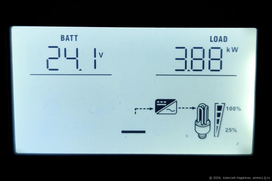 Экран инвертора показывает режимы работы и параметры (можно выбирать, что показывать). В данном случае показывается, что система работает от аккумулятора, напряжение батареи 24.1 В, мощность нагрузки 3.88 кВт.