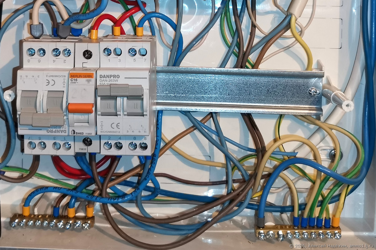 Для того, чтобы можно было отключить систему, в щитке смонтирован реверсивный рубильник, подключающий сеть дома после инвертора или до него и автомат 16A, подающий электричество на инвертор. Второй реверсивный рубильник подключает резервный бензиновый генератор.