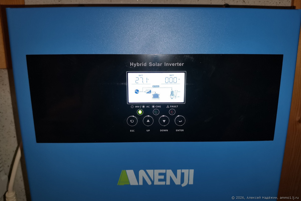 Отключение системы может понадобится если мощности в режиме питания от сети не хватает (например, при использовании сварки или мощных электроинструментов), если мешает шум инвертора, если хочется сэкономить (напомню, инвертор постоянно потребляет около 50 Вт, то есть 36 кВтч в месяц). В этом случае при отключении электричества достаточно запустить инвертор его выключателем и переключить реверсивный рубильник. Потом важно не забыть включить автомат подачи напряжения сети на инвертор, чтобы когда электричество появится, инвертор переключился на него и зарядил аккумулятор.