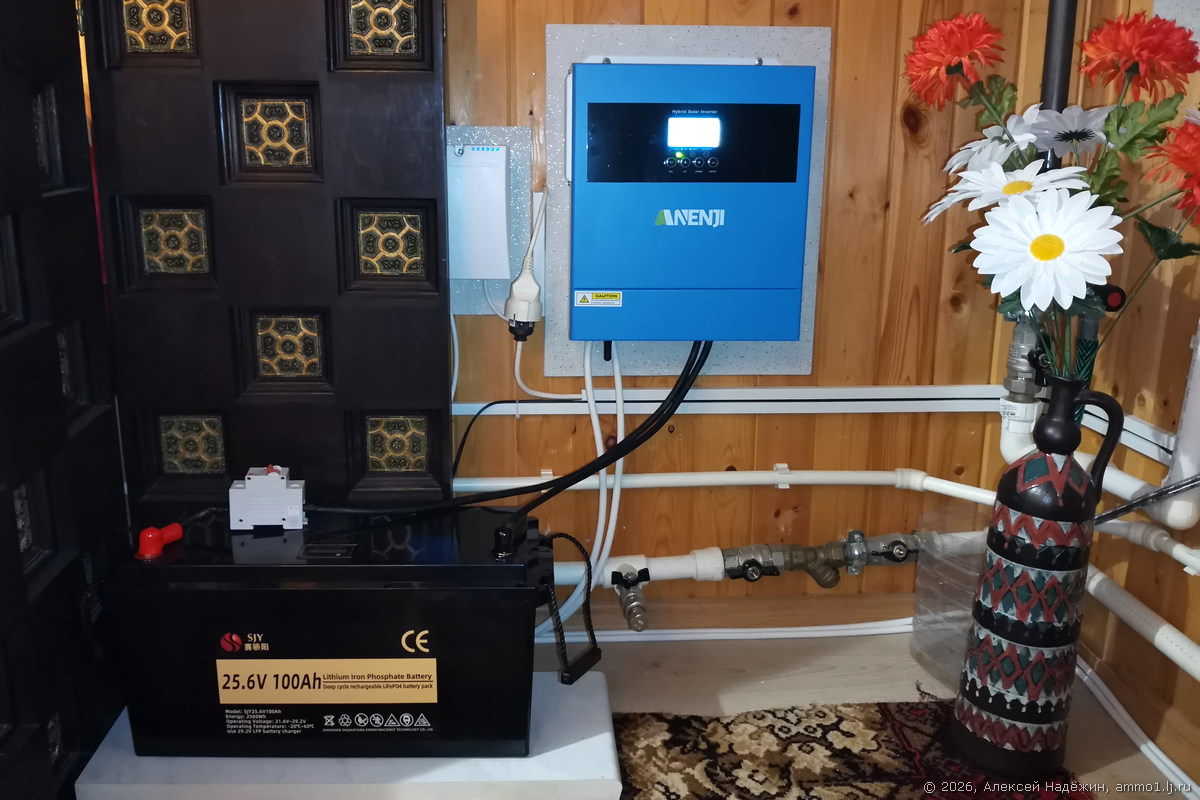 Для соседа по даче я выбрал 24-вольтовую систему, основу которой составил инвертор ANENJI 4.2kW 24V (~17500 руб) и LiFePo4 аккумулятор SJY 24V 100Ah (~32500 руб).