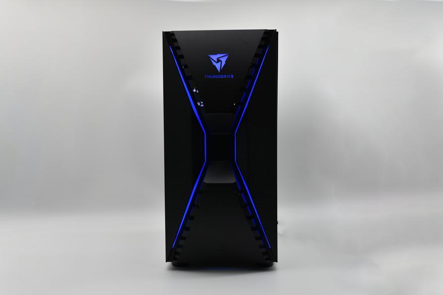 Передо мной действительно современный корпус, и его не хочется прятать под стол, благодаря оригинальному исполнению в виде необычной передней панели с подсветкой и комбинированным материалам, а также функциональным особенностям: комфортному размещению блока управления на верхней панели корпуса, встроенному вентилятору, возможностью оборудования системного блока жидкостной системой охлаждения, всеми необходимыми разъемами и просторной внутренней организации пространства, и да, в нем нет отсека 5,25’’.