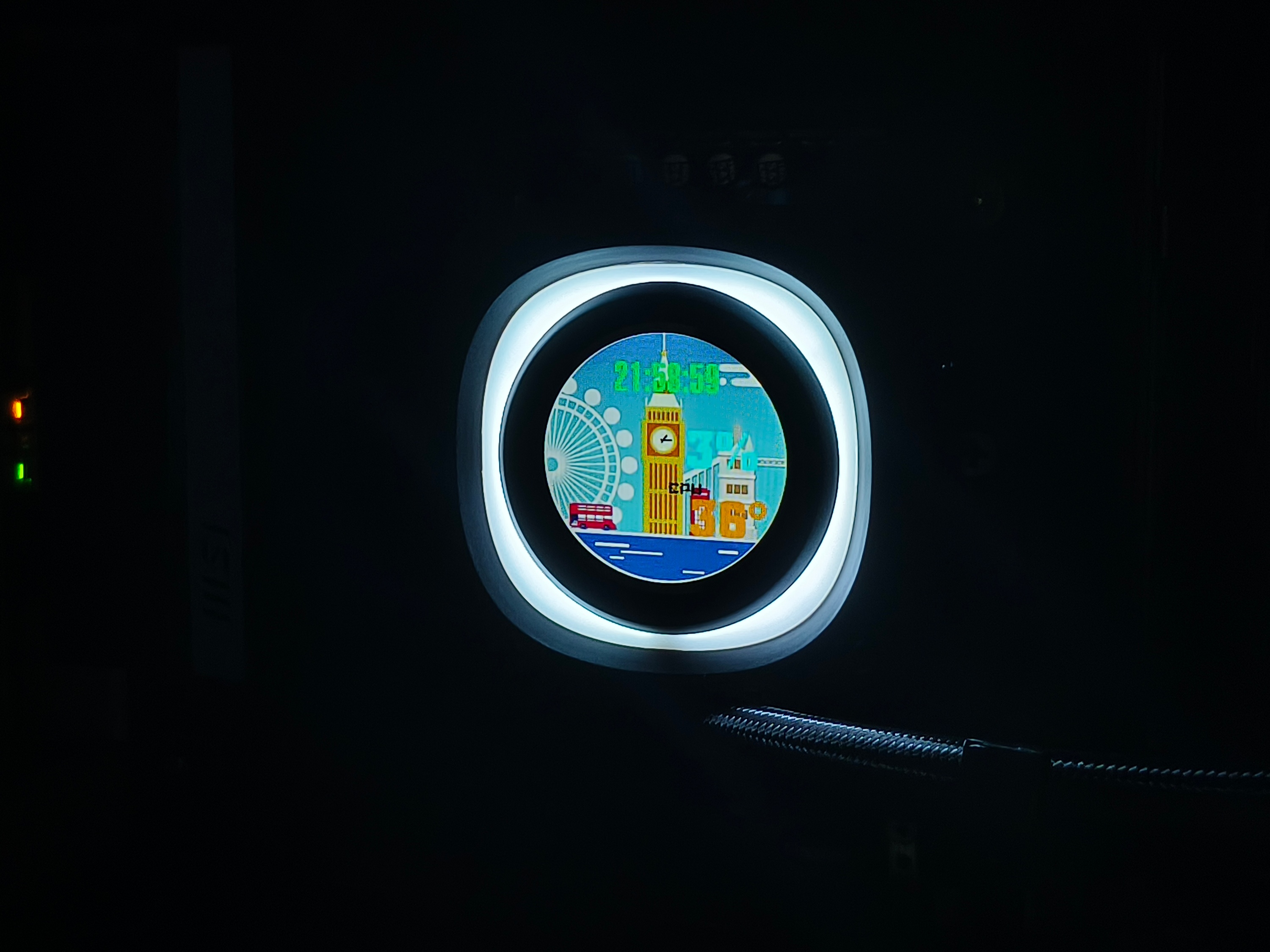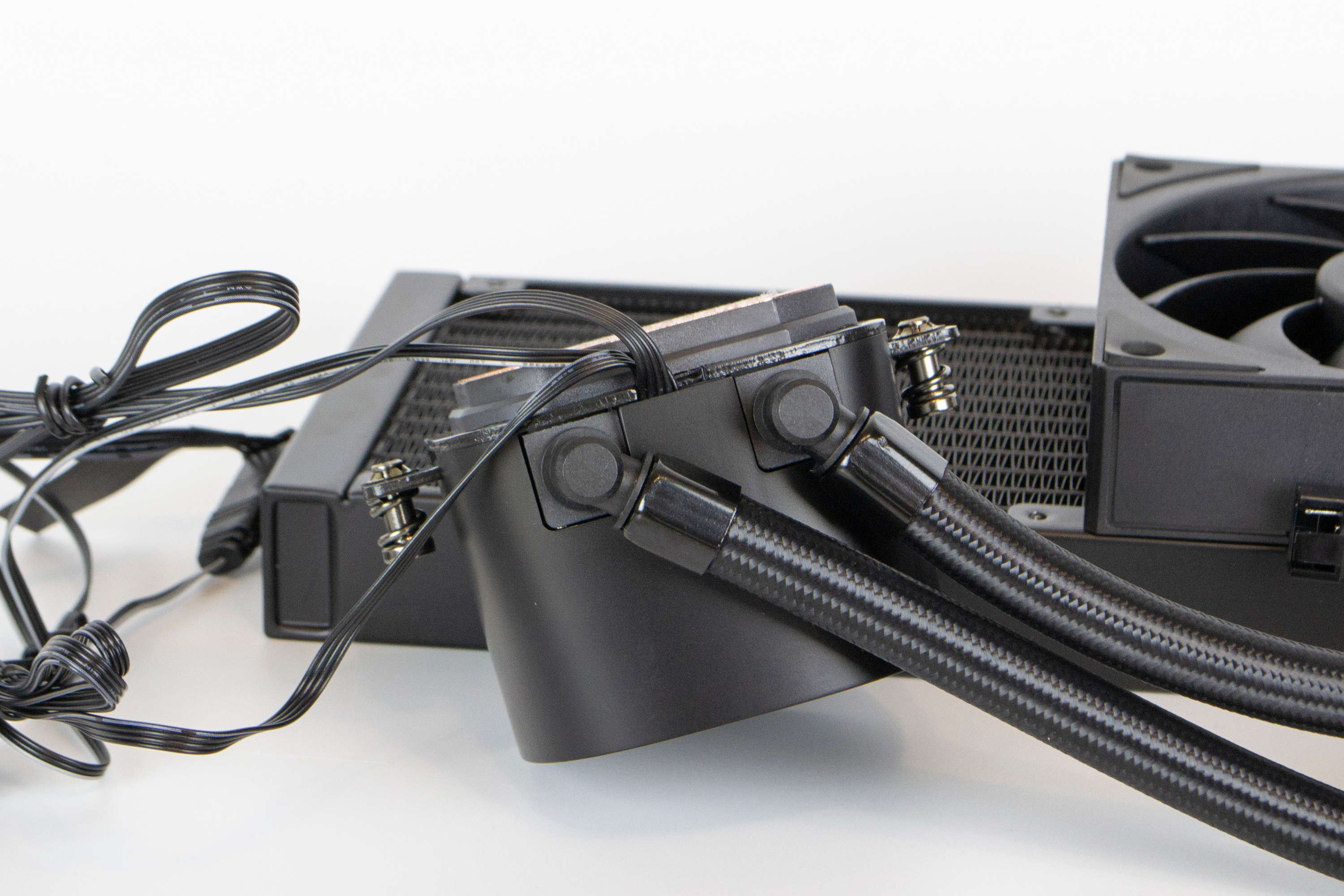 Совмещенные помпа/водоблок имеет размер 70*75 мм и 58 мм в высоту. В верхней части находится «кольцо» с ARGB подсветкой и экран диаметром 1,48″ (37 мм), закрытый пленкой. В нижней — «уши» крепления с подпружиненными гайками и угловые поворотные фитинги, которые двигаются с усилием.