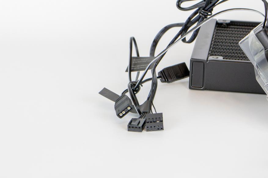 Поскольку на помпе чего только нет, и подсветка, и экран, да и помпу крутить чем-то надо, то и разъемов подключения тут также три. Длина кабелей до разъемов: по 45 см у кабелей подсветки и работы помпы, и 94 см у разъема USB.