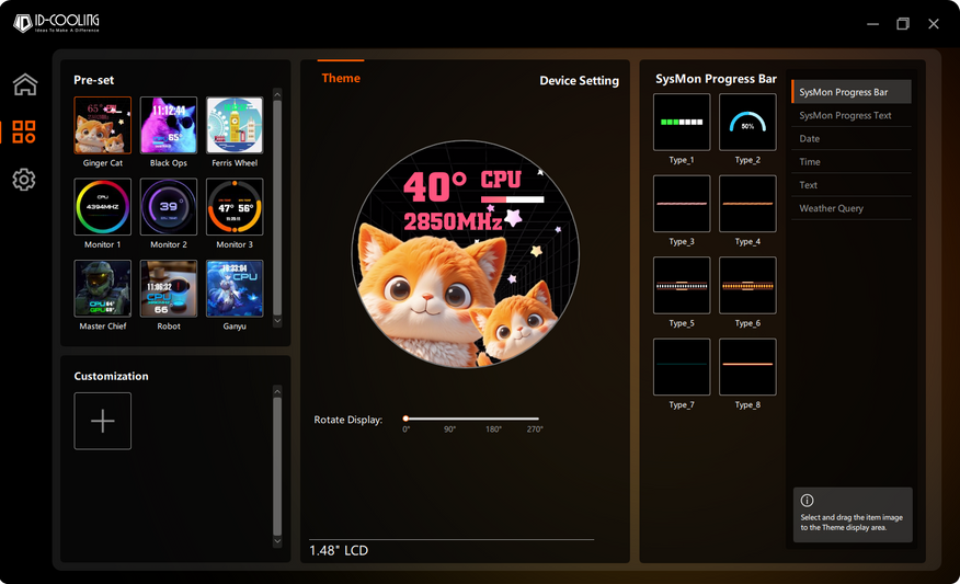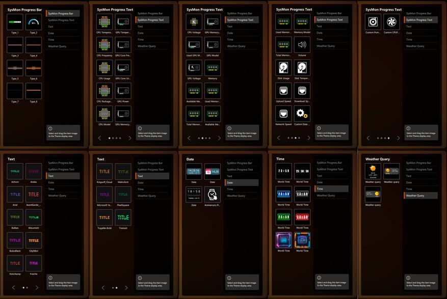 Если же вы захотите создать, что-то свое, то обратите внимание на правую часть экрана. Тут сосредоточены элементы, которые вы можете разместить на экране, кидая все что нужно на среднюю часть окна программы. Тут есть и шкалы загрузок, и вывод всевозможных показателей системы, время, дата, любой текст или даже погода. Можно настроить размер каждого элемента, шрифт, фон и т. п. Но из-за небольшого размера самого экрана, делать какое-то нагромождение информации практической пользы нет — читаемость ее будет низкая.