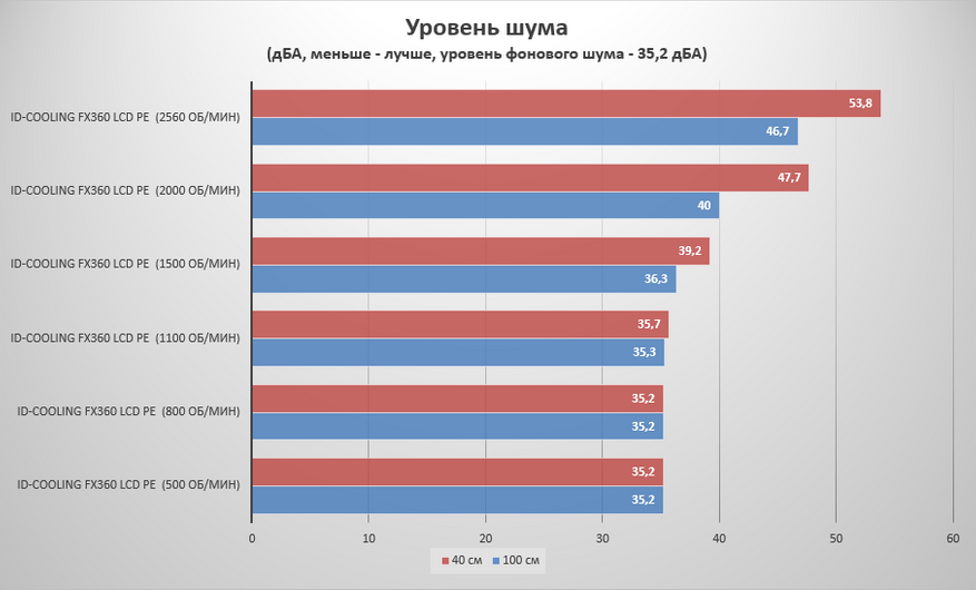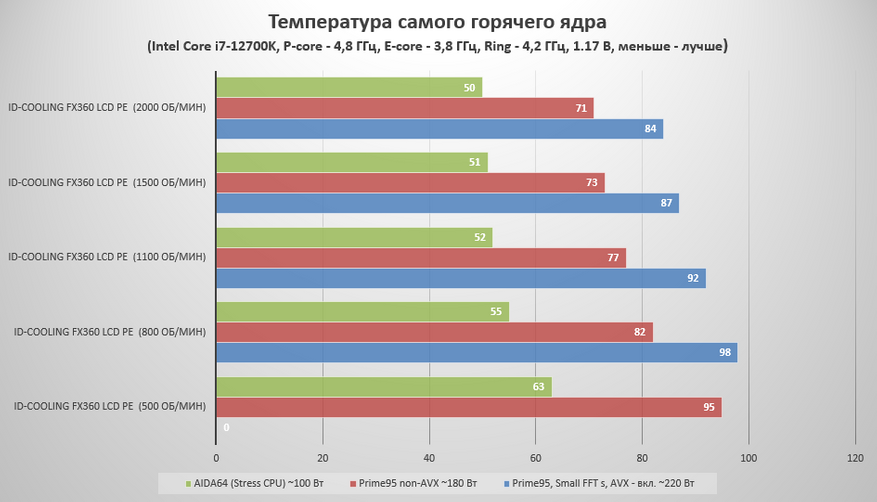 В плане производительности охлаждения, СЖО показала себя очень достойно. Для интеловских процессоров до 180 Вт, использовать скорости выше 800 об/мин, видится не имеющим смысла. В повседневных задачах, если вы часами не компилируете шейдеры в UT5 проектах или гоняете стресс-тесты, то этого хватит практически для любого ЦП.