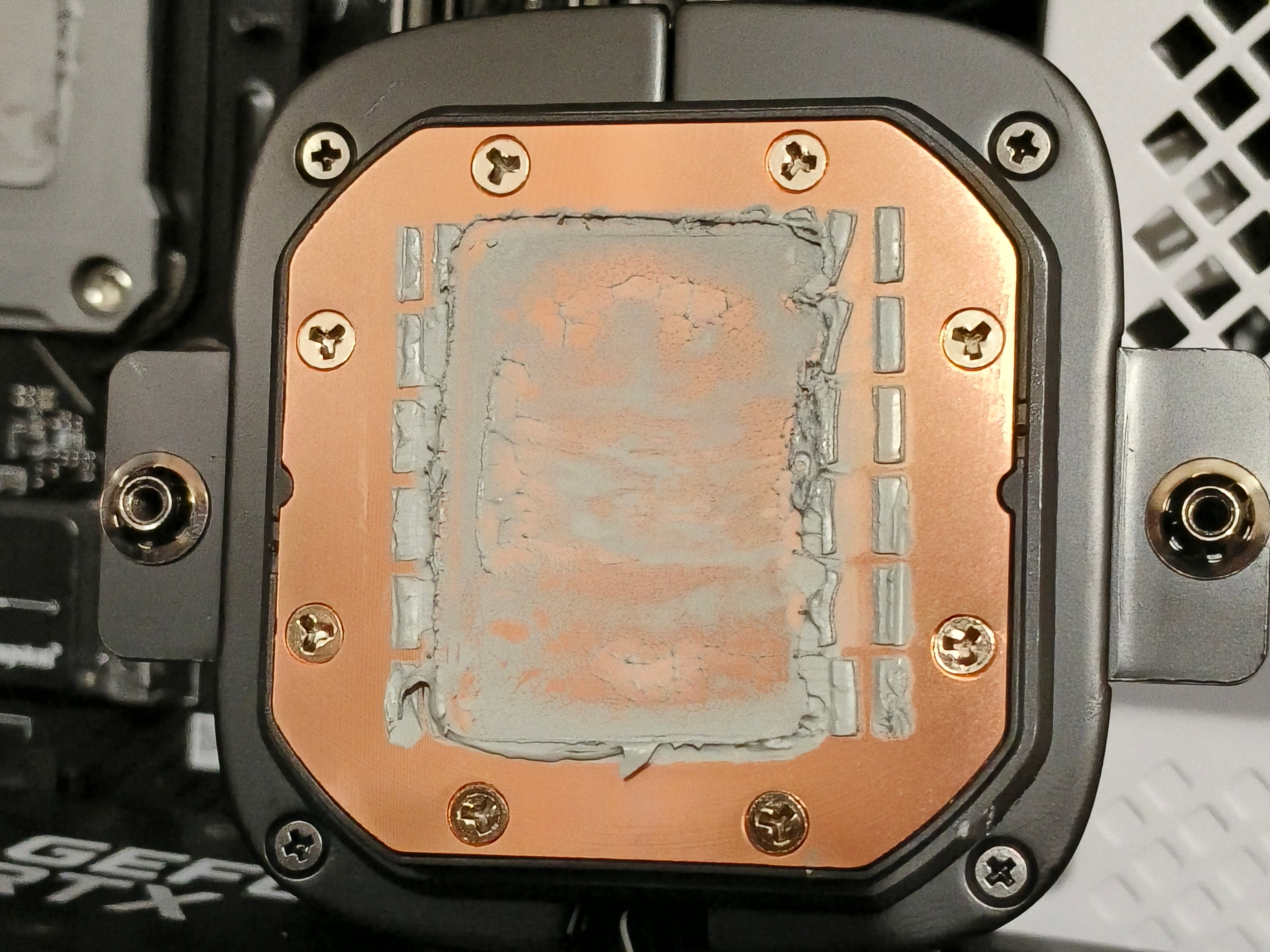 Из коробки, нижняя часть закрыта пластиковым поддоном. А все потому, что несмотря на наличие в комплекте термопасты, на подошву уже нанесена термопаста. Видимо это новая практика для всех новых моделей. Сама подошва медная, размером 54*53 мм.