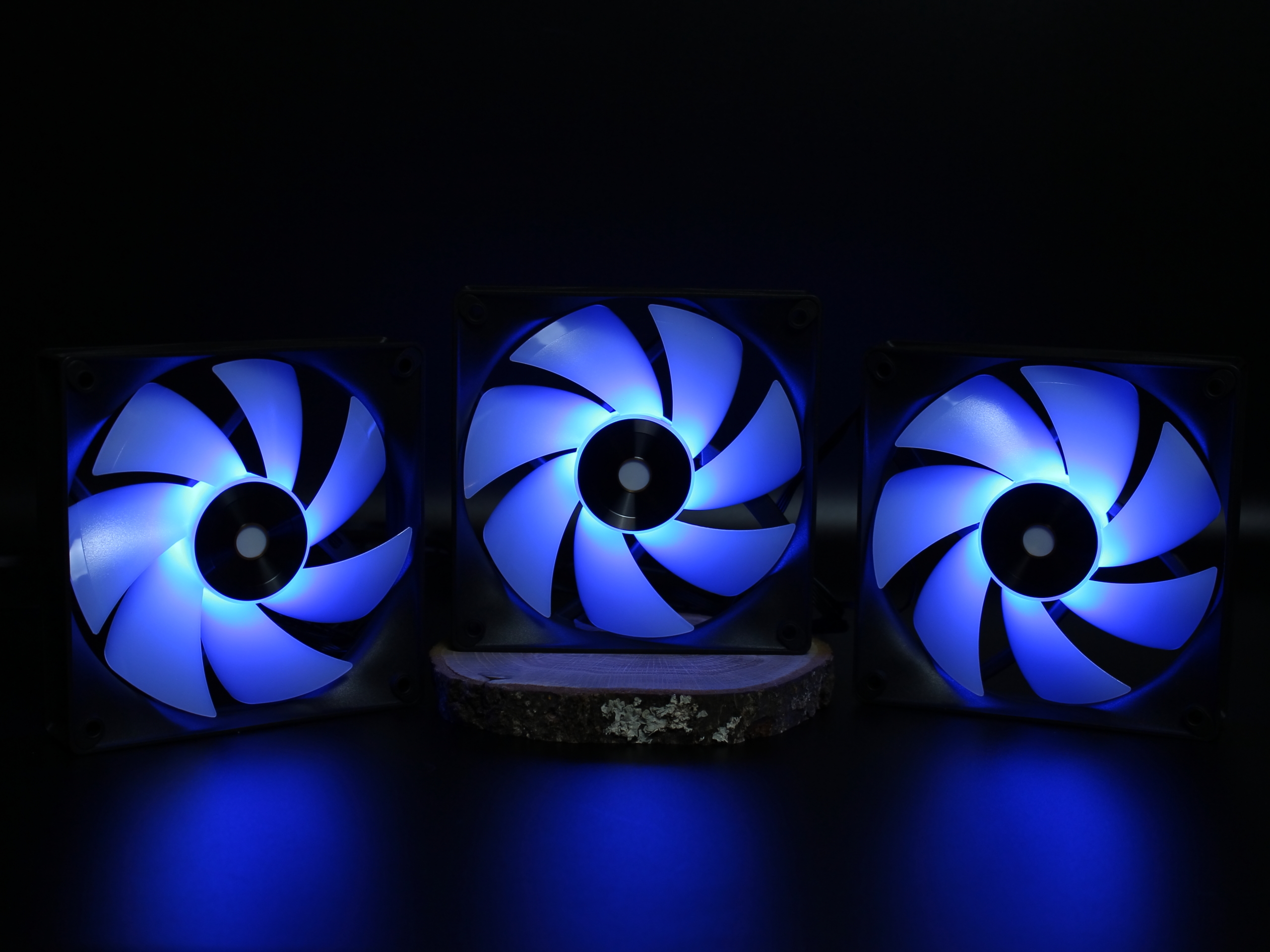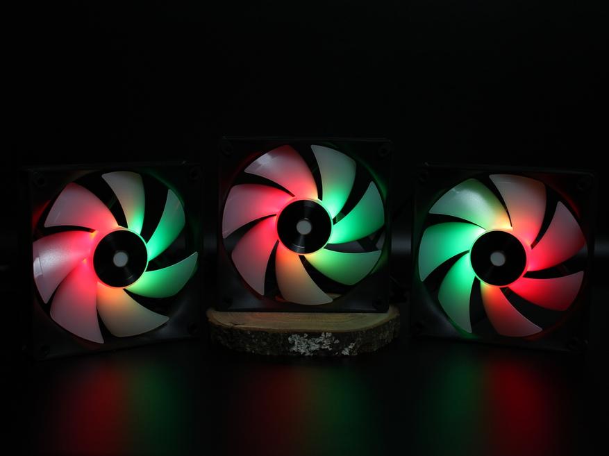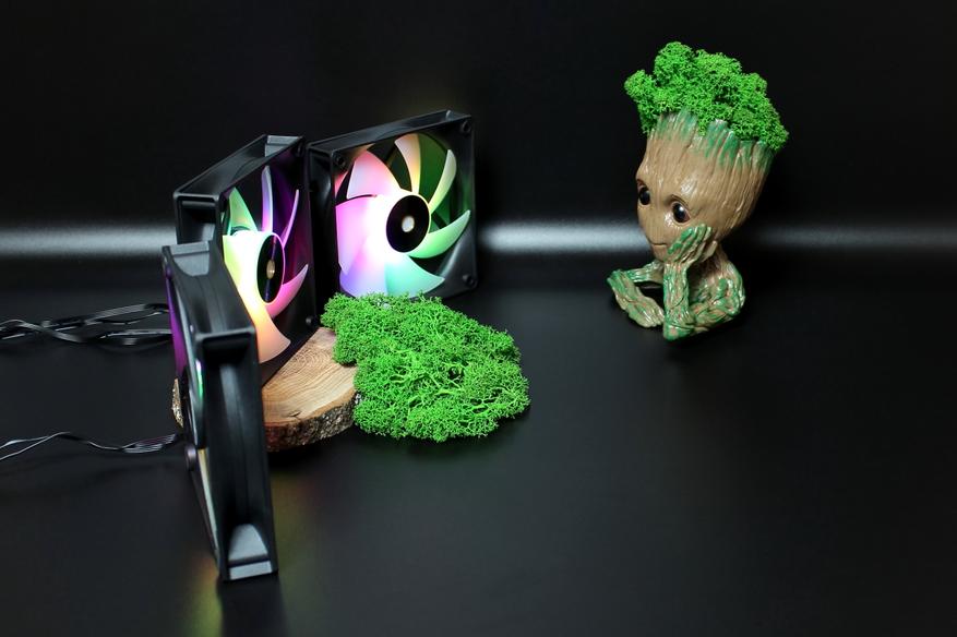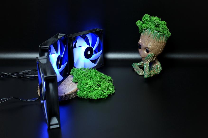 При первом включении вентиляторов на стенде был поднят просто воздушный вихрь. Все находящиеся рядом предметы разлетелись по сторонам. Поэтому тут же их выключил и для фотографирования оставил работающей только подсветку. Свою мощь они классно продемонстрировали.