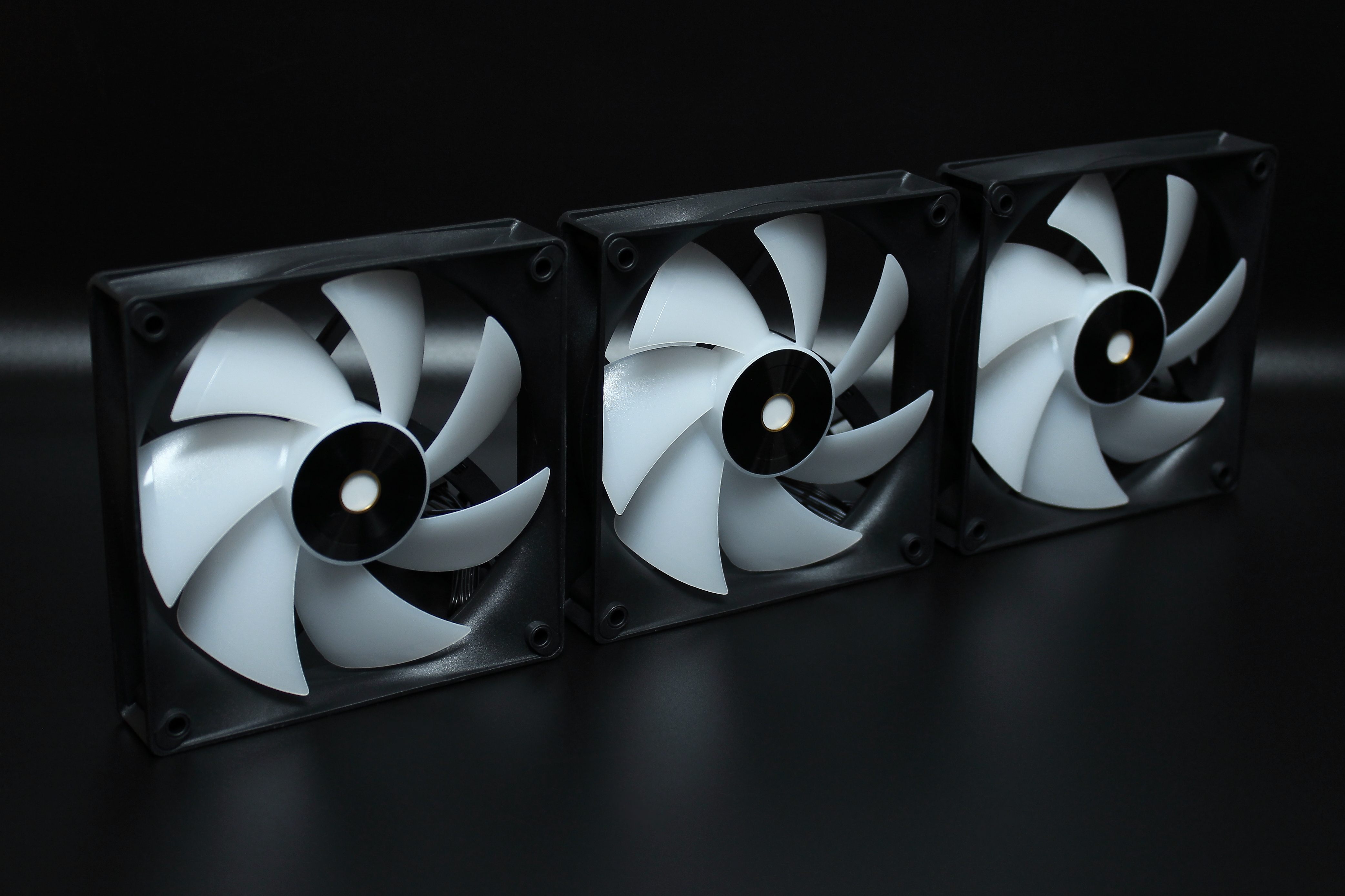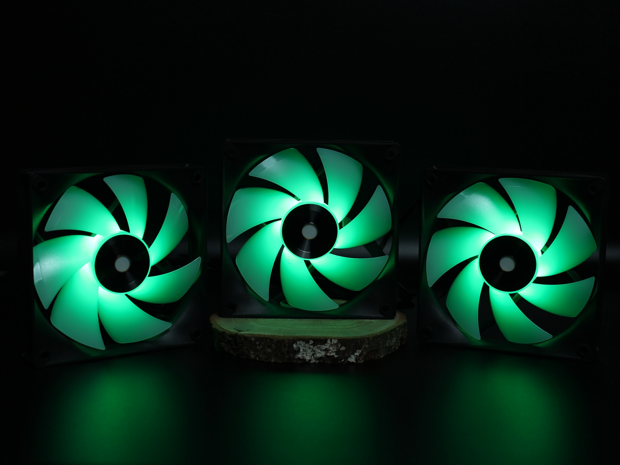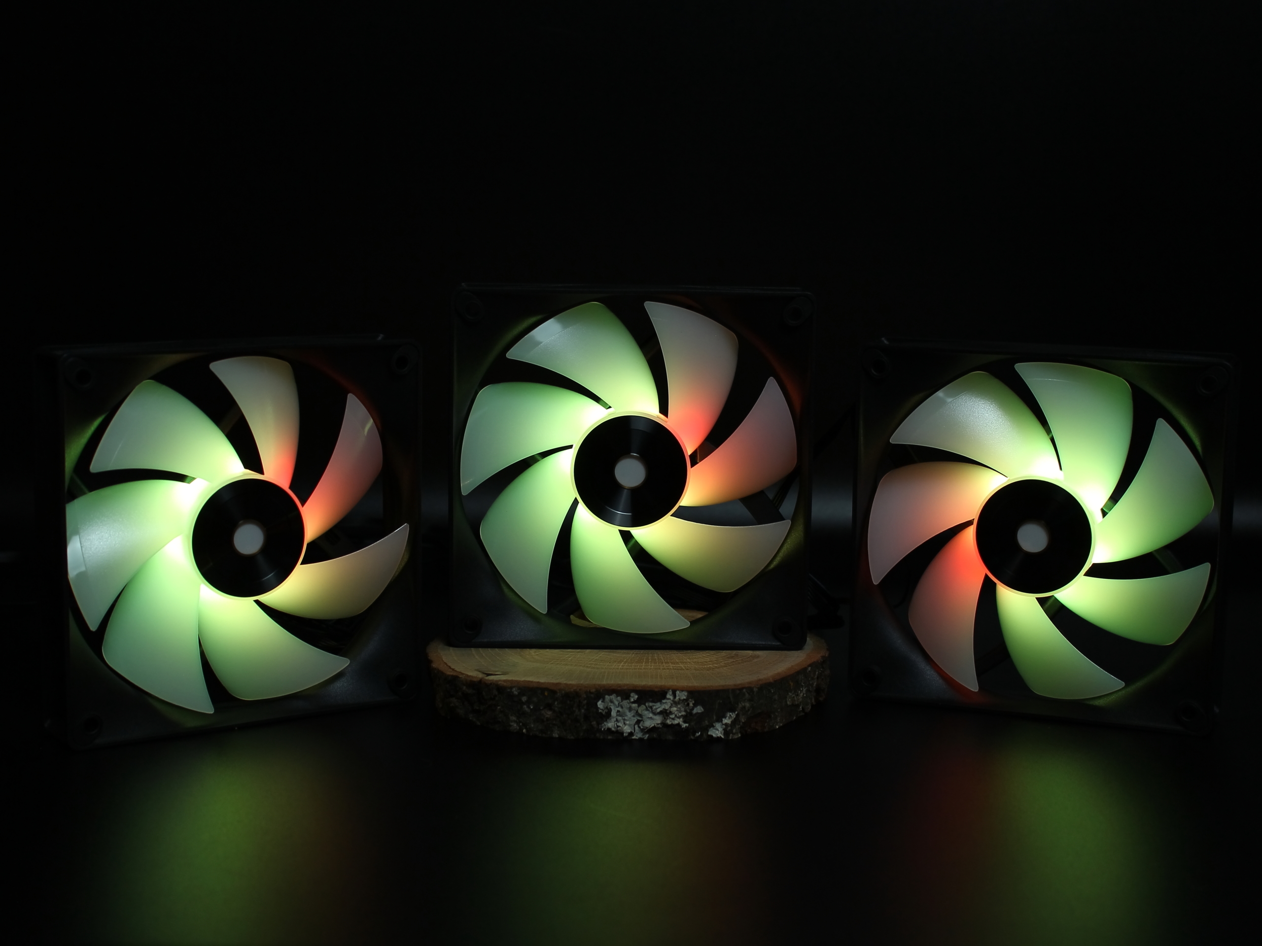 При первом включении вентиляторов на стенде был поднят просто воздушный вихрь. Все находящиеся рядом предметы разлетелись по сторонам. Поэтому тут же их выключил и для фотографирования оставил работающей только подсветку. Свою мощь они классно продемонстрировали.