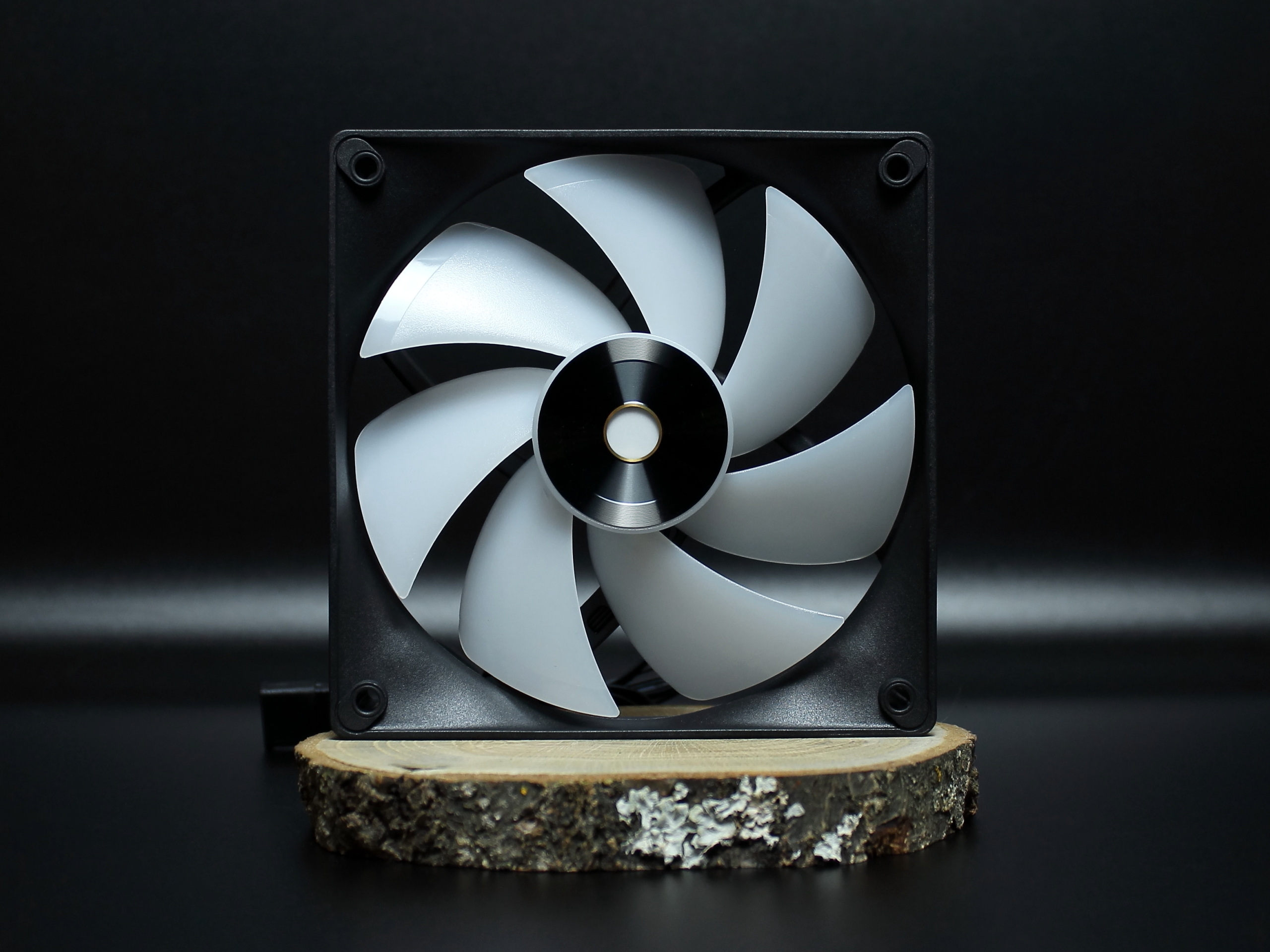 На вооружении у крыльчатки находится семь широких лопастей. Лепестки с изгибом, что должно способствовать снижению уровня шума. Красиво оформлена центральная часть. «Золотое» колечко прекрасно подчеркивает общую картину.