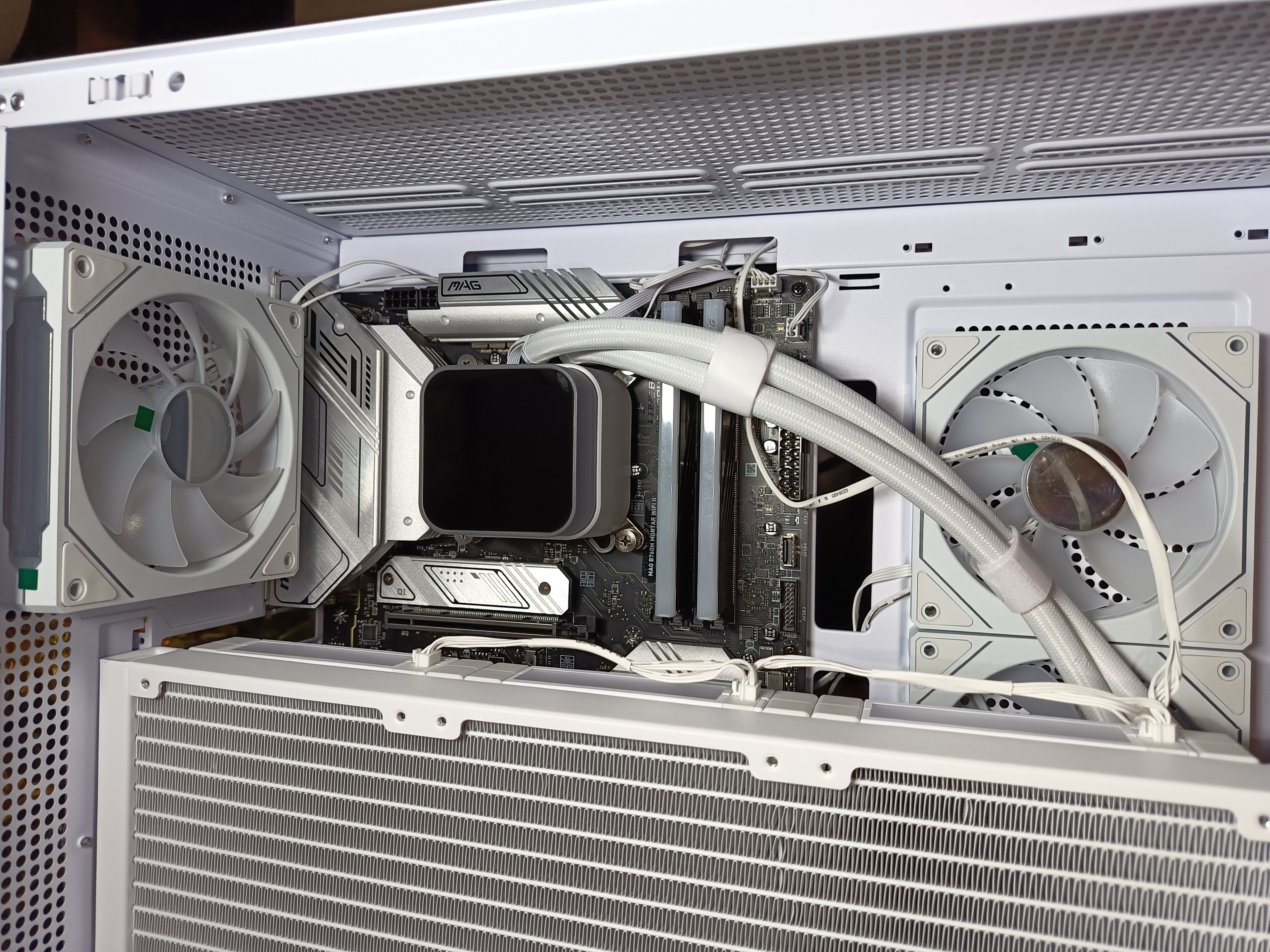 На сборку ушло около 1,5 часов. Основной нюанс: перед установкой СЖО на верхнюю панель обязательно подключите все кабели к материнской плате — доступ к разъёмам потом будет сильно затруднён. СЖО формата 360 мм можно устанавливать сверху, снизу или на лицевую панель с помощью комплектных полозьев, но только сюда подойдет СЖО 240 мм. Также возможна установка двух 120-мм или двух 140-мм вентиляторов.
