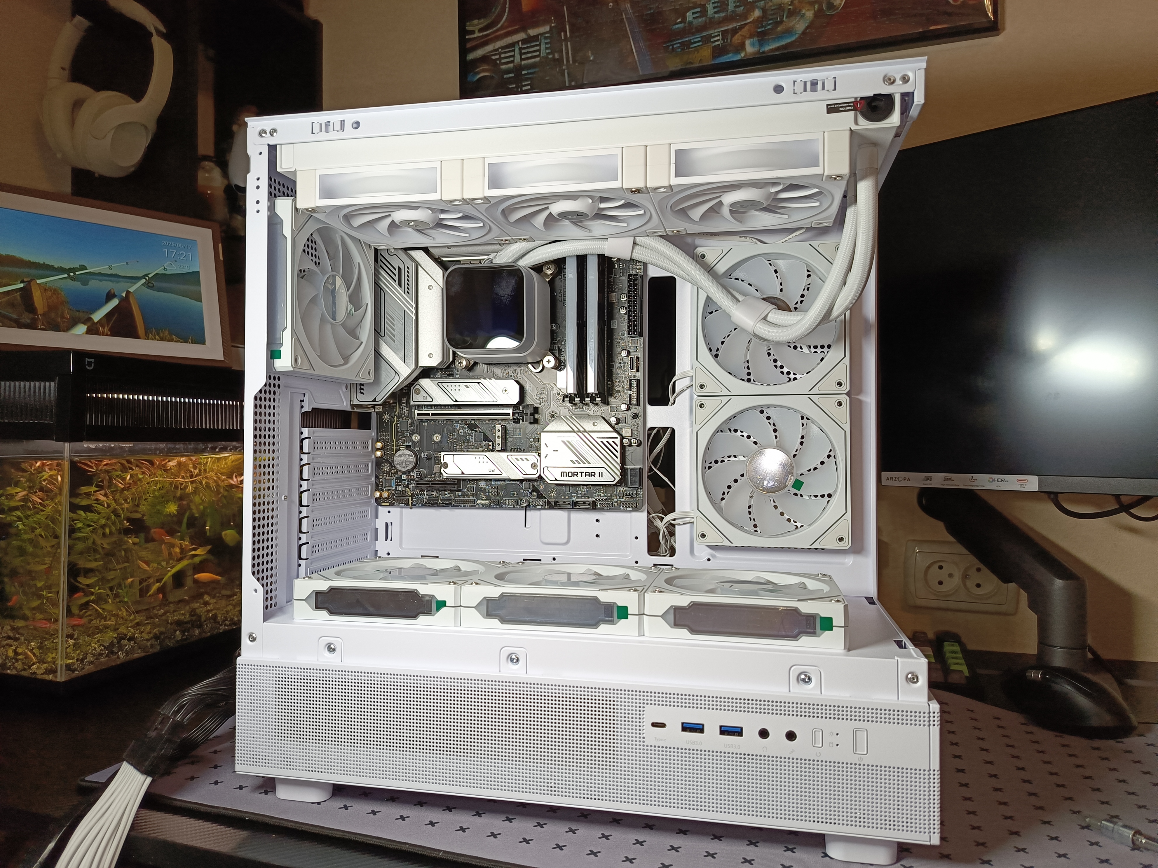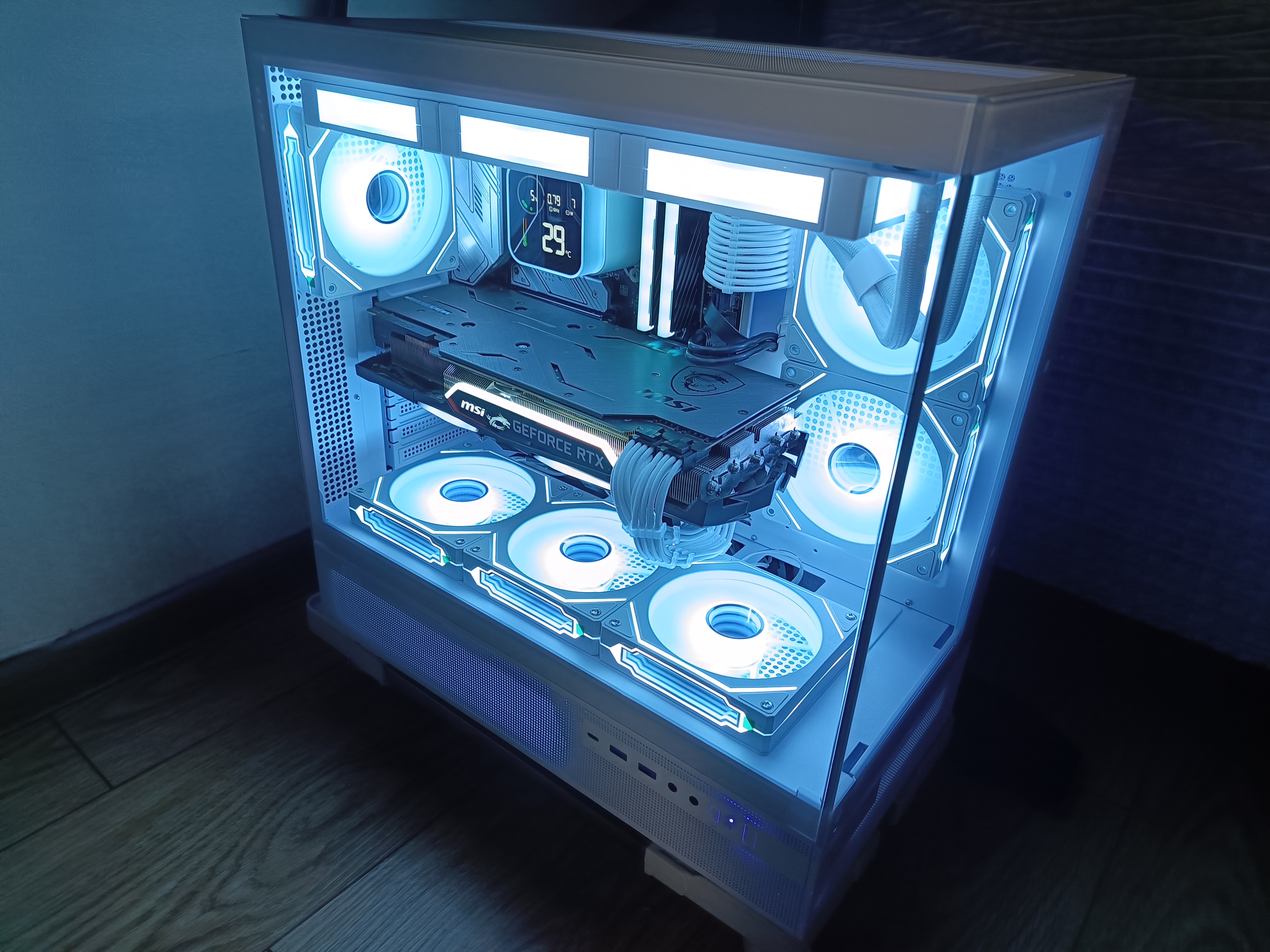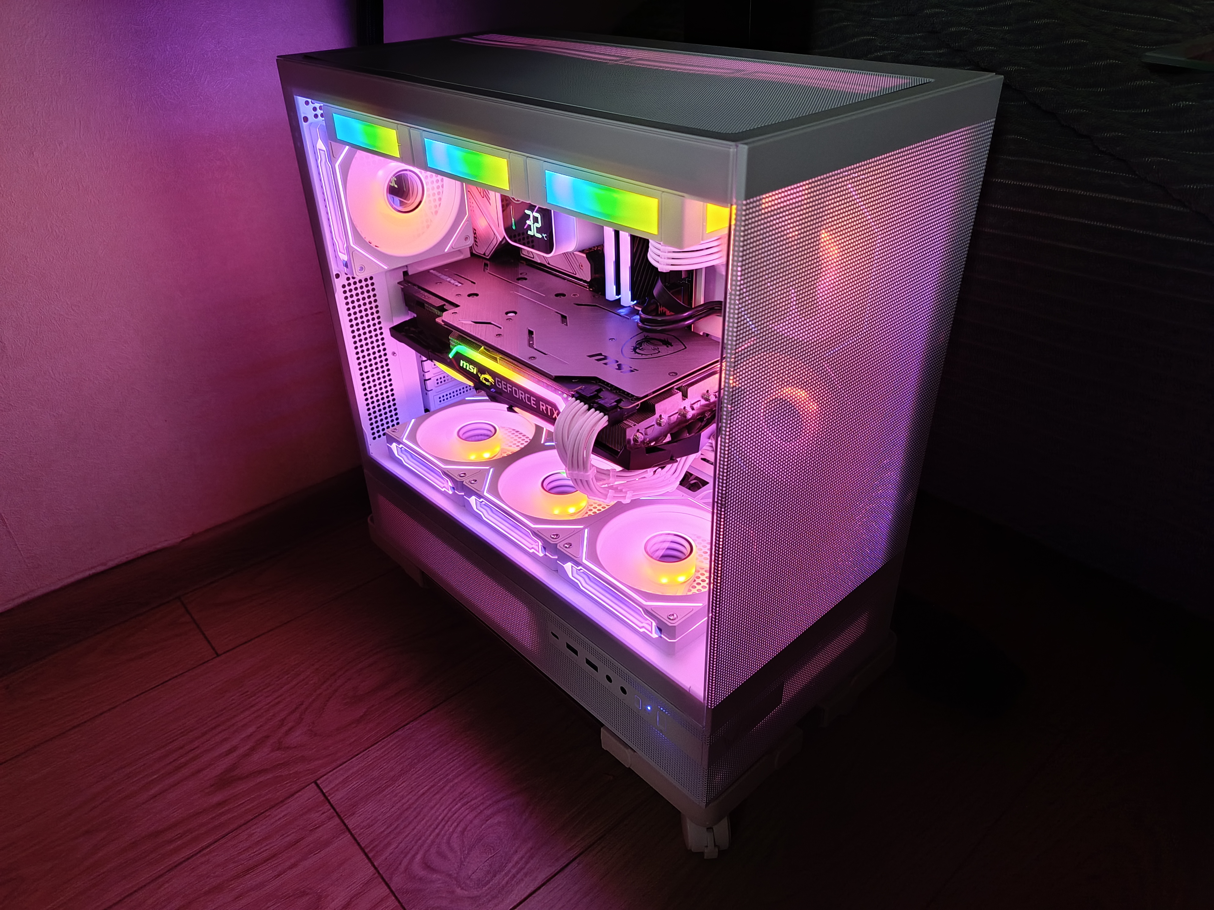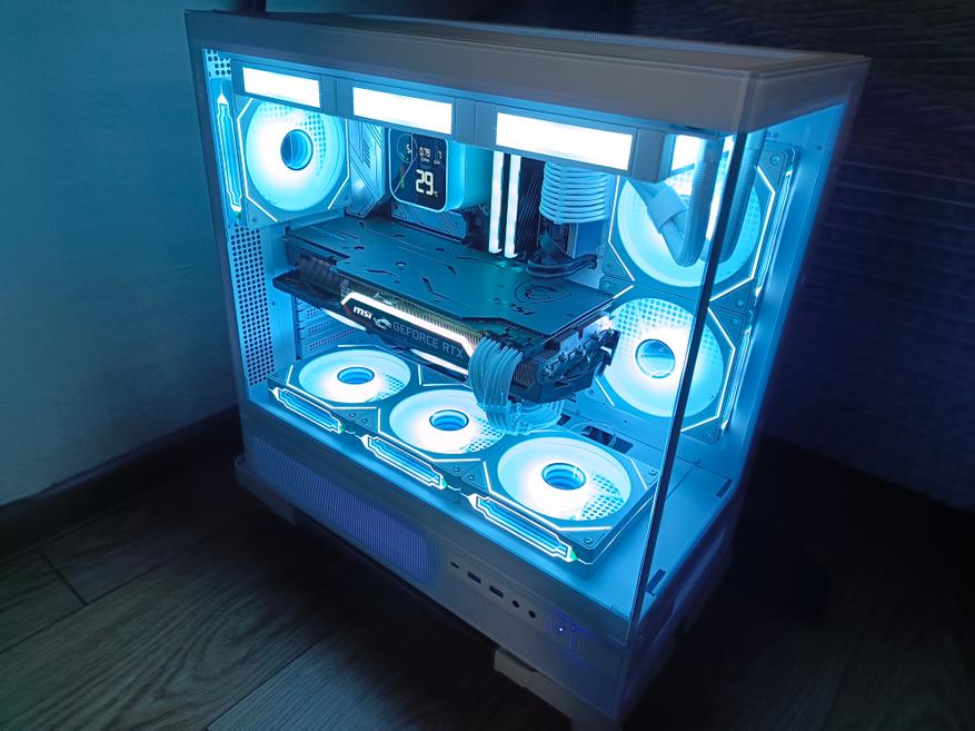 В собранном виде корпус выглядит эффектно и современно. Он может использоваться как декоративная подсветка в комнате, особенно если активировать RGB-вентиляторы. При желании можно оставить лицевую панель открытой или установить вместо стекла комплектную сетку, за которой также можно закрепить вентиляторы. Лично я предпочитаю вариант со стеклом — с учётом шести встроенных вентиляторов и трёх от СЖО, этого вполне достаточно для эффективного охлаждения при низком уровне шума.