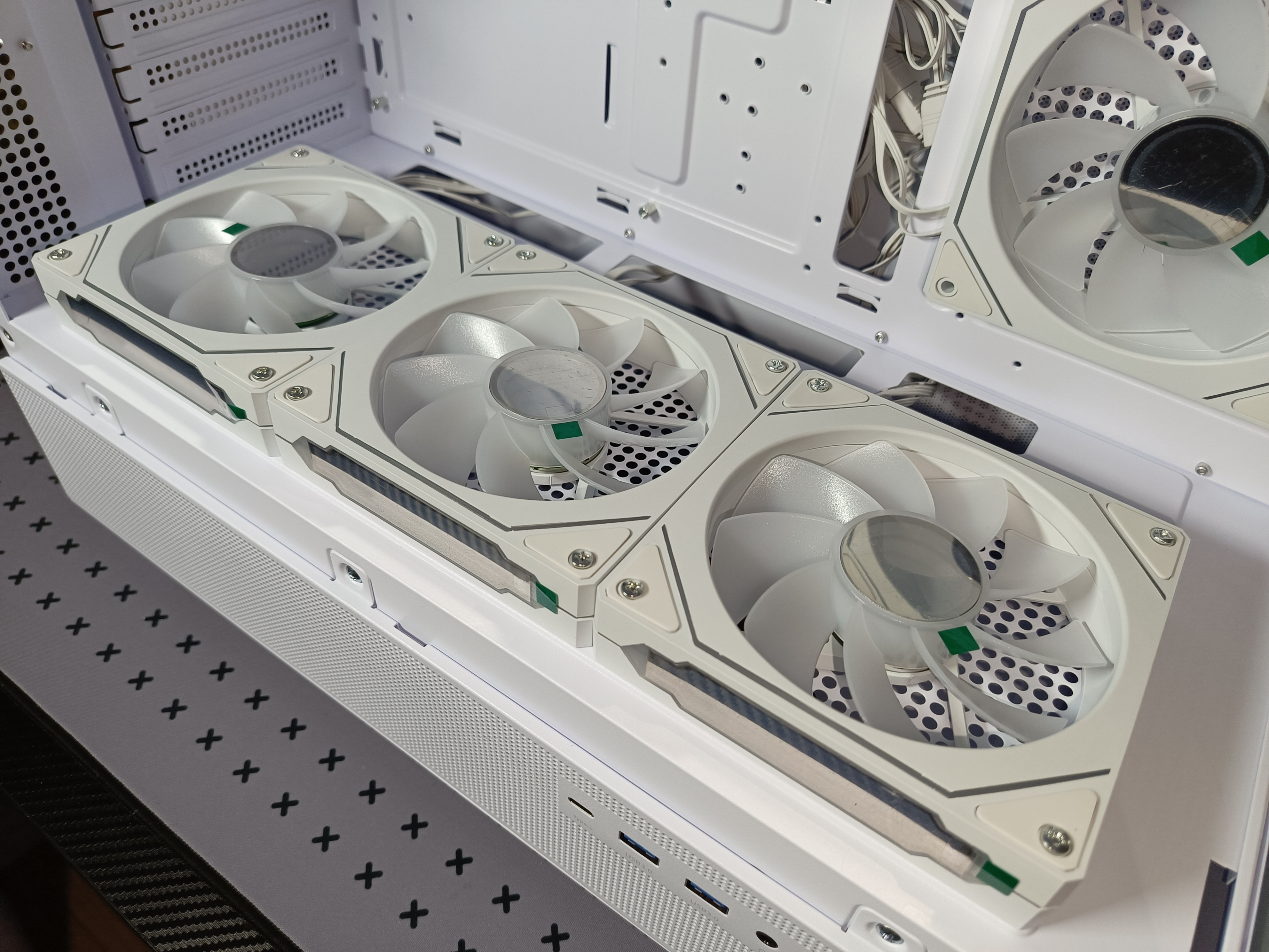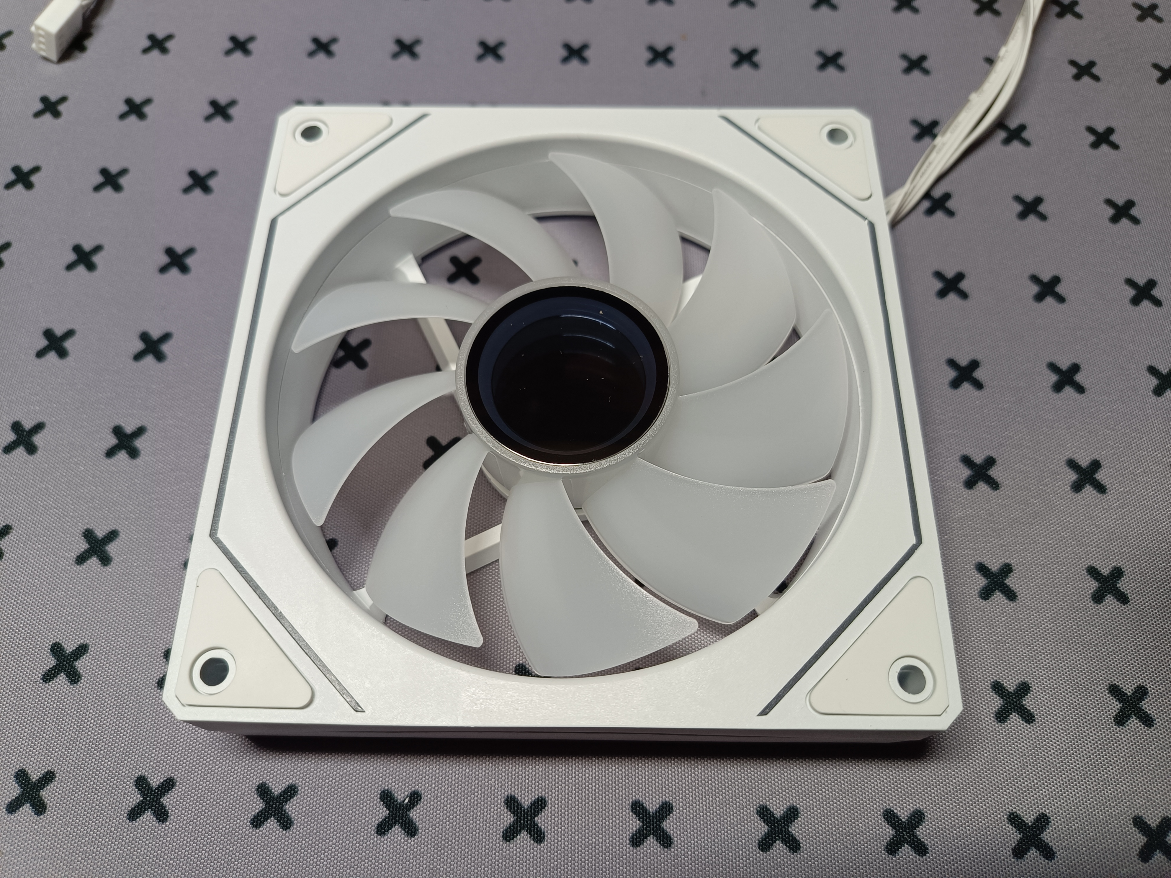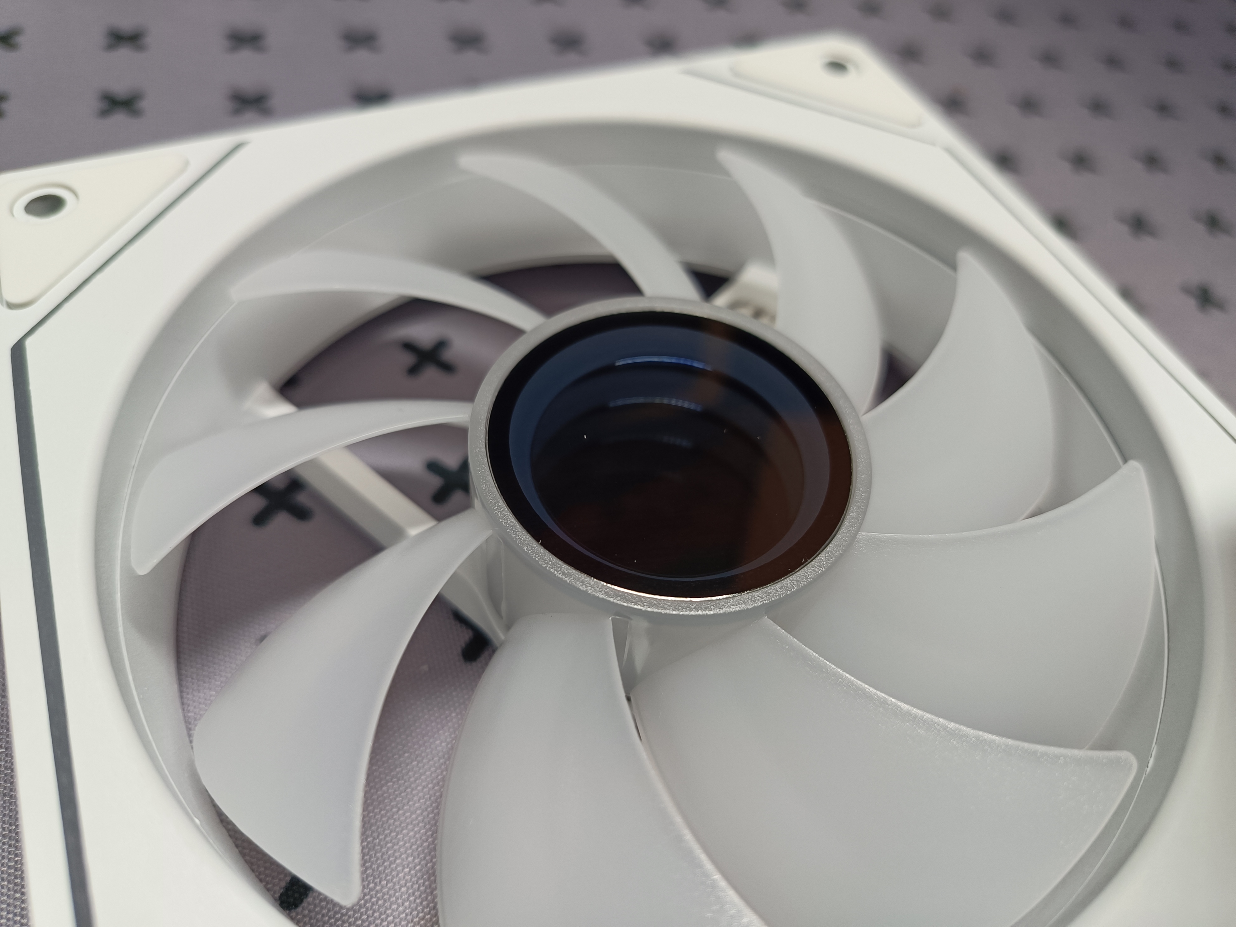 Комплектные вентиляторы имеют двухконтурную подсветку: боковую (по двум сторонам) и центральную — с кольцом подсветки, которое красиво подсвечивает лопасти и зеркальную сердцевину. Подключение производится через 4-pin разъём, подсветка — через ARGB 5V. Вентиляторы оснащены гидродинамическими подшипниками и девятью лопастями.