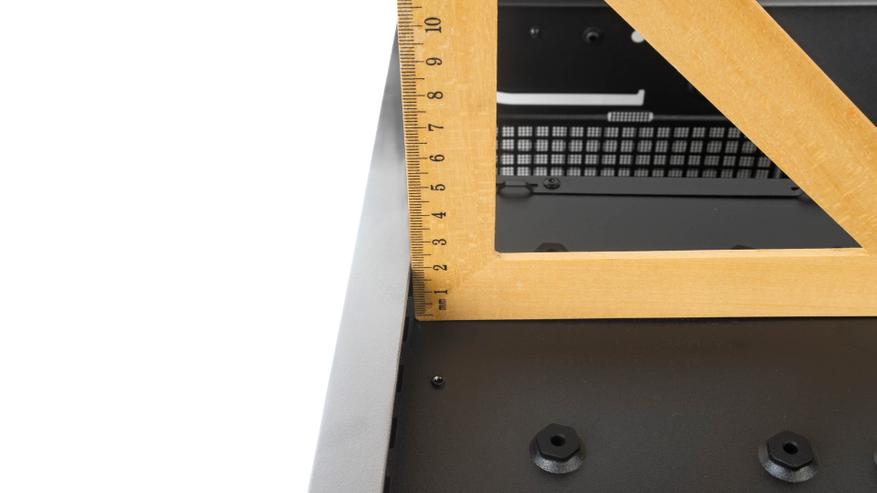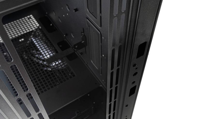 За правой боковой панелью имеется пространство для укладки кабелей, размером в 20-мм. В верхней и средней частях располагаются пять технических отверстия под укладку кабелей: три вертикальных и два горизонтальных. Нижние отверстия имеют прорезиненные вставки. По всей металлической панели равномерно расположены крепления под кабельные стяжки.