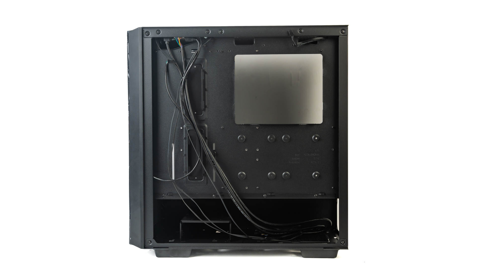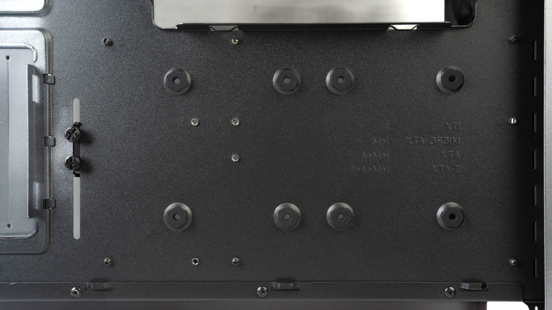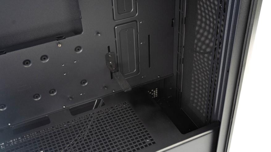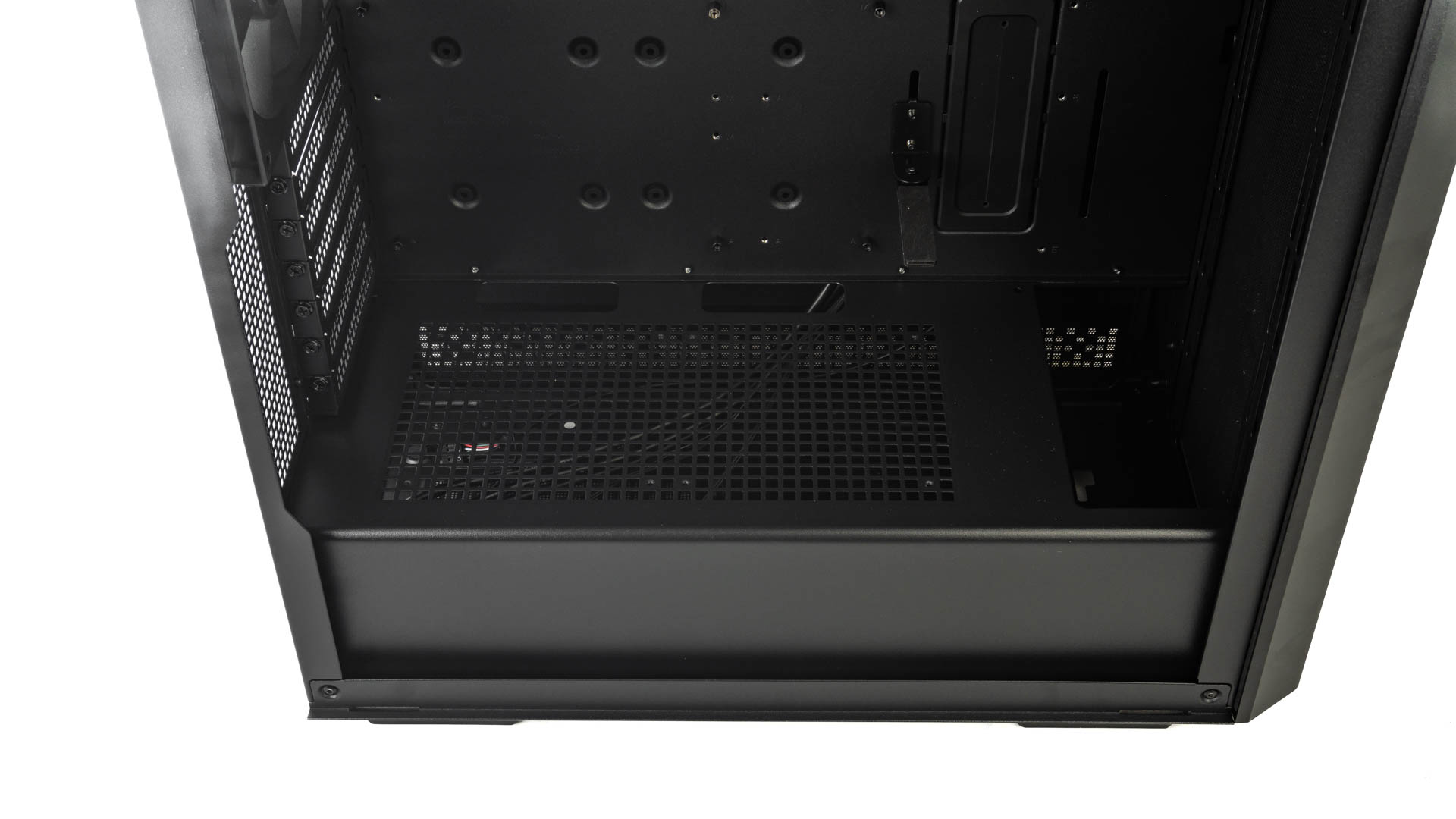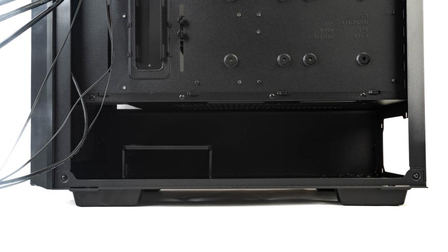 В нижней части расположен металлический кожух с вентилируемой частью, подразумевающей расположение двух 120 мм вентиляторов на длинных винтах, также рядом находятся два технических отверстия для кабель менеджмента.