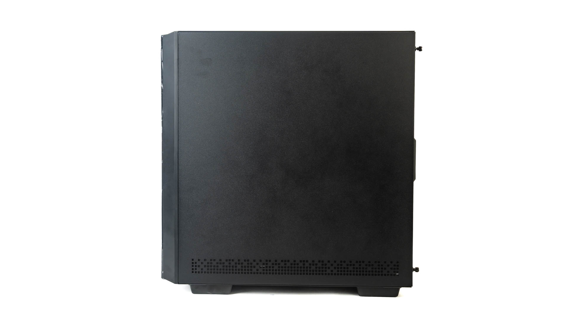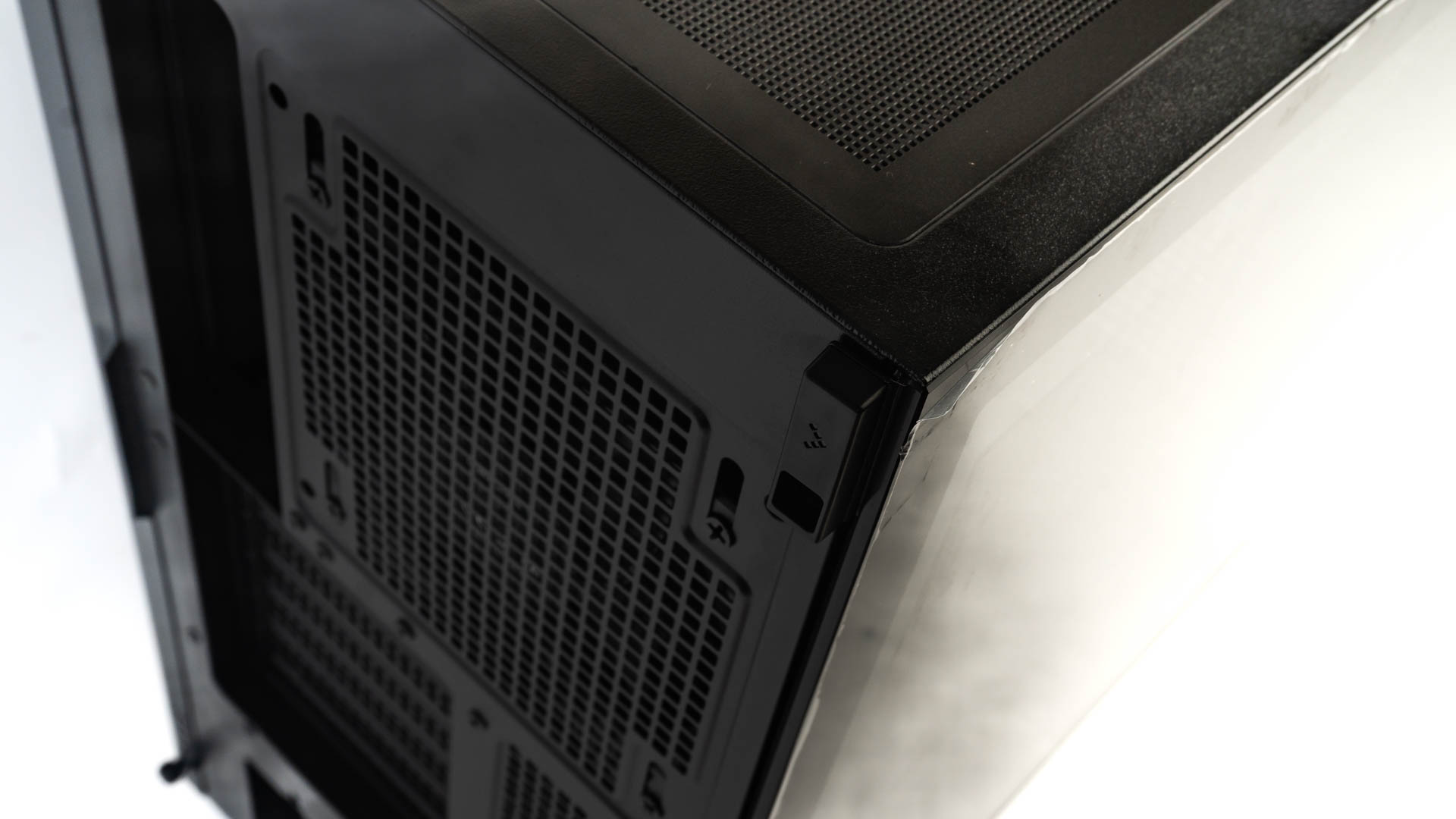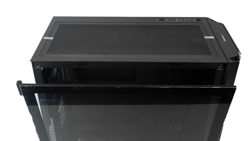 Левая часть корпуса представляет собой тонированное закалённое стекло толщиной в 4 мм. Панель имеет откидной тип, реализованный петлями снизу, магнитами сверху и защёлкой на задней части корпуса, позволяющей зафиксировать её винтом. В купе с магнитами вся эта конструкция даёт уверенность того, что стекло не сможет произвольно открыться и разбиться в процессе демонтажа или транспортировки. На обратной стороне стеклянной панели расположены крепления и мягкий виброгосящий материал.