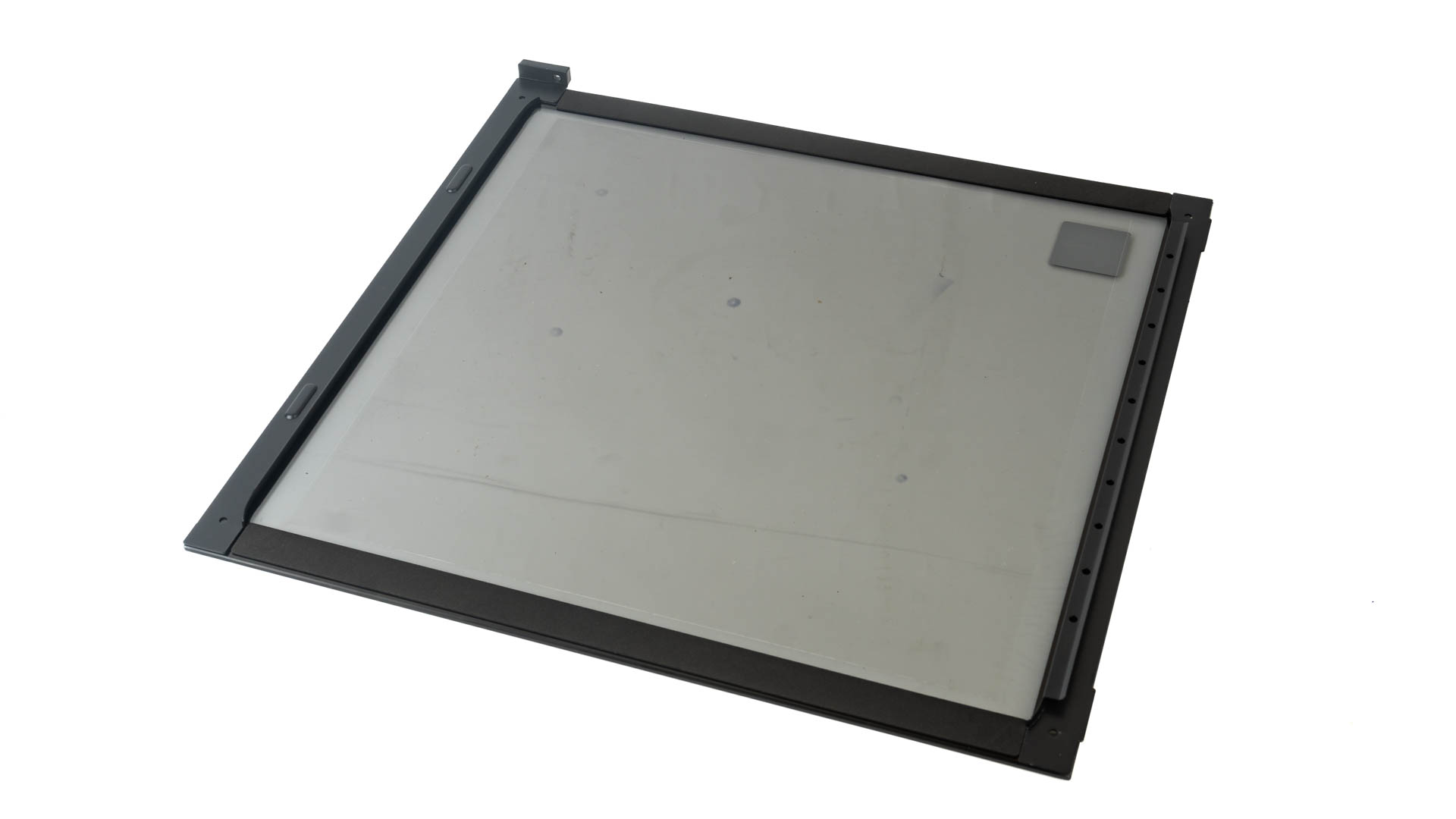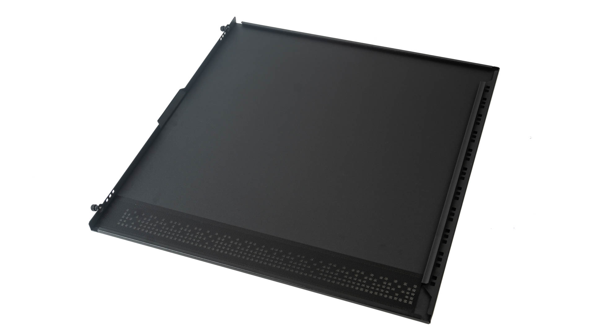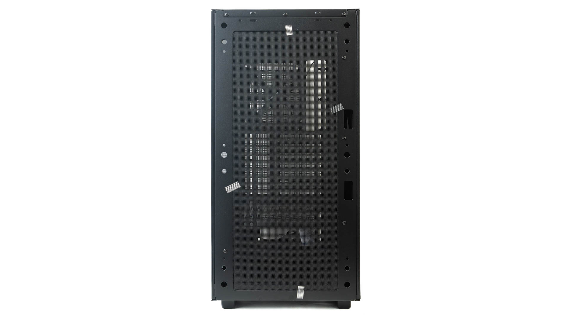 Левая часть корпуса представляет собой тонированное закалённое стекло толщиной в 4 мм. Панель имеет откидной тип, реализованный петлями снизу, магнитами сверху и защёлкой на задней части корпуса, позволяющей зафиксировать её винтом. В купе с магнитами вся эта конструкция даёт уверенность того, что стекло не сможет произвольно открыться и разбиться в процессе демонтажа или транспортировки. На обратной стороне стеклянной панели расположены крепления и мягкий виброгосящий материал.