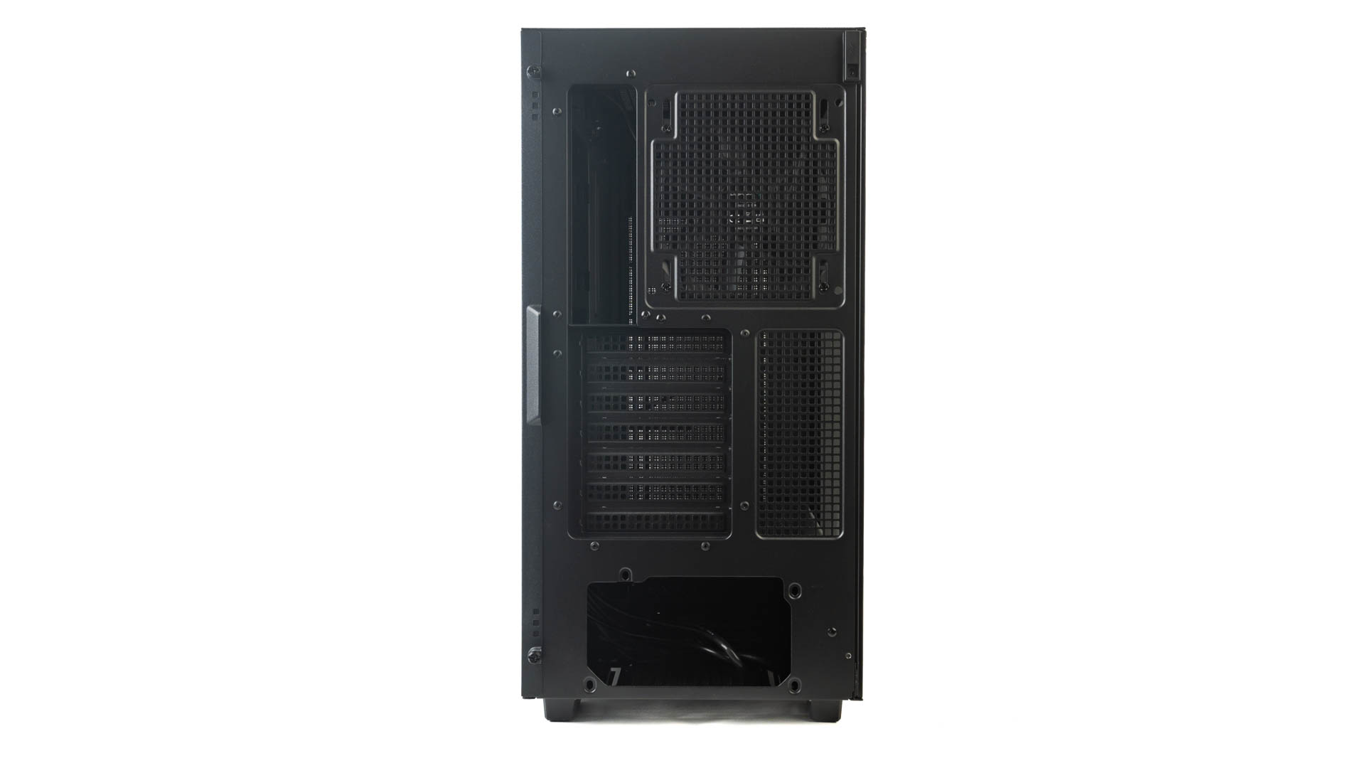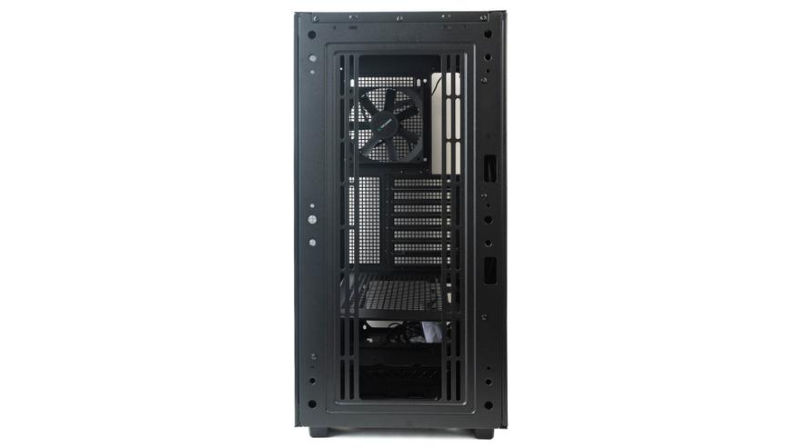 Задняя панель выполнена в стандартном для данного типа корпусов виде. В верхней части располагается разъём под порты ввода и вывода материнской платы, правее расположено посадочное место для крепления вентилятора. В комплекте с корпусом Deepcool CH510 Mesh Digital уже стоит фирменный 120-мм вентилятор, но возможна установка и 140-мм варианта. Ниже располагаются 7 x PCI-E слотов, закрытые многоразовыми заглушками. Правее располагается ещё одна вентилируемая зона с крупной решёткой. В самом низу размещено четыре крепления для блока питания, подразумевающие его установку только в одном положении - вентилятором вниз.