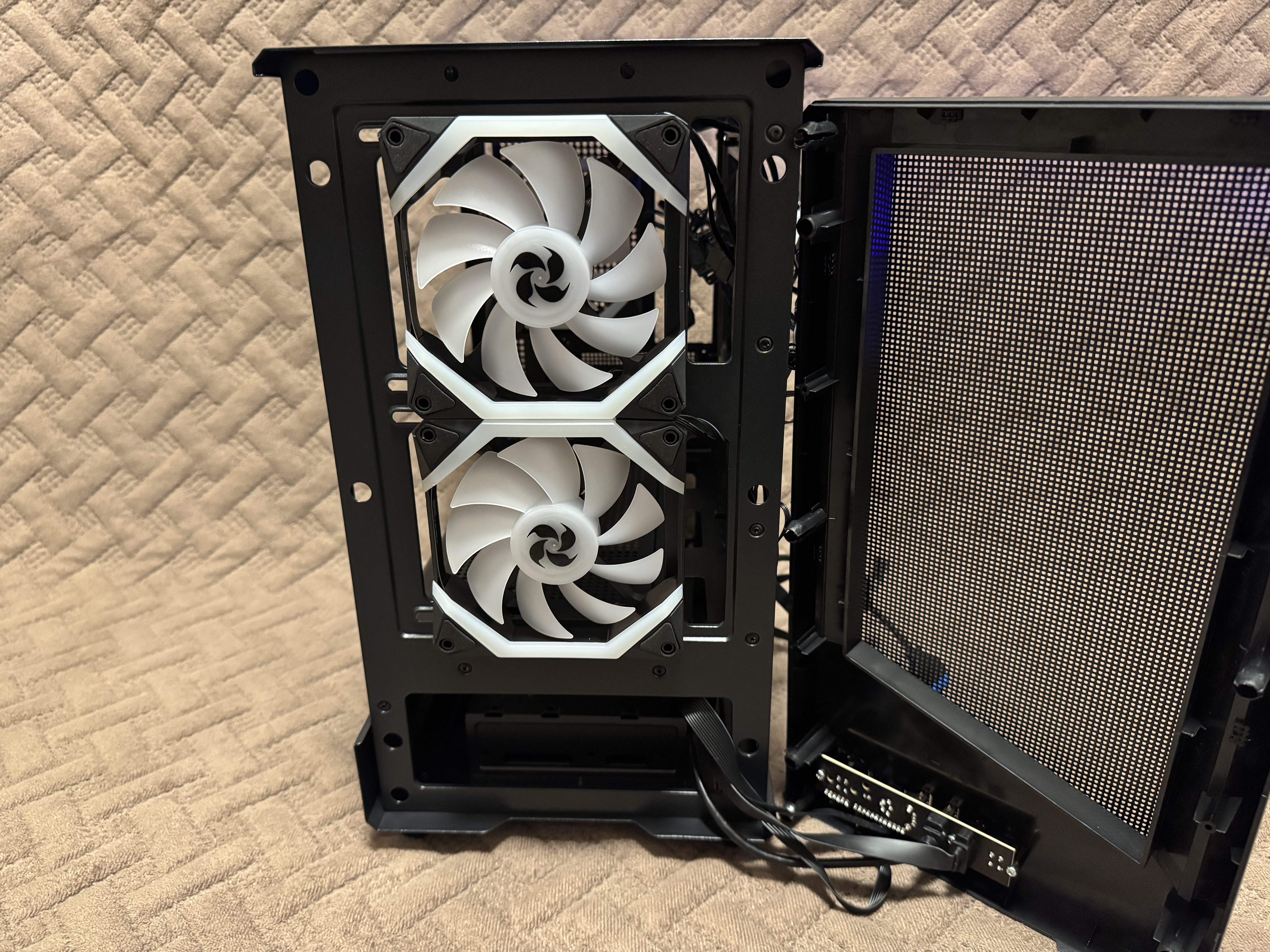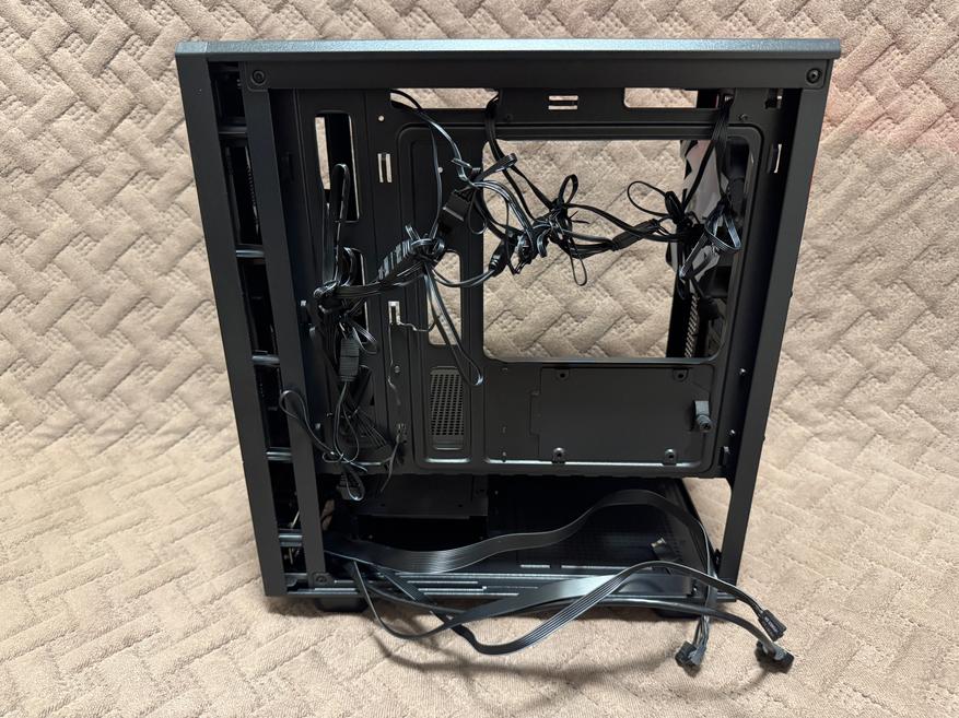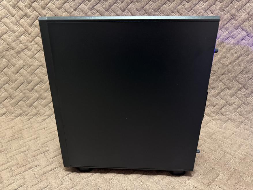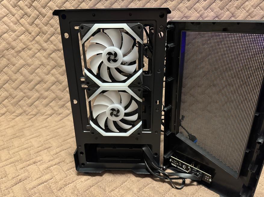 Лицевая панель фиксируется при помощи нескольких пластиковых креплений, которые без труда отщелкиваются и дают доступ пользователю к комплектным вентиляторам. На самом деле порадовало, что за бюджетную стоимость пользователь получает целых 5 комплектных вентиляторов 120 мм, которые к тому же имеют светодиодную подсветку. Также в корпус можно установить дополнительные 2 вентилятора по 120 мм на нижнюю часть, хотя даже без них внутреннее пространство будет отлично продуваться. Вентиляторы установлены 4FAN F40 с заявленным воздушным потоком 31.2 CFM, также вентиляторы имеют 1600 RPM (оборотов в минуту). Корпус поддерживает материнские платы формата M-ATX, ITX. Корпус хоть и маленький, но без труда сможет разместить в себе видеокарты с максимальной длиной 300 мм, процессорный кулер с MAX высотой 180 мм и стандартный блок питания ATX с MAX длиной 150-220 мм. Конечно в корпус можно установить радиаторы водяного охлаждения на заднюю часть 120 мм и на верхнюю часть 240/280 мм. Насчет кабель-менеджмента тут тоже все довольно хорошо и хоть места несильно много, но уложить все кабели будет возможно, главное укладывать аккуратно с фиксацией пластиковыми стяжками. В нижней части рядом с отсеком для блока питания имеется металлическая корзина для установки накопителя, в совокупности в корпус пользователь сможет установить несколько накопителей, а именно: 3.5″ HDD x 1 — 2.5″ SSD x 2.
