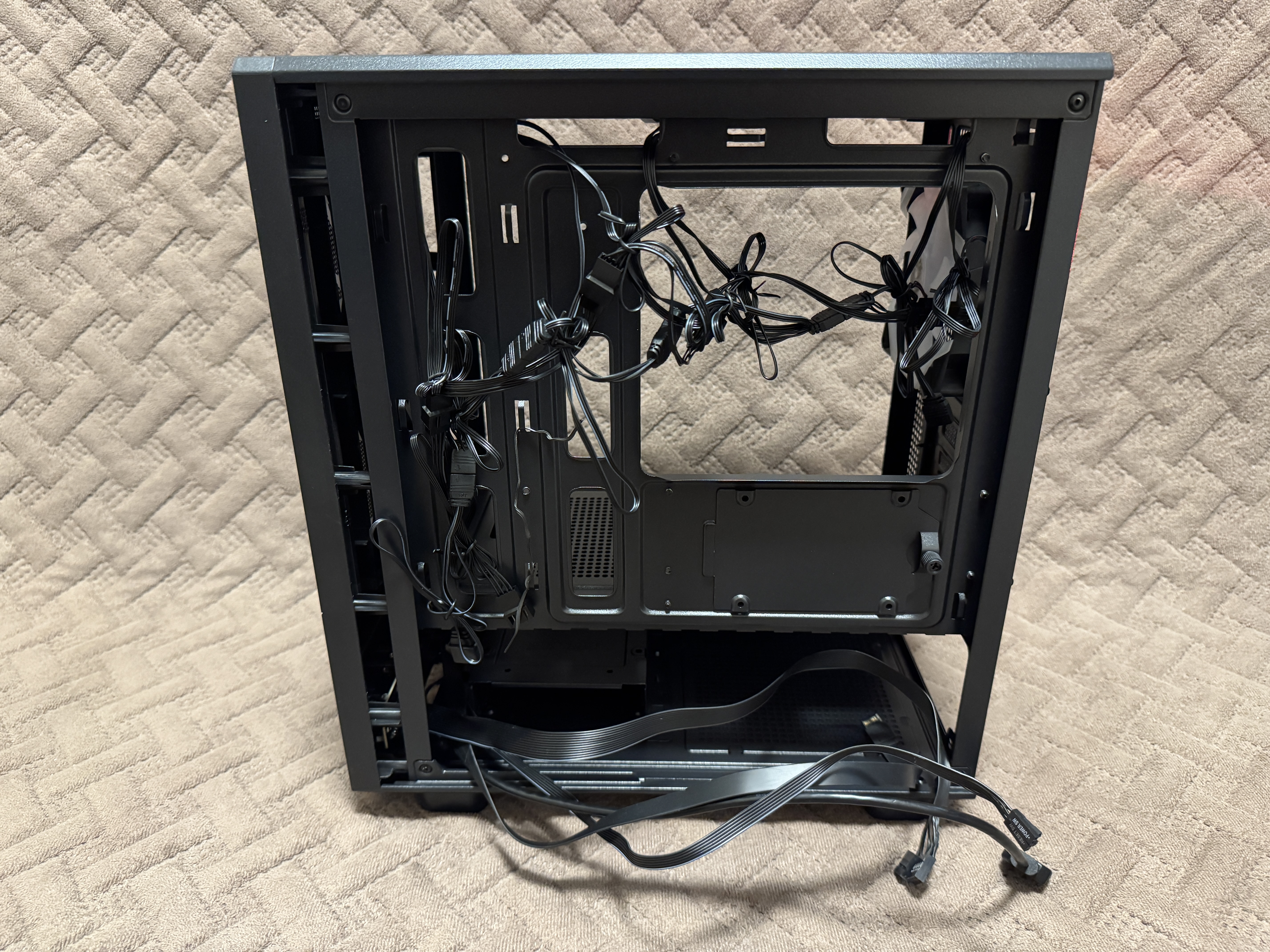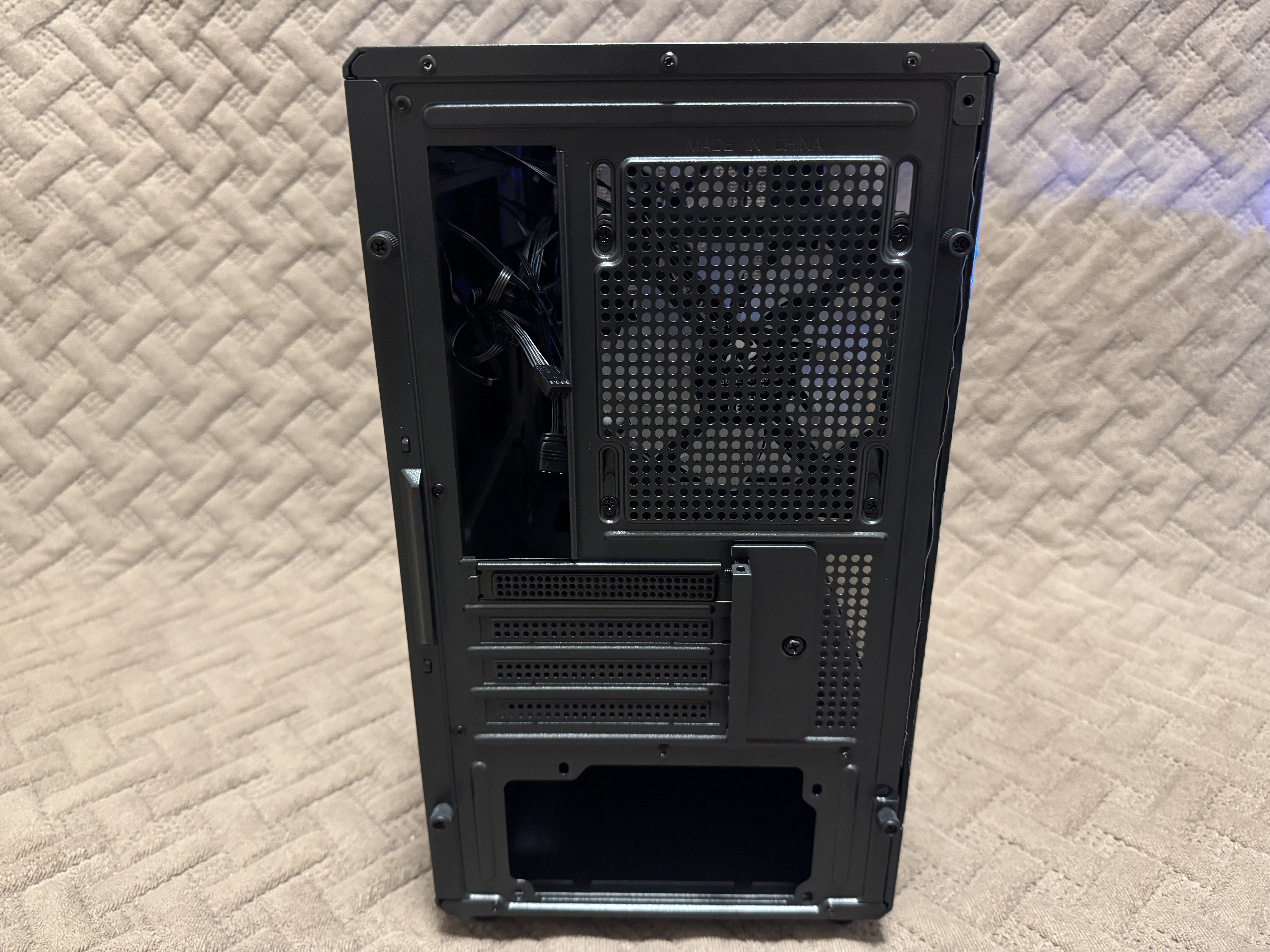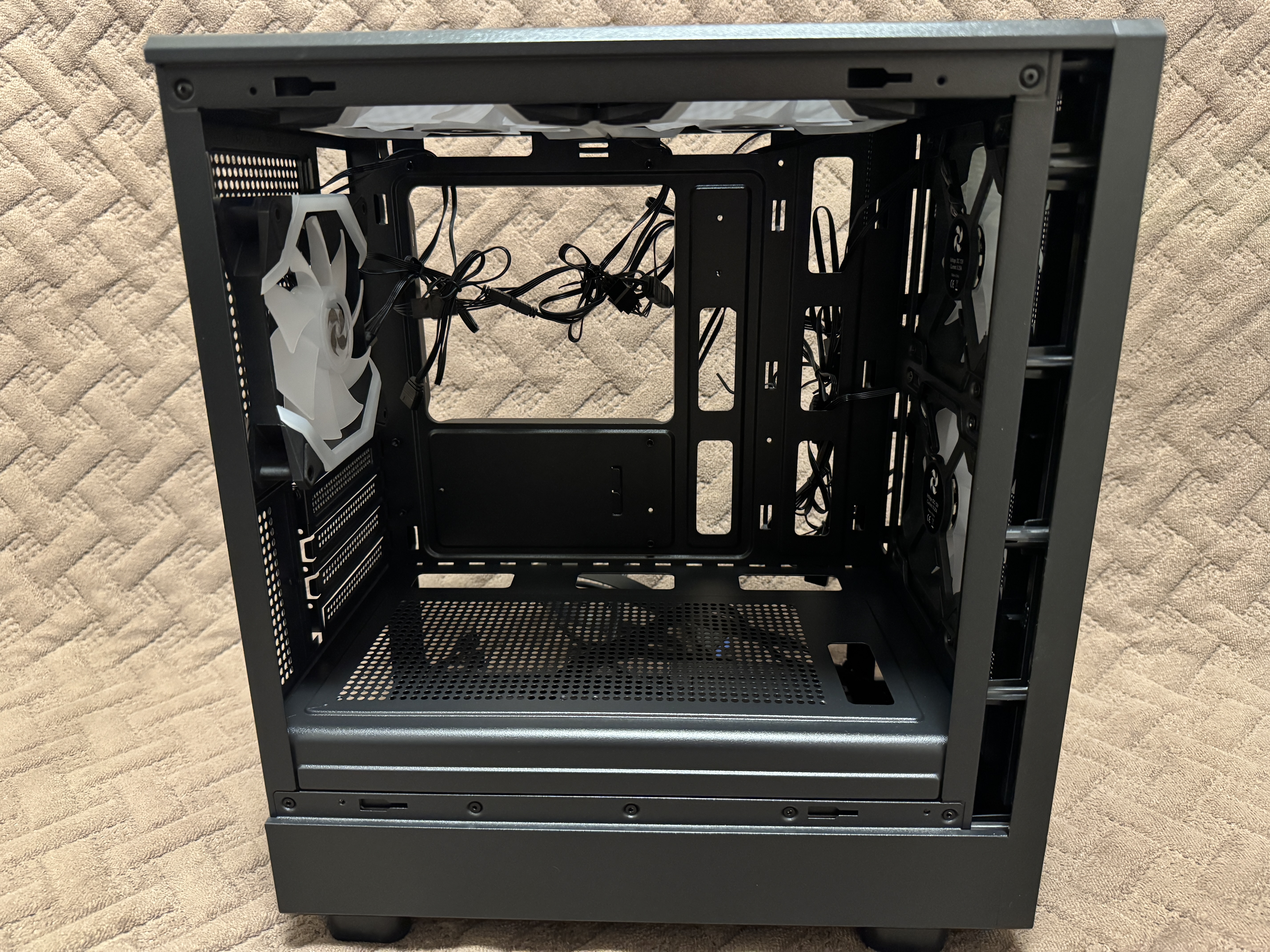 Лицевая панель фиксируется при помощи нескольких пластиковых креплений, которые без труда отщелкиваются и дают доступ пользователю к комплектным вентиляторам. На самом деле порадовало, что за бюджетную стоимость пользователь получает целых 5 комплектных вентиляторов 120 мм, которые к тому же имеют светодиодную подсветку. Также в корпус можно установить дополнительные 2 вентилятора по 120 мм на нижнюю часть, хотя даже без них внутреннее пространство будет отлично продуваться. Вентиляторы установлены 4FAN F40 с заявленным воздушным потоком 31.2 CFM, также вентиляторы имеют 1600 RPM (оборотов в минуту). Корпус поддерживает материнские платы формата M-ATX, ITX. Корпус хоть и маленький, но без труда сможет разместить в себе видеокарты с максимальной длиной 300 мм, процессорный кулер с MAX высотой 180 мм и стандартный блок питания ATX с MAX длиной 150-220 мм. Конечно в корпус можно установить радиаторы водяного охлаждения на заднюю часть 120 мм и на верхнюю часть 240/280 мм. Насчет кабель-менеджмента тут тоже все довольно хорошо и хоть места несильно много, но уложить все кабели будет возможно, главное укладывать аккуратно с фиксацией пластиковыми стяжками. В нижней части рядом с отсеком для блока питания имеется металлическая корзина для установки накопителя, в совокупности в корпус пользователь сможет установить несколько накопителей, а именно: 3.5″ HDD x 1 — 2.5″ SSD x 2.