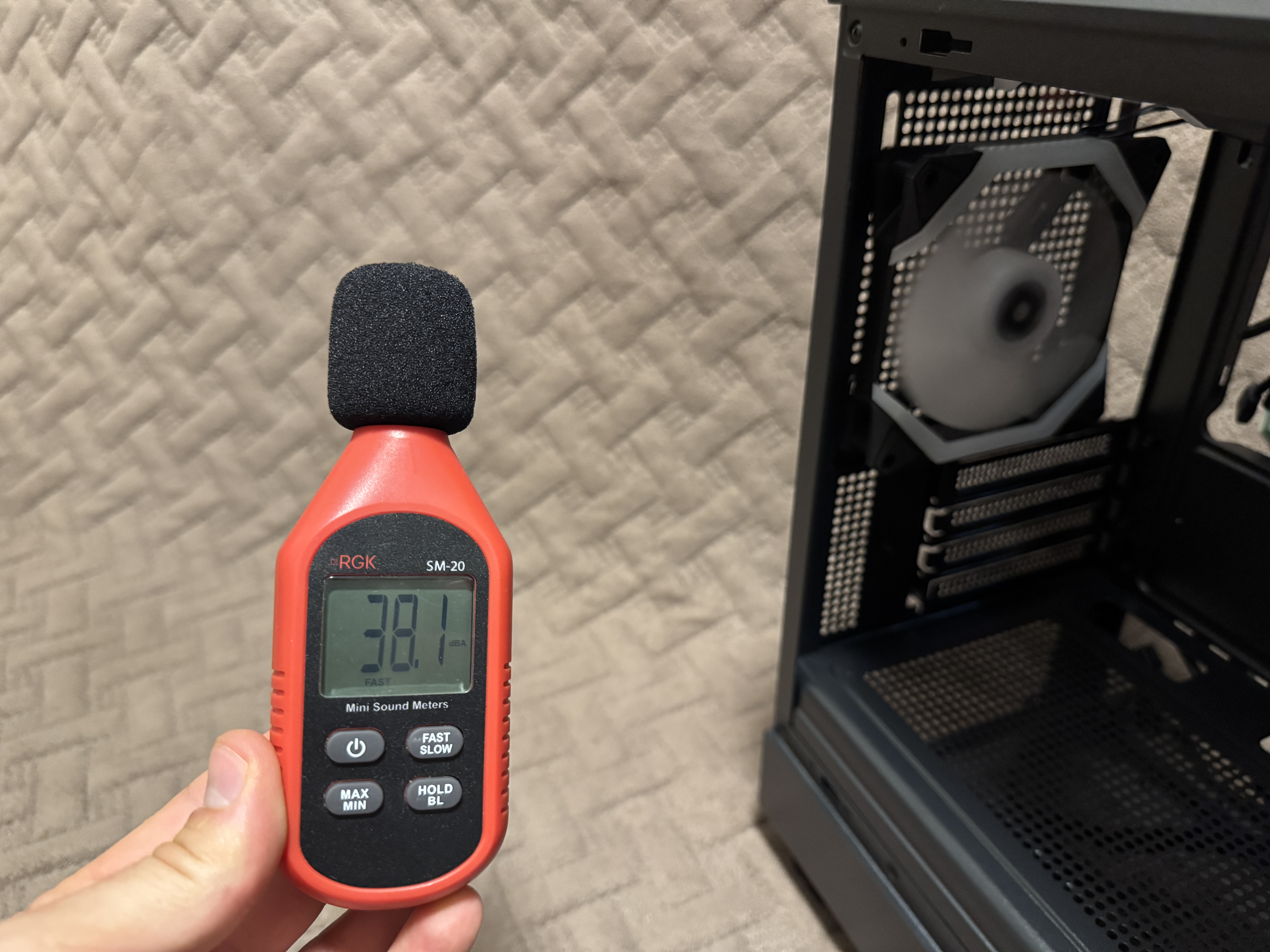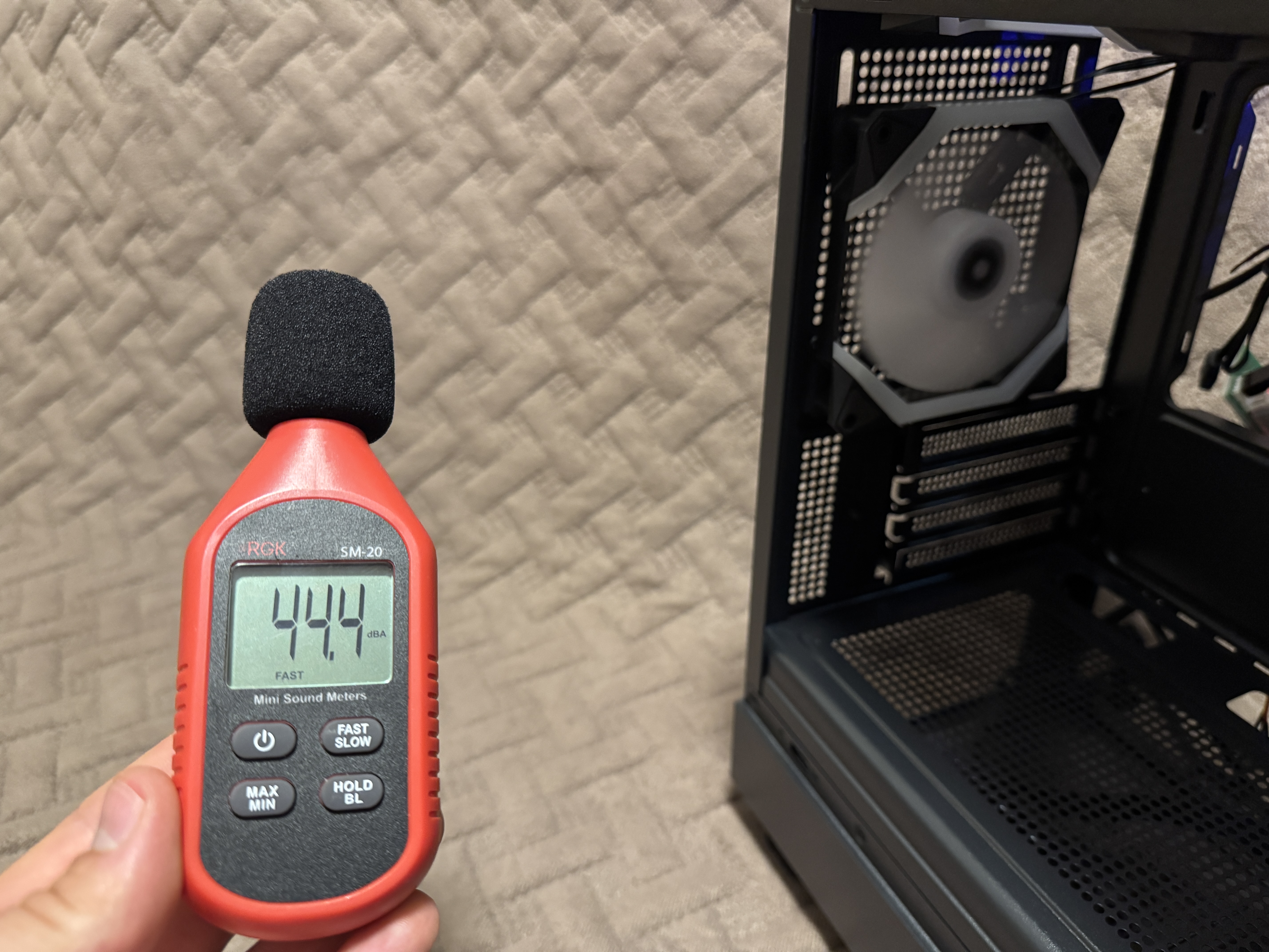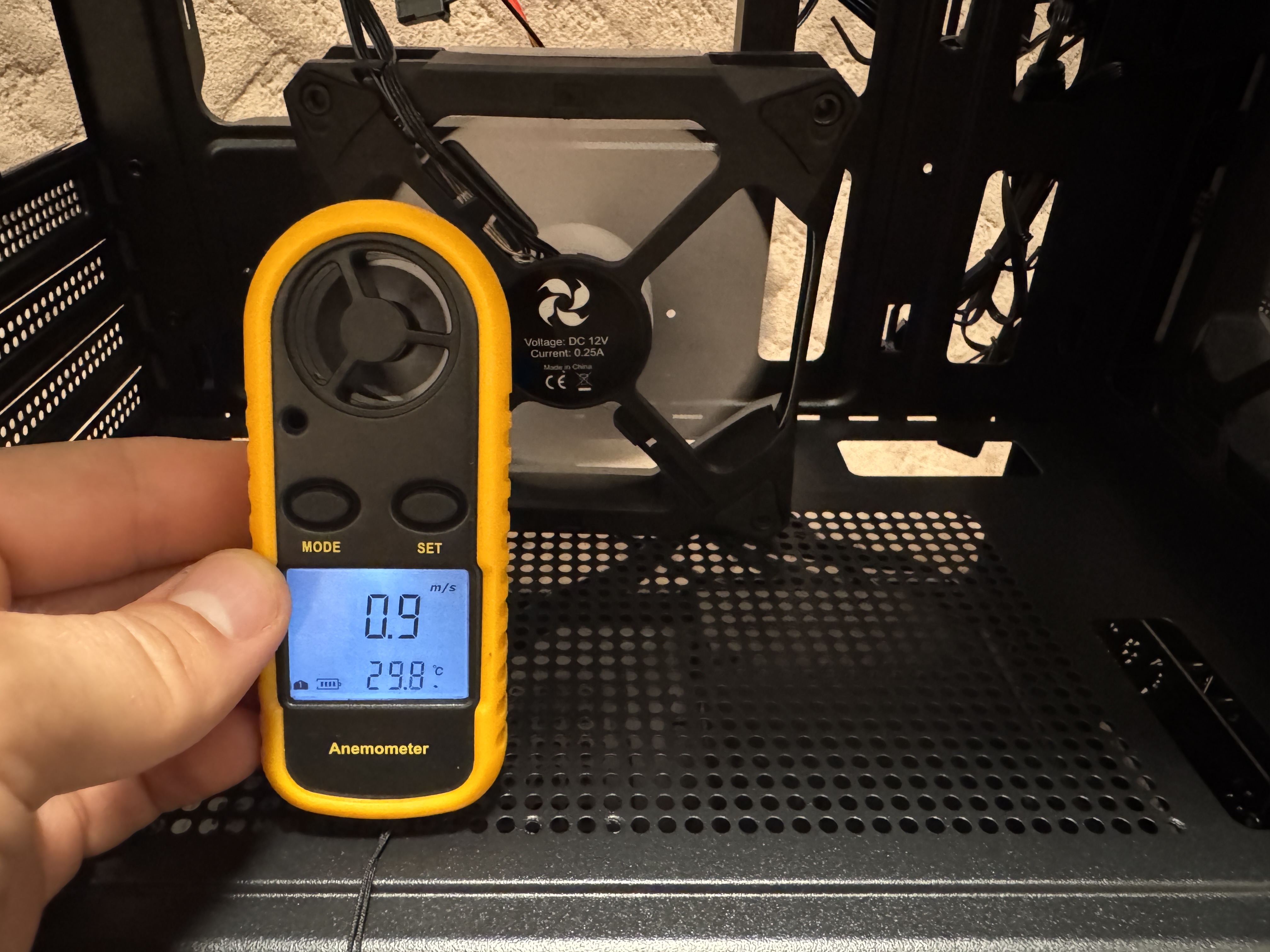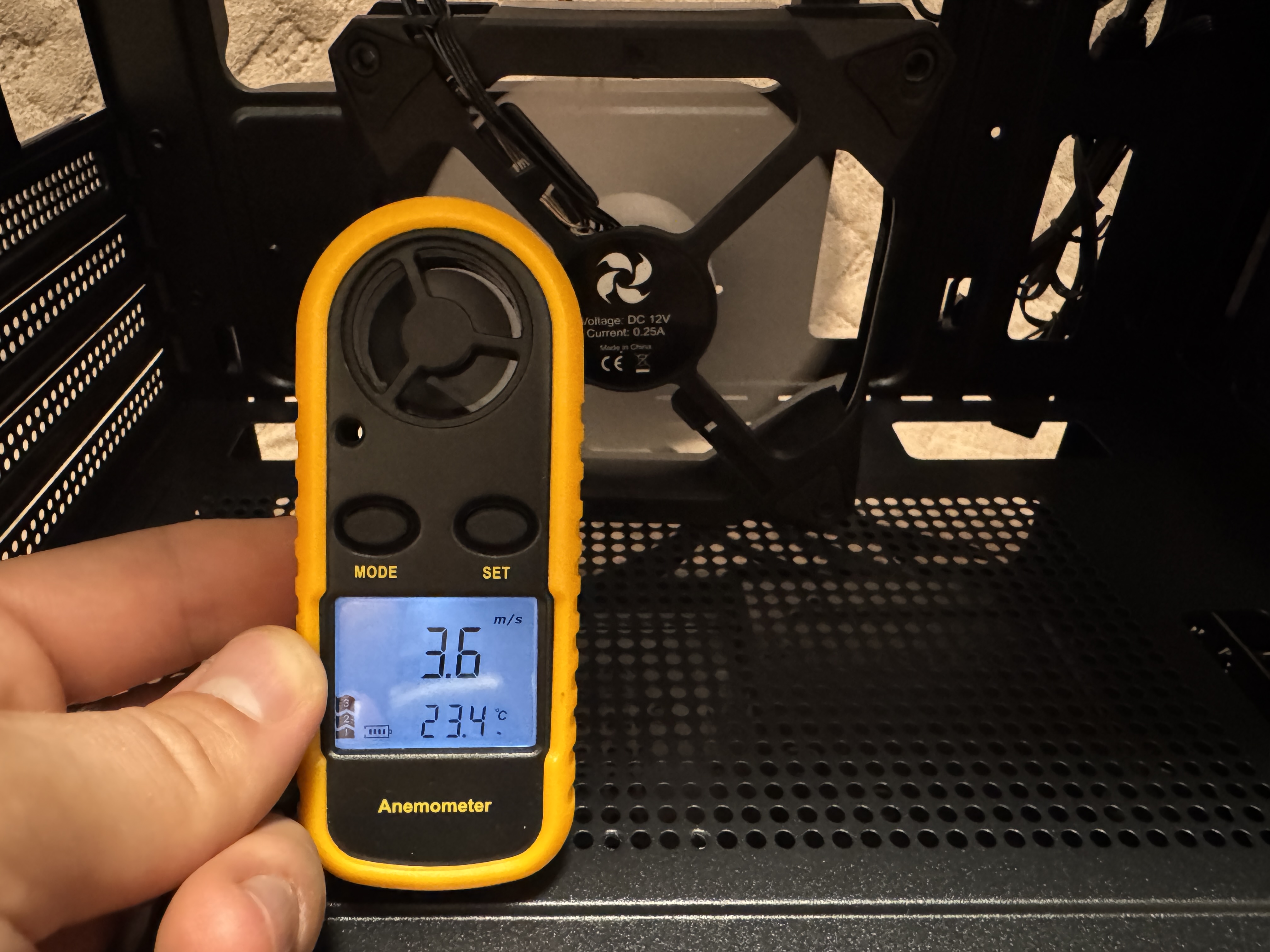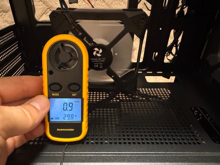 При помощи анемометра замерил скорость воздушного потока при MIN и MAX оборотах. При минимальных оборотах вентилятора мы получаем 0.9 метра в секунду, а при максимальных оборотах скорость воздушного потока увеличилась до 3.6 м/сек.