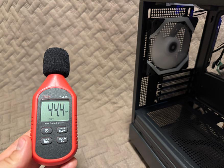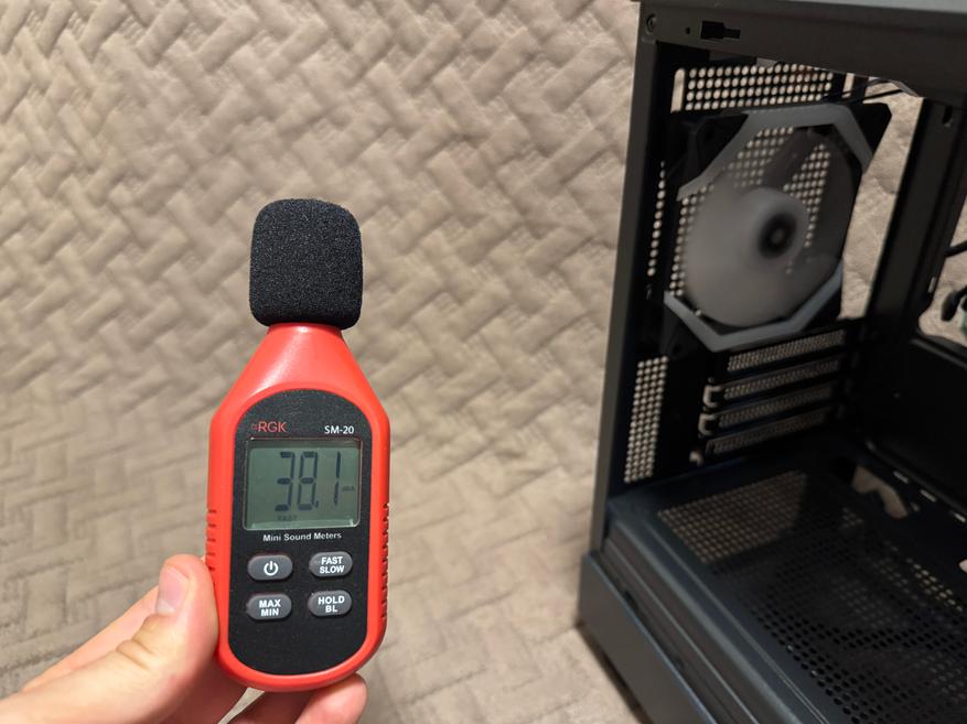 Уровень шума при минимальных оборотах составляет 38 dB, а при максимальных оборотах 44 dB.