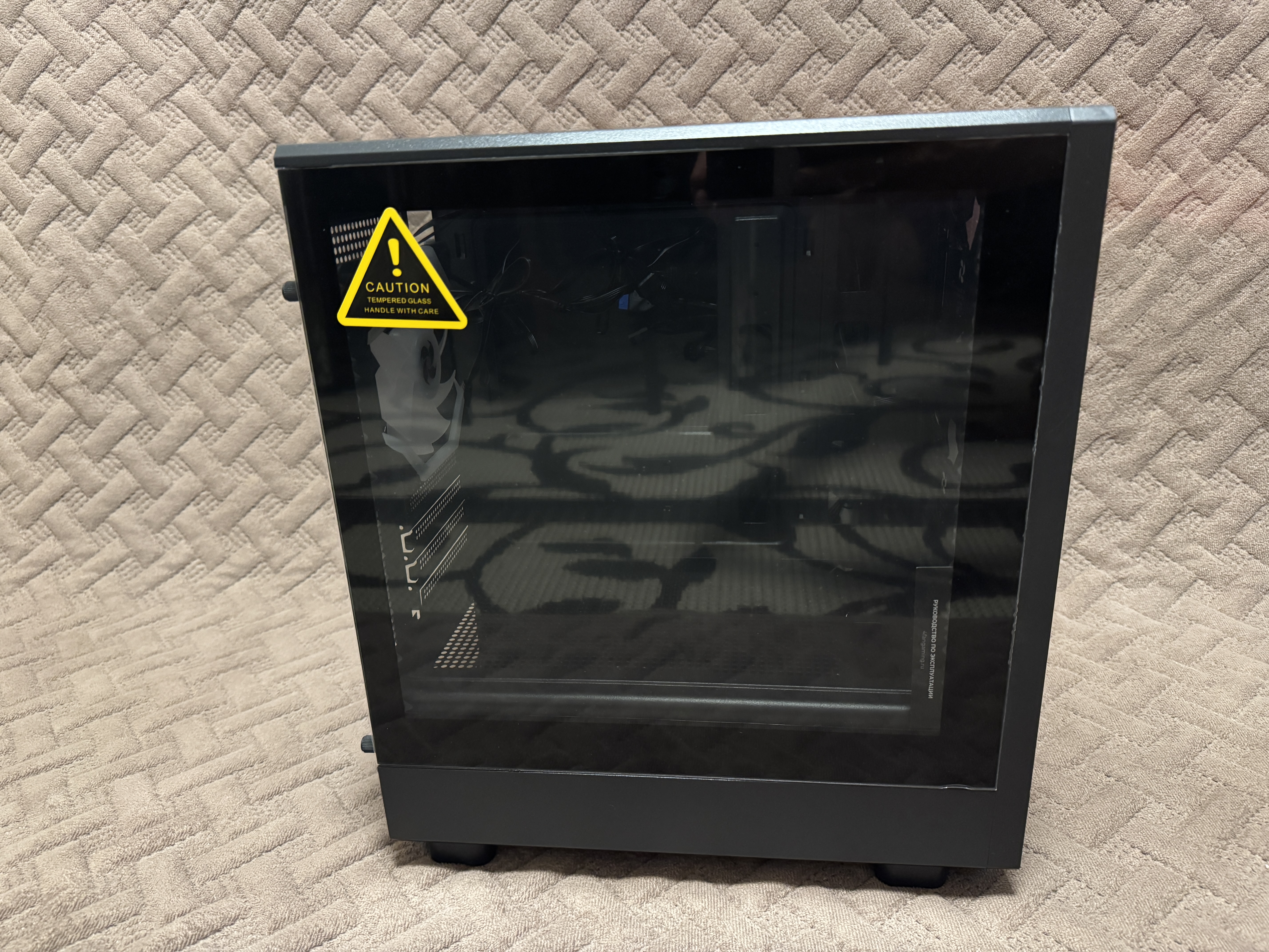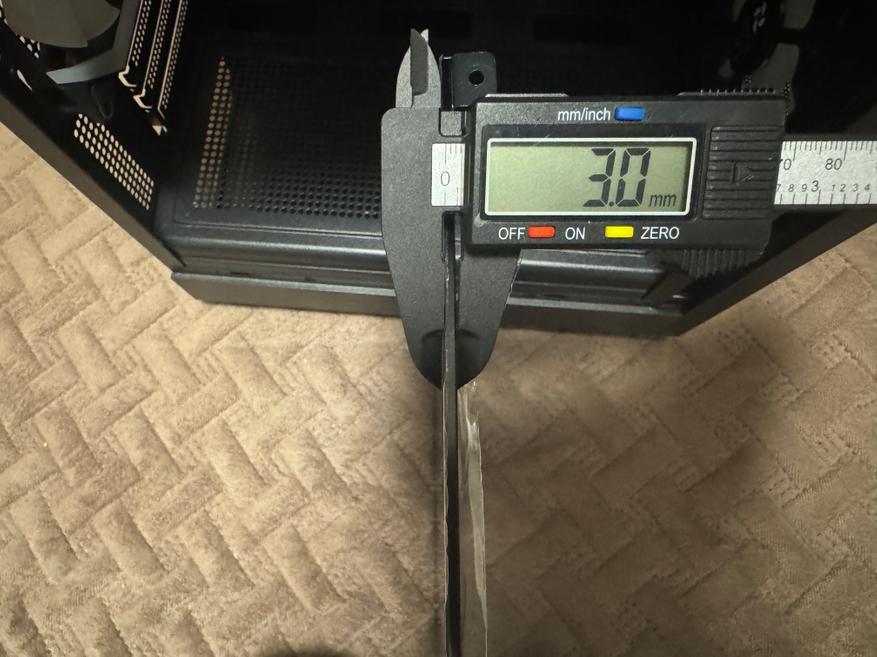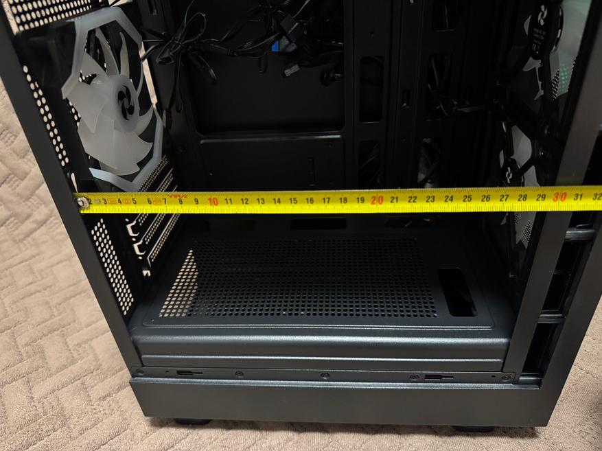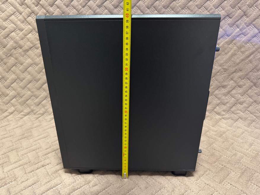 Корпус имеет внешние размеры 350 мм x 215 мм x 395 мм (с ножками). Боковое закаленное стекло имеет толщину 3 мм. Внутренние размеры корпуса 31 см x 18.5 см.
