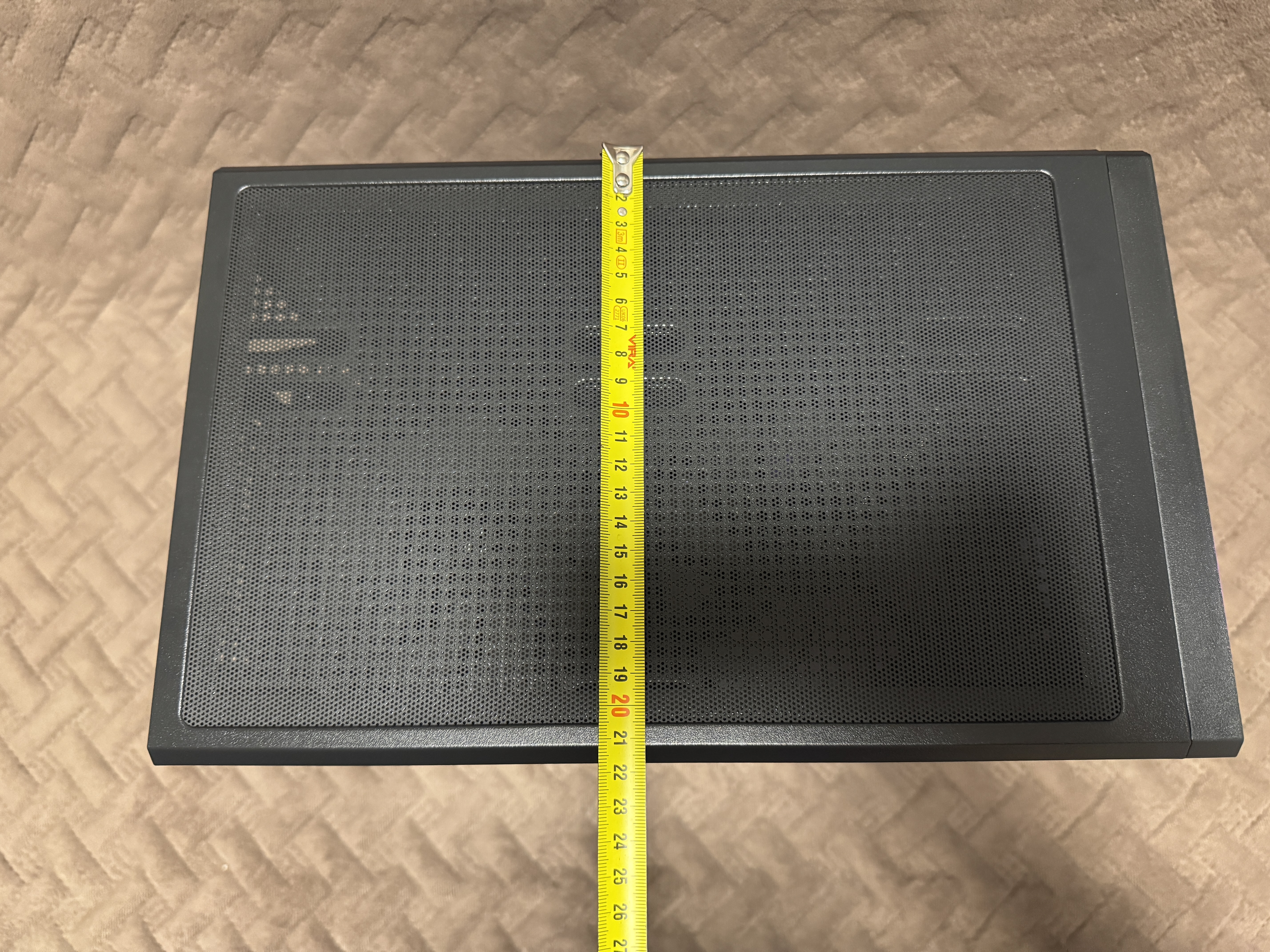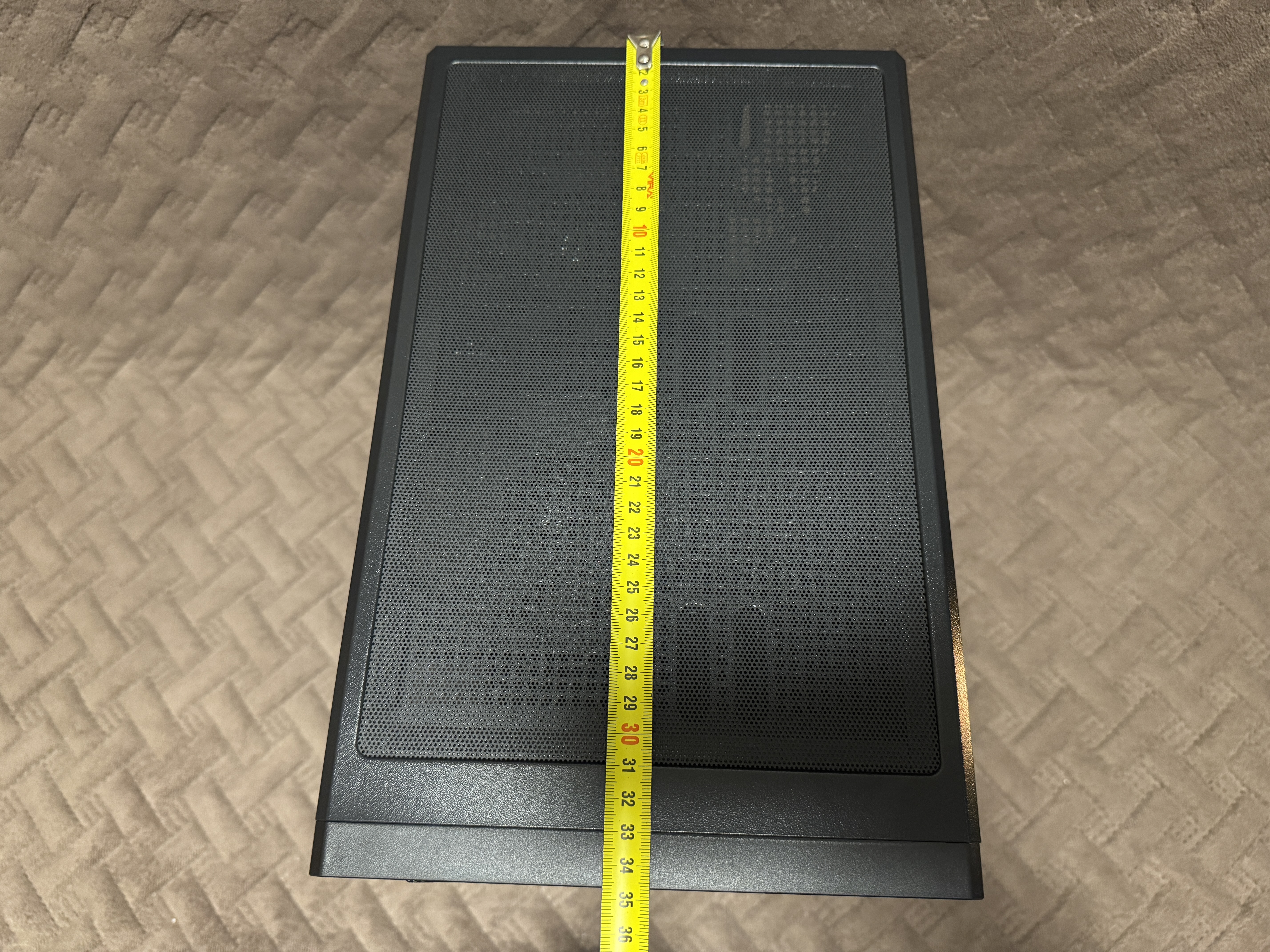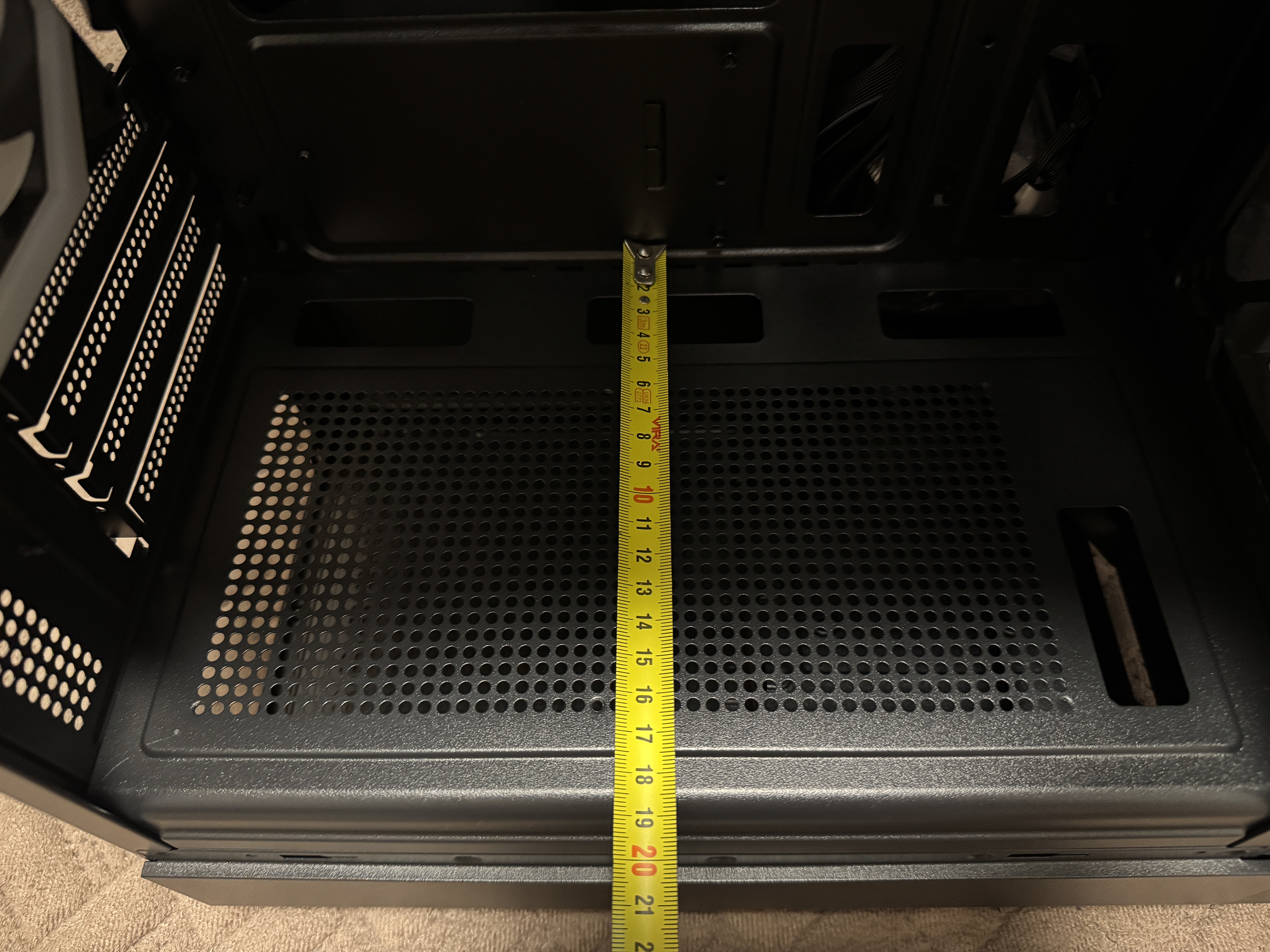 Корпус имеет внешние размеры 350 мм x 215 мм x 395 мм (с ножками). Боковое закаленное стекло имеет толщину 3 мм. Внутренние размеры корпуса 31 см x 18.5 см.