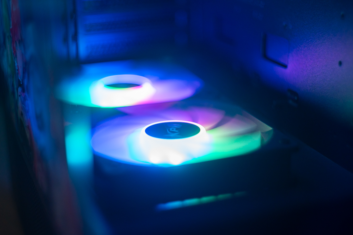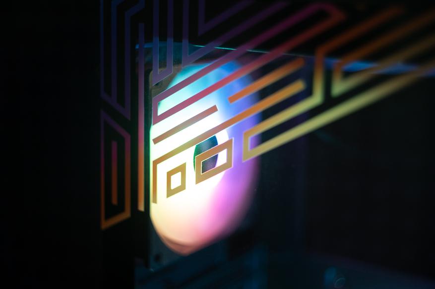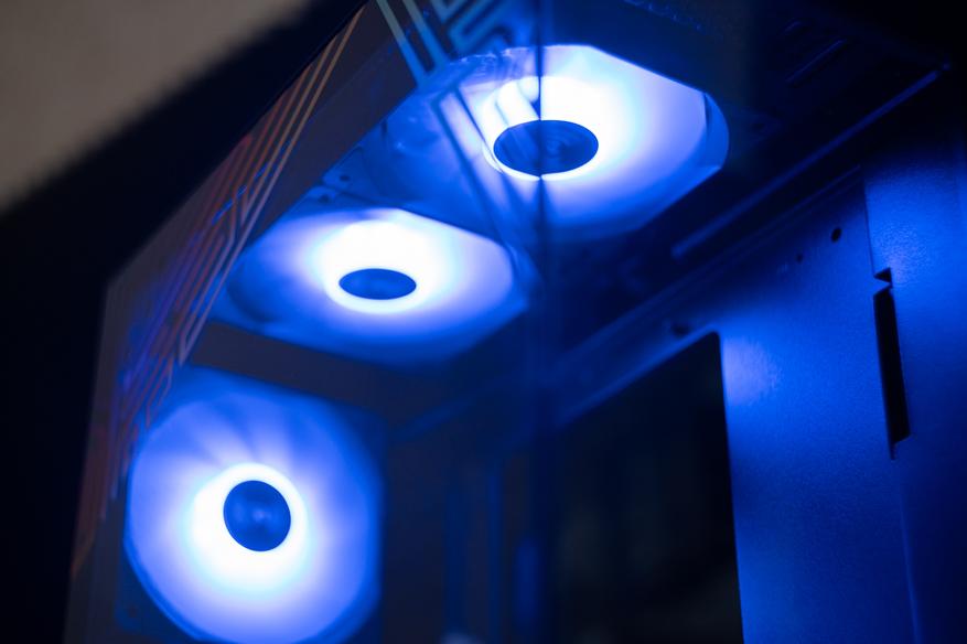 Установив вентиляторы в корпус, я решил рассмотреть подсветку. У вентилятора светится только крыльчатка, так как диоды установлены только на плате мотора. Но к подсветке у меня вопросов почти нет, яркая, сочная, и при желании даже можно выставить вполне чистый белый цвет. Докопаться можно разве что до равномерности, так как весь пик яркости приходится на центральную часть пропеллера, а края светятся не так сильно.