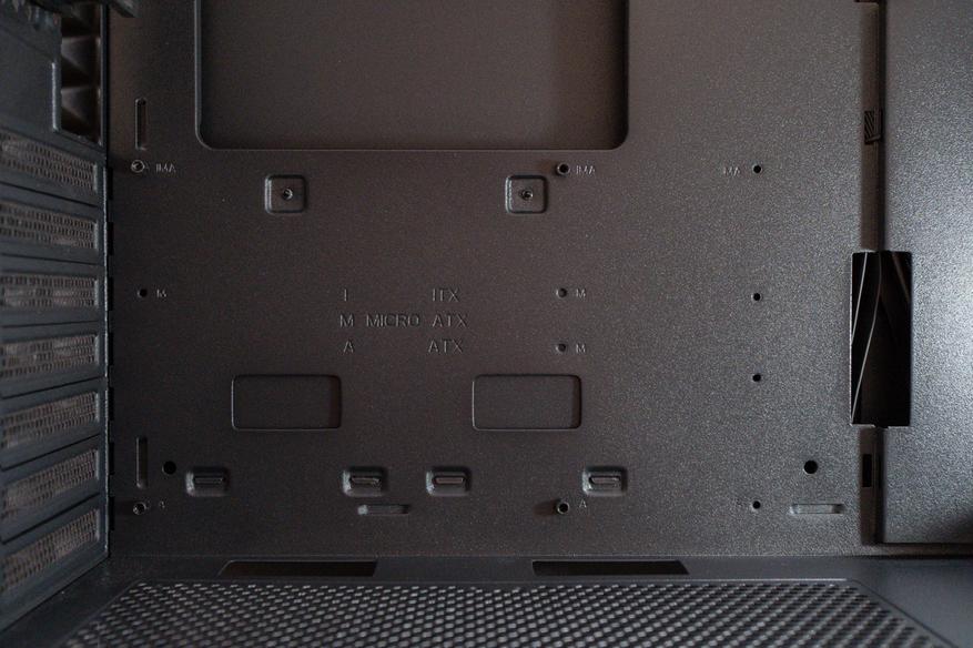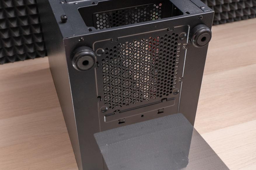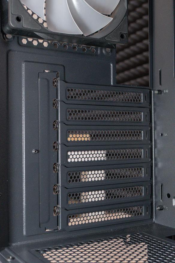 На задней стенке вид вполне стандартный, есть место под 120мм вентилятор, место под обычный ATX блок питания, 7 слотов для PCIE устройств с многоразовыми заглушками, и стандартное отверстие для портов ATX материнской платы. Интересно что расстояние между платой и верней крышкой немного увеличено для удобства установки систем водяного охлаждения.