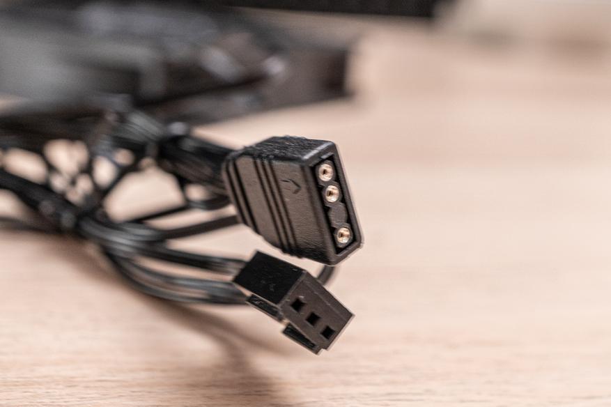 Вентиляторов в комплекте аж 5 штук, все они имеют адресную RGB подсветку с проводом параллельного подключения, а так же 3пин коннектор для питания и управления оборотами путем изменения напряжения.