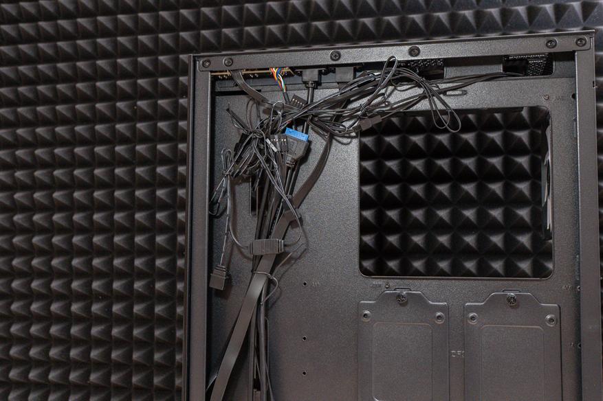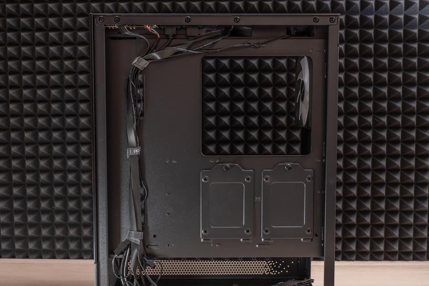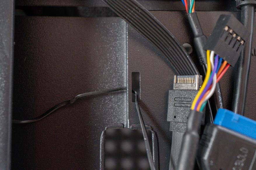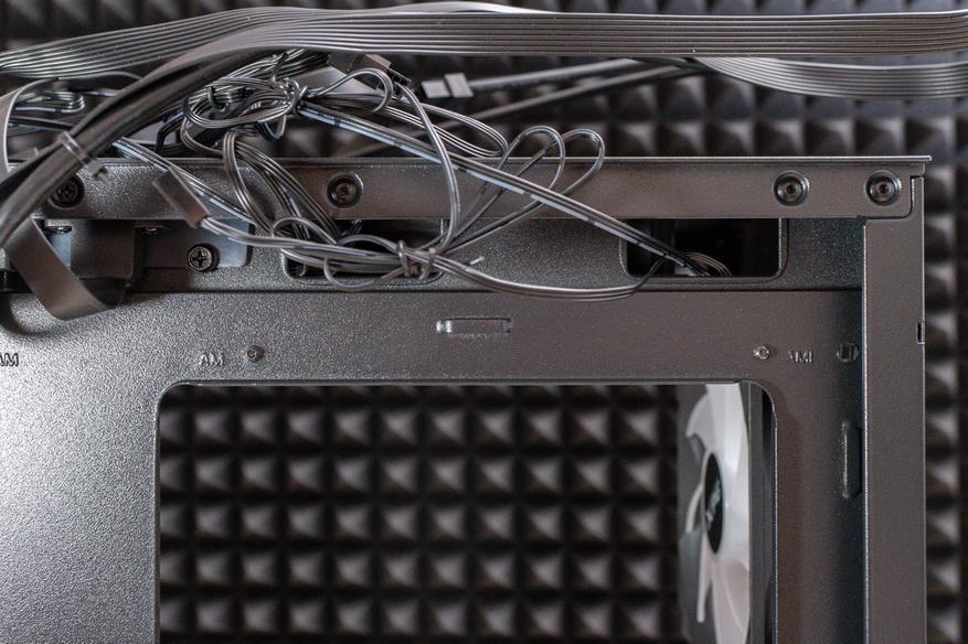 Кабель менеджмент имеет сложность на 2 из 5. Места для кабелей много, сами кабели корпуса вполне мягкие, отверстий для их протяжки достаточно. Но в идеальном мире можно было бы сделать больше петелек для притягивания проводов, а места между бп и крышкой над ним маловато и кабели вентиляторов протягивались с трудом. Зато сверху места было много, я без проблем подключил кабель питания процессора даже с установленной материнской платой, кулером и вентиляторами на верхней крышке.