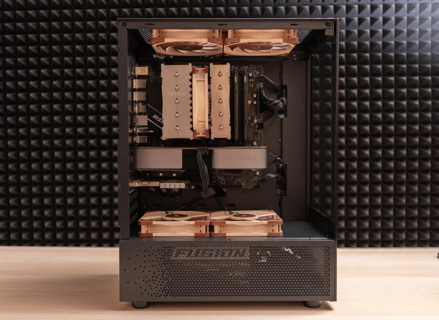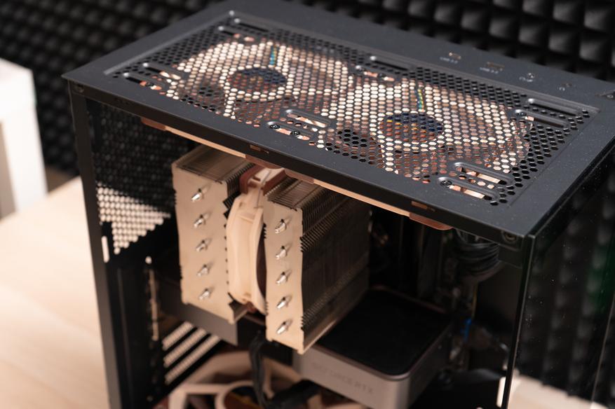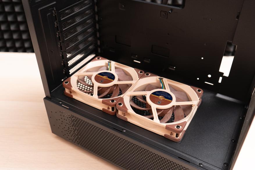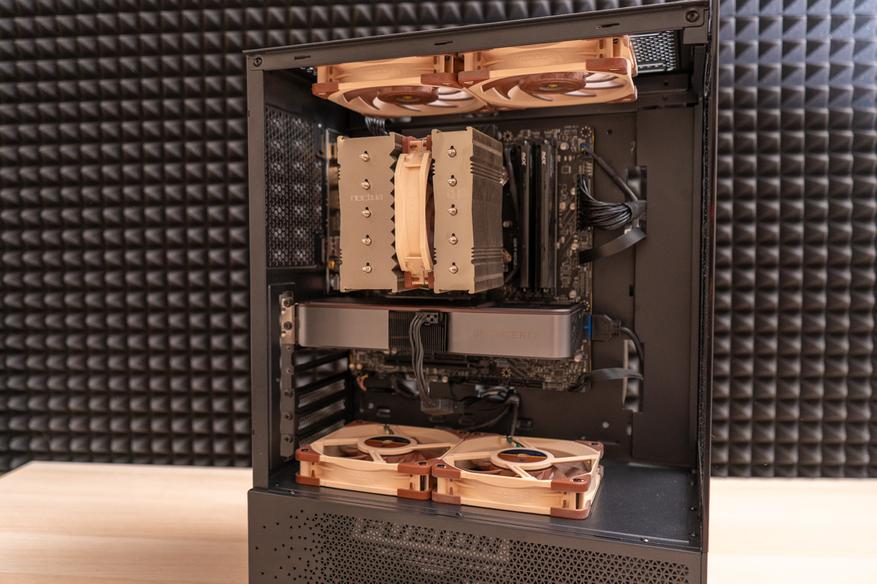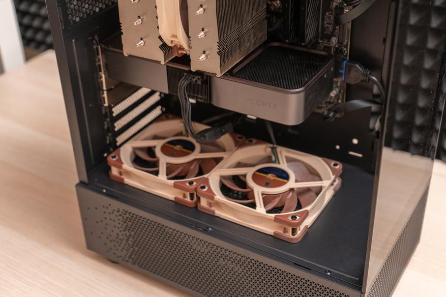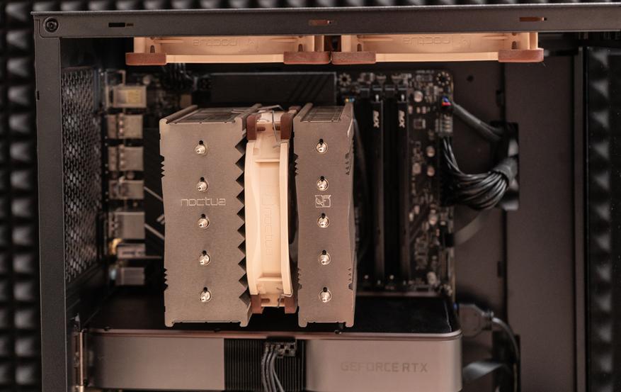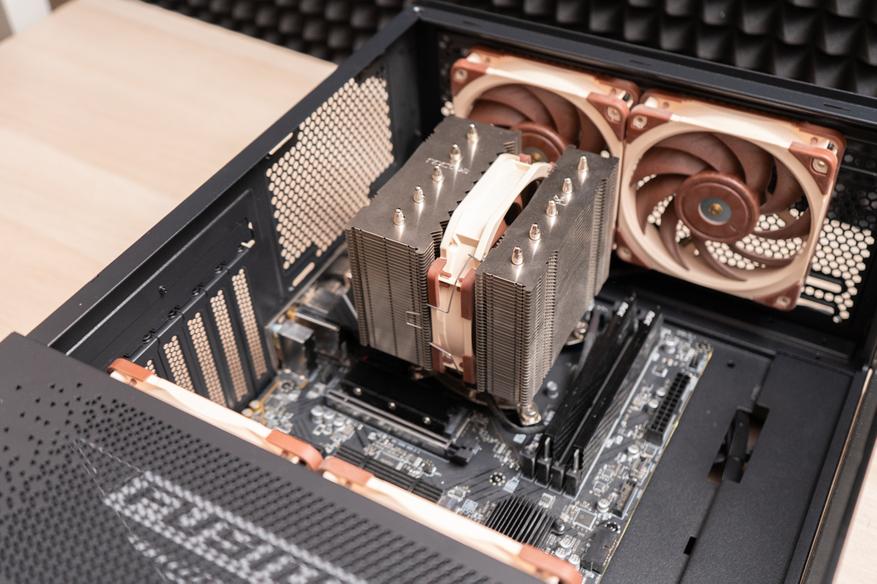 В качестве охлаждения на процессоре используется башня Noctua NH-d12L, а вентиляторы корпуса заменены на Noctua a12x25.