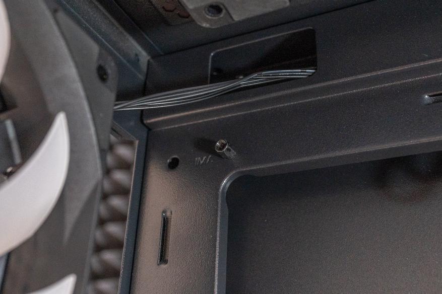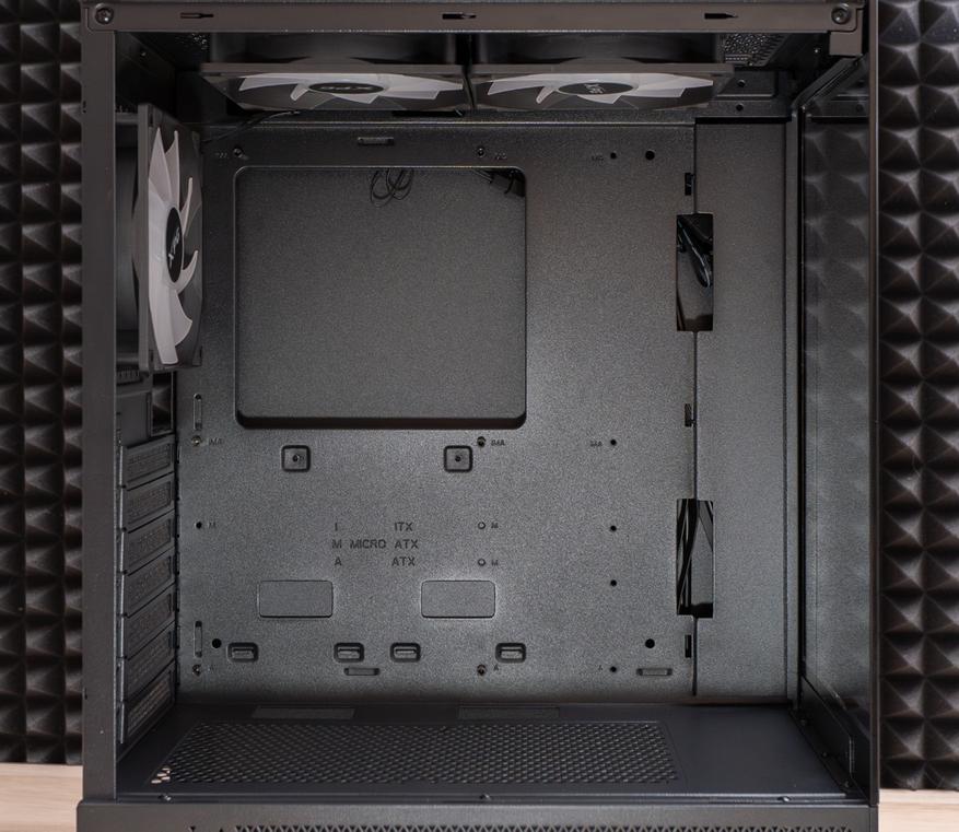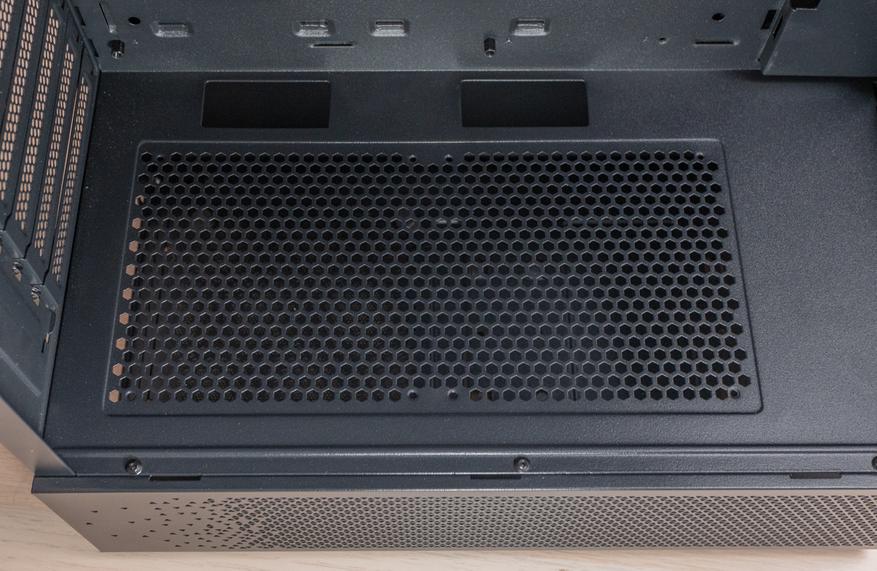 Вид на верхнюю часть корпуса без сетки, можно заметить точки крепления который поддерживают как 120 так и 140мм вентиляторы.