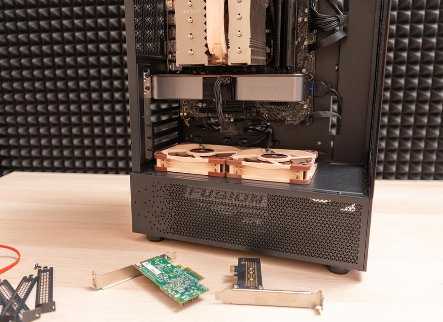 По температуре проблем не возникло, процессор в норме (с учетом андервольта до 150вт так как кулер маловат для полного тдп), видеокарта чувствует себя отлично, сетевая карта на 10 гигабит выше 37с не поднималась. Единственное что я сделал, это немного поднял обороты нижних вентиляторов дабы создать давление внутри корпуса и компенсировать их поток частично перекрытый сетками.