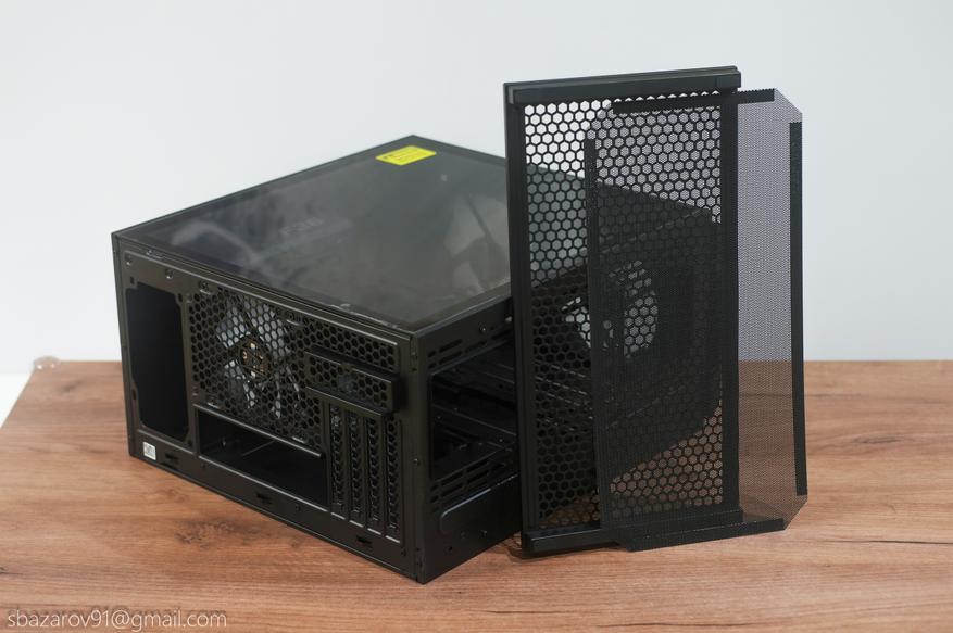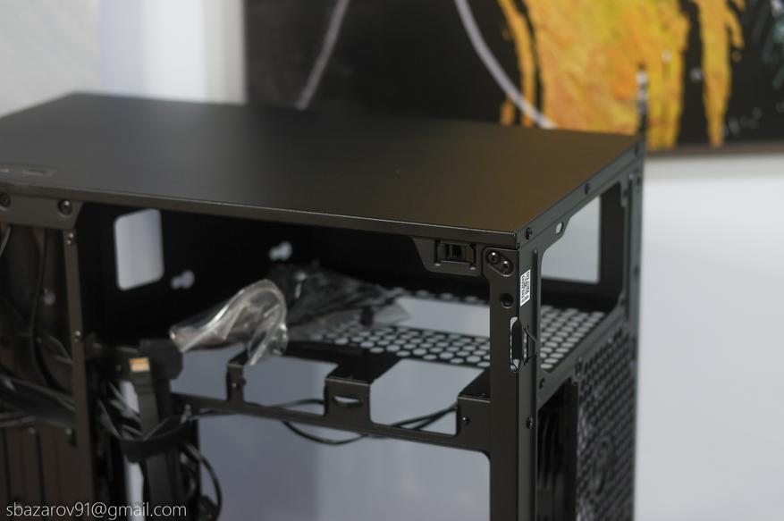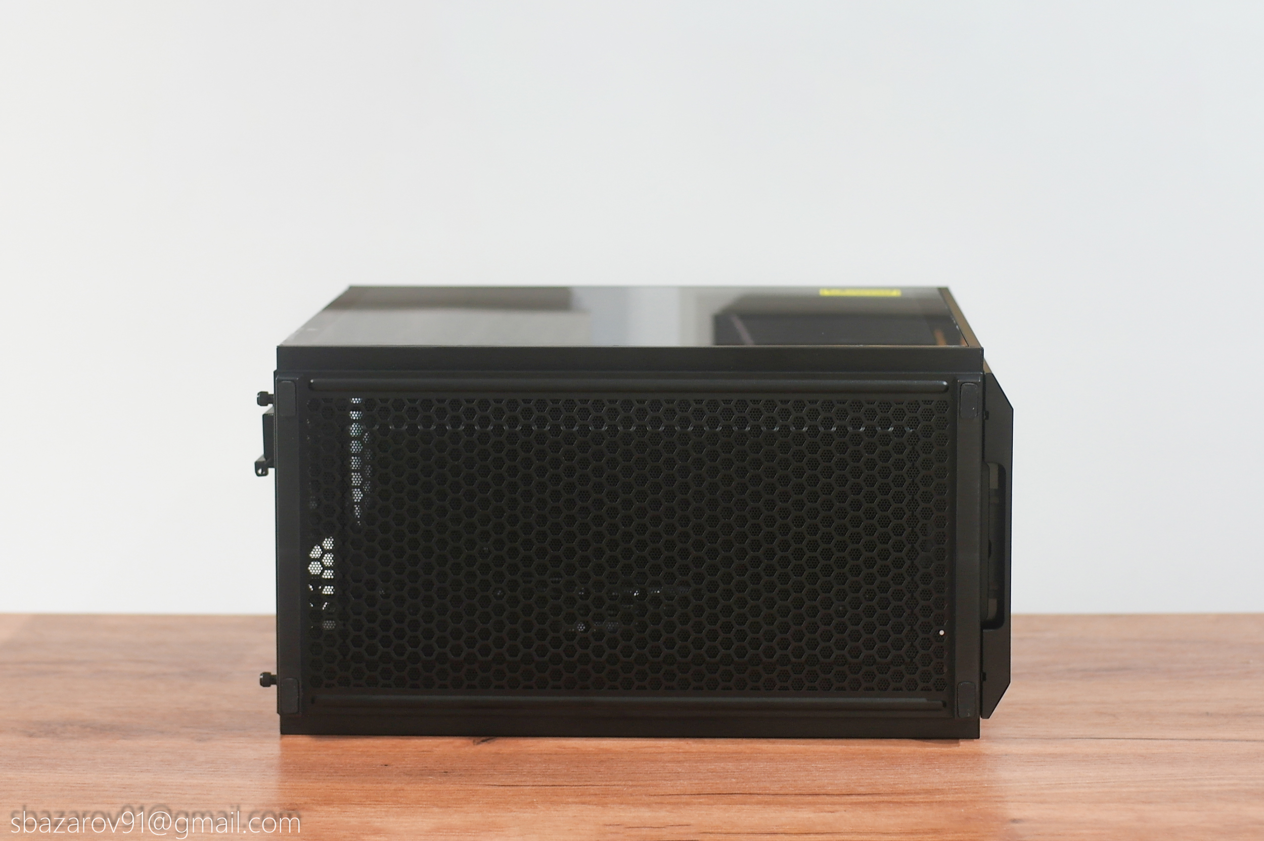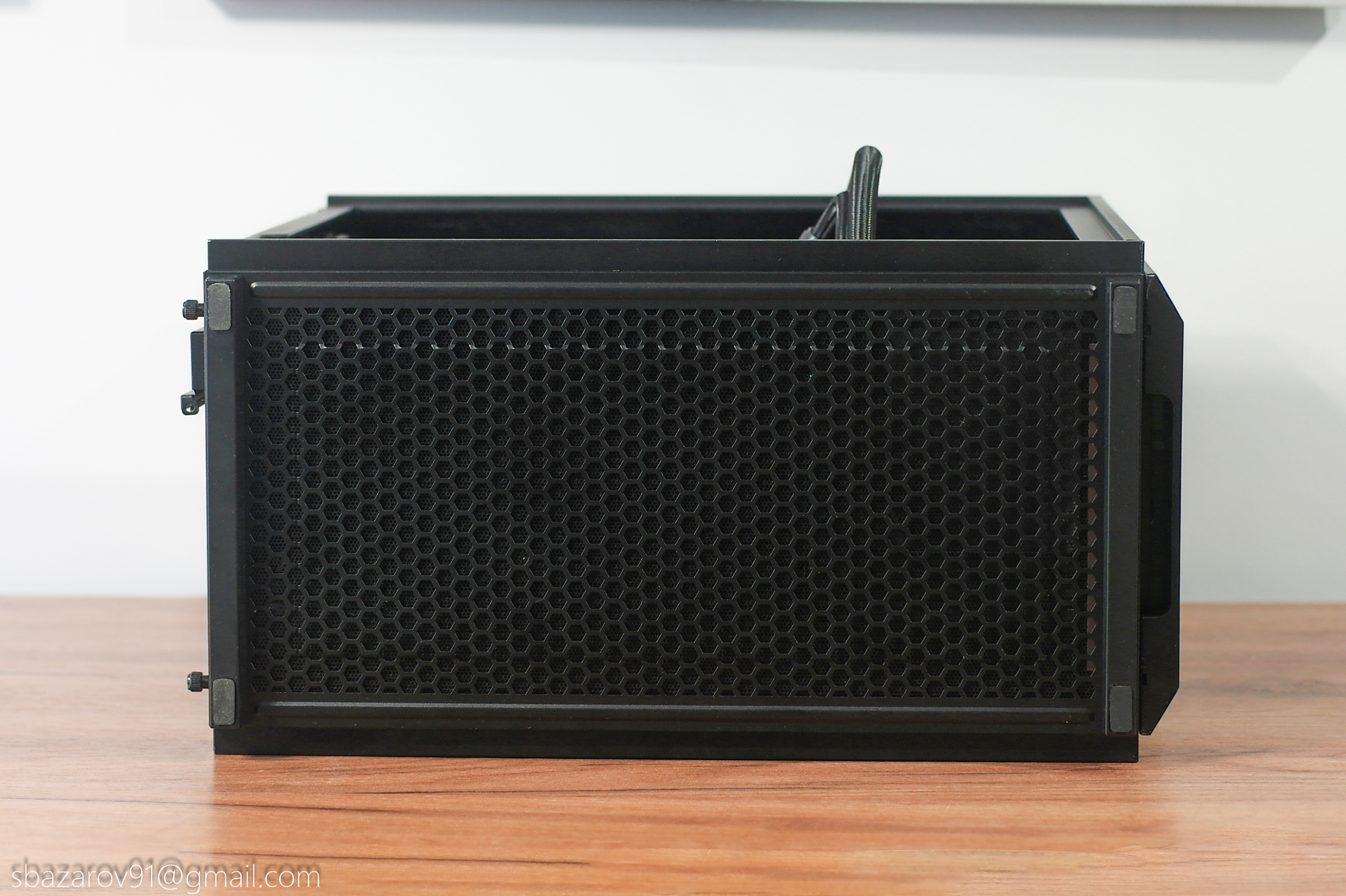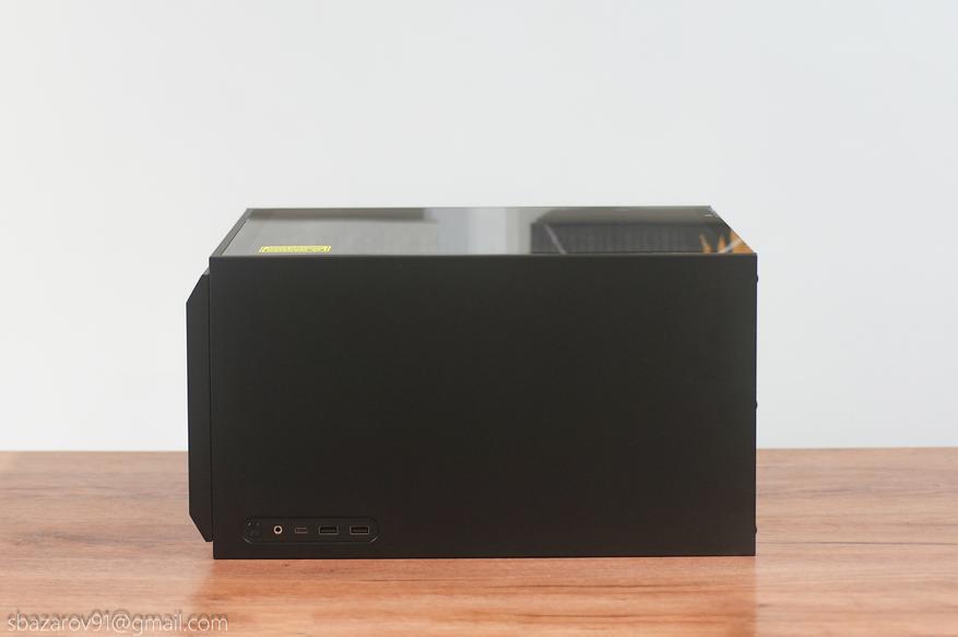 Панель I/O с кнопкой питания, разъемами AUX, Type-C Gen2 (10 Gbps) и двумя портами USB 3.0 расположена на верхней крышке. Инженерной находкой стала возможность переноса этой панели на фронтальную часть корпуса с заменой фирменного логотипа. Удерживается I/O панель с помощью пары винтов с обратной стороны.