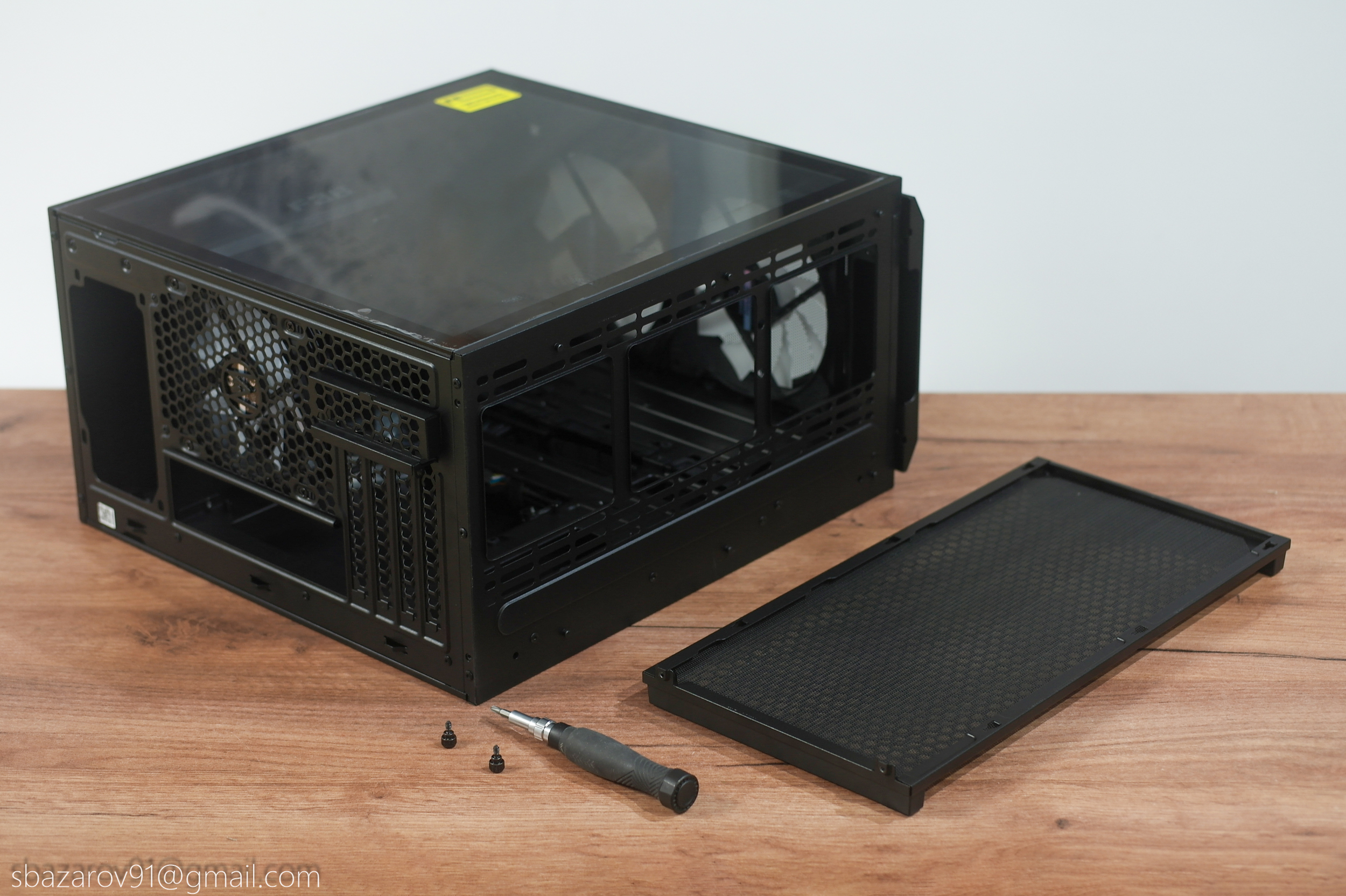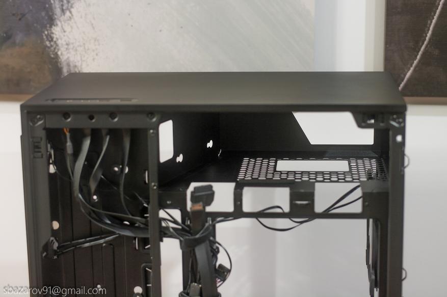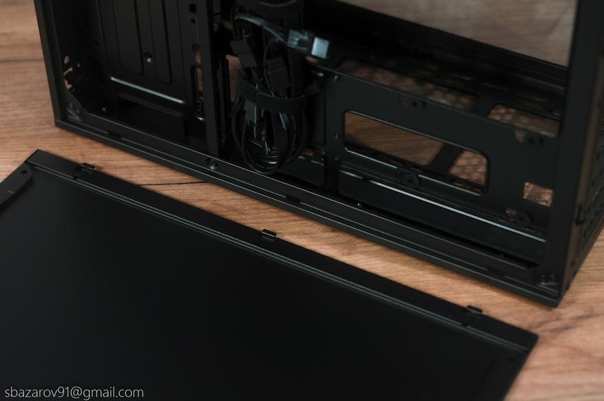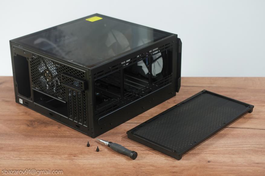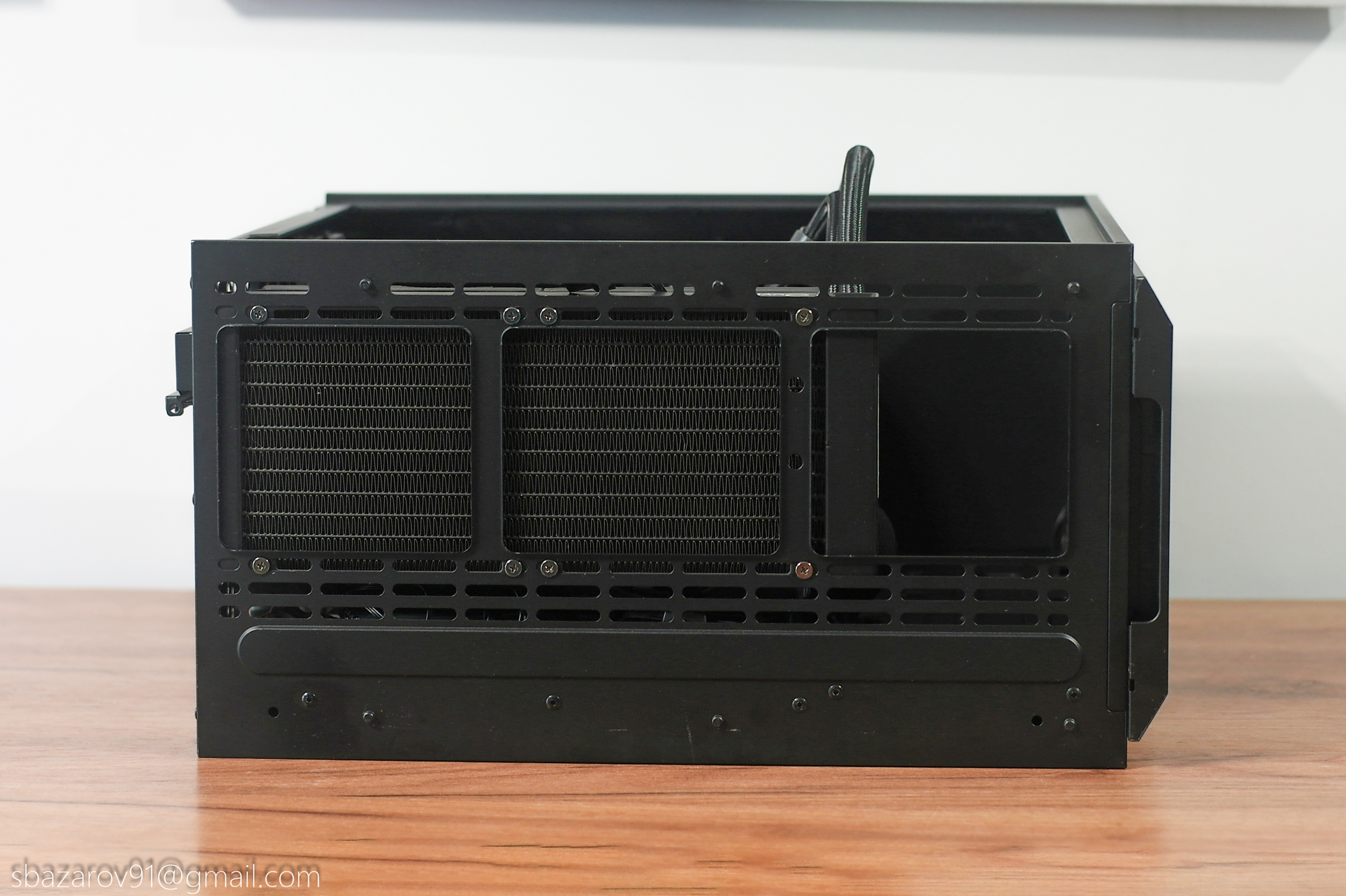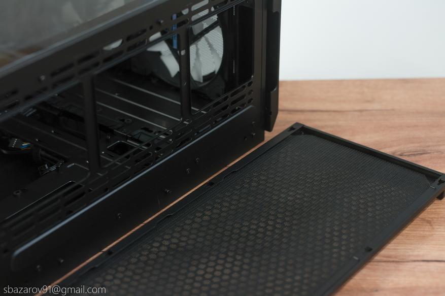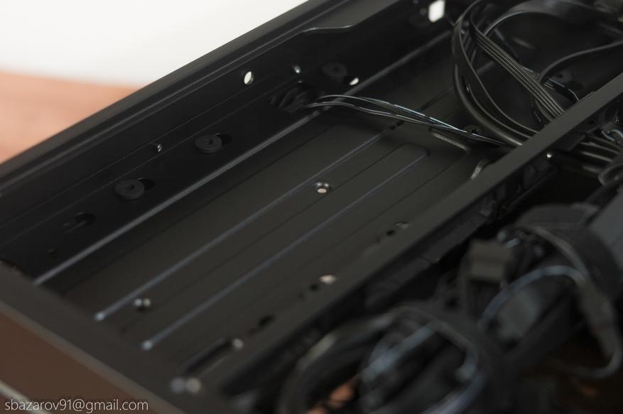 Нижняя площадка без пылевого фильтра позволяет в полной мере оценить возможности корпуса — сюда можно установить СЖО с радиатором длиной до 280 мм, при этом весь крепеж останется скрытым в теле корпуса. Большое количество посадочных креплений увеличивает вариативность установки СЖО.