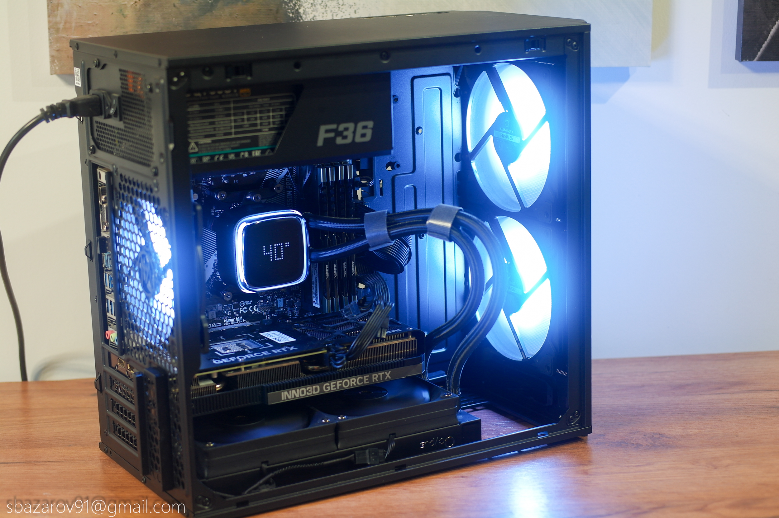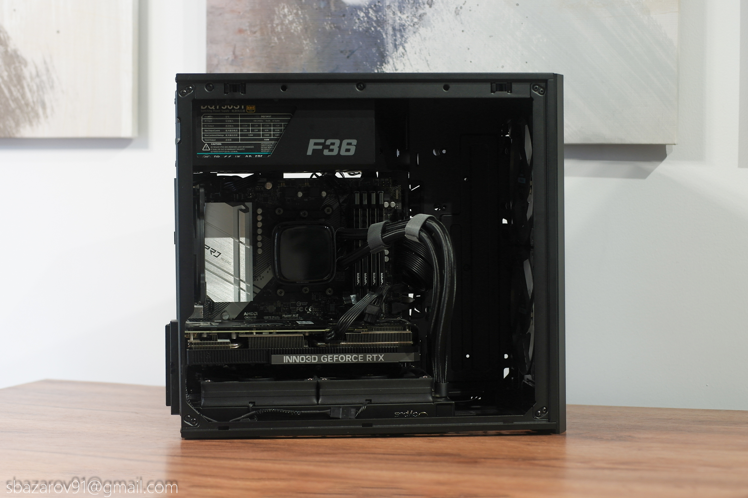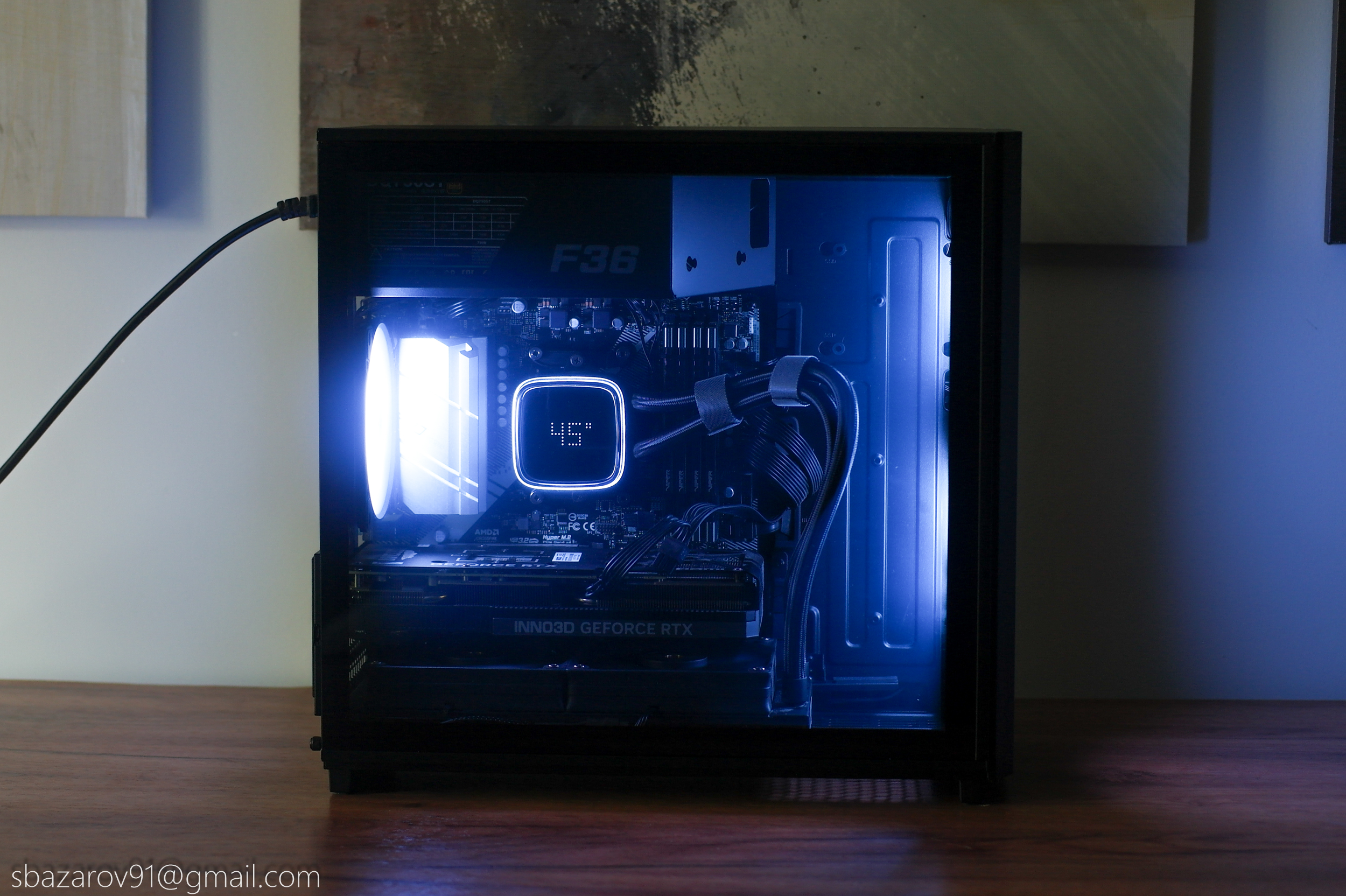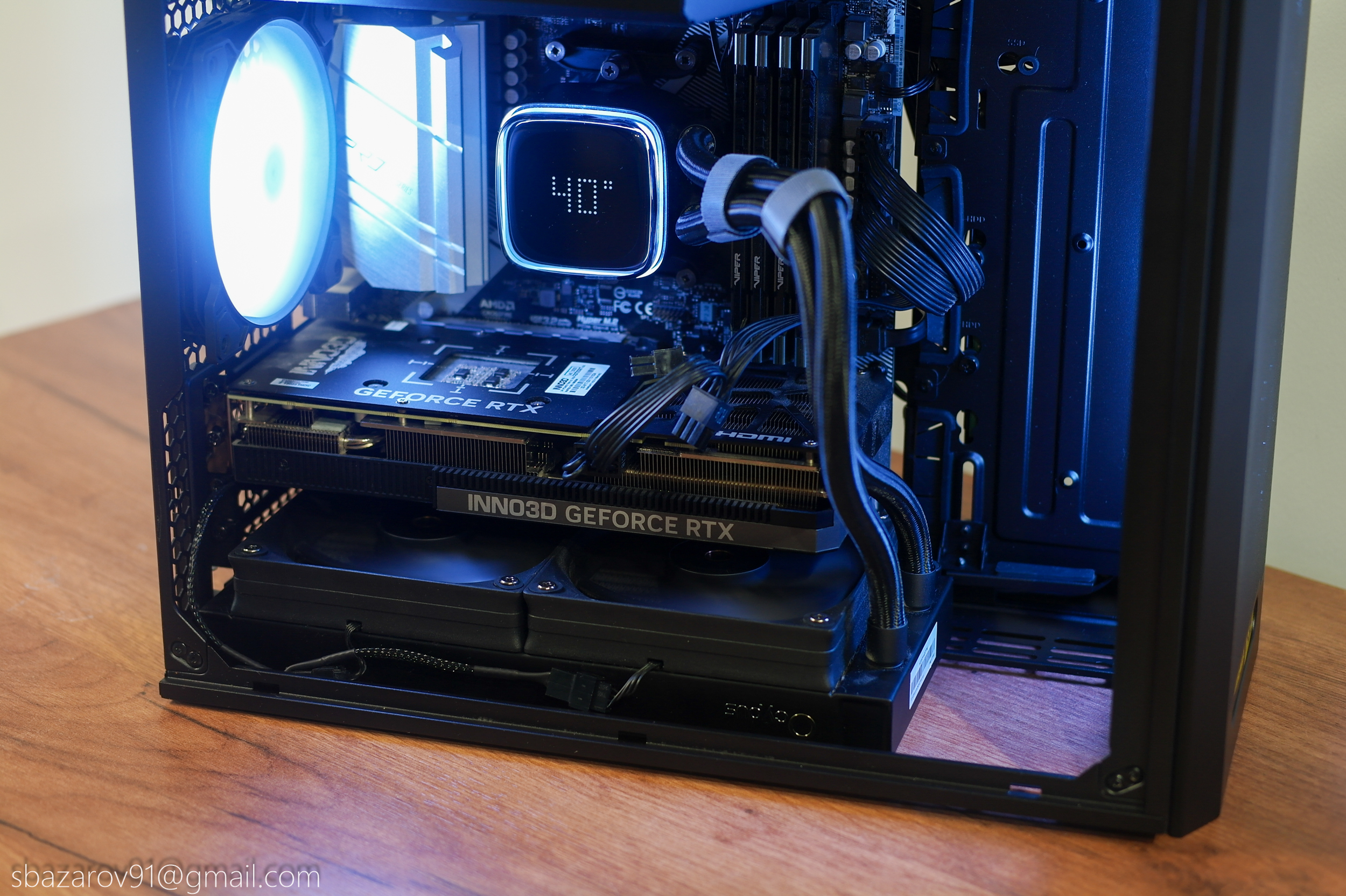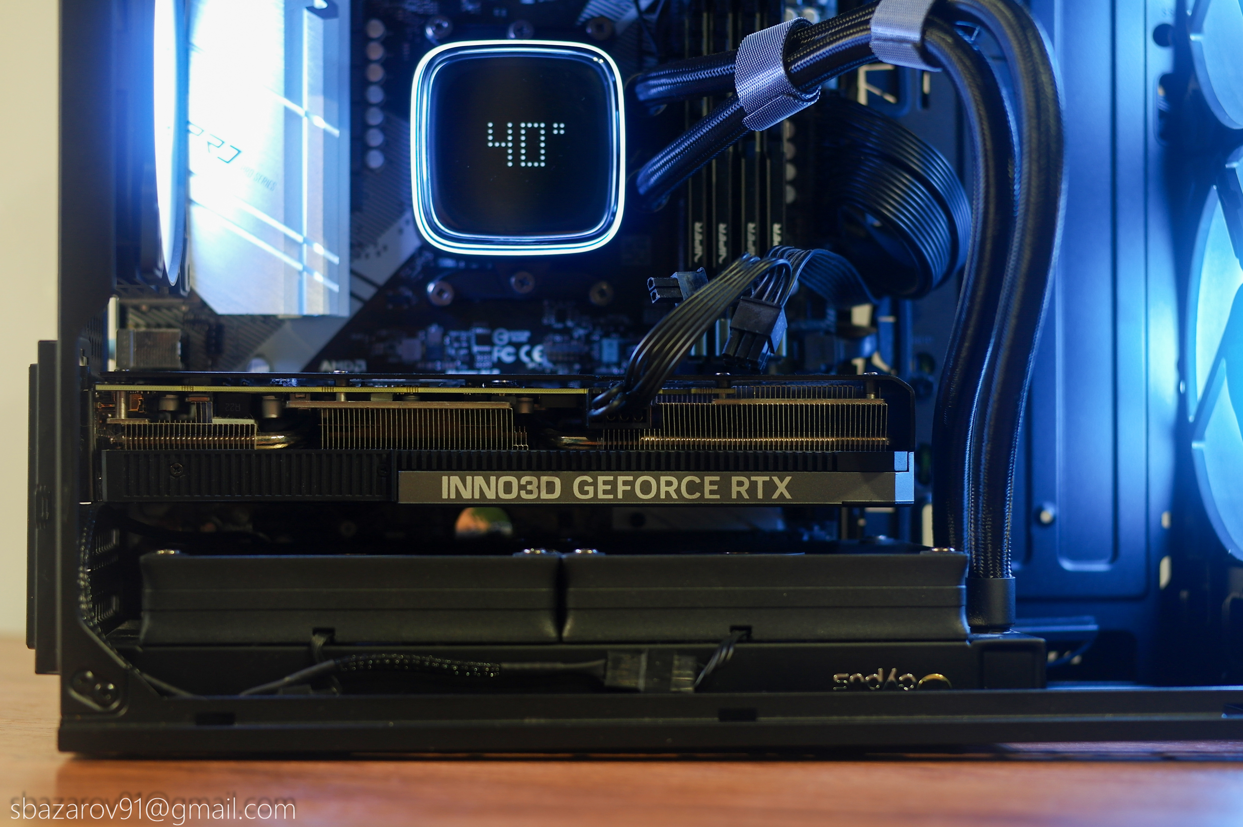Сборка системы заняла 1.5 часа с учетом демонтажа предыдущего корпуса Mid-Tower-корпуса Hiper Gaming OB. Основная сложность — компактное пространство для кабельной организации, приходилось по несколько раз откручивать радиатор СЖО для прокладки тех или иных жгутов к разъемам. Последовательность монтажа: материнская плата, блок питания, накопители, СЖО с временной фиксацией радиатора, видеокарта с подключением питания.