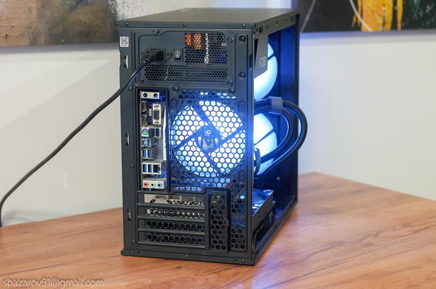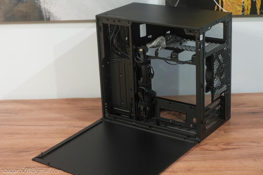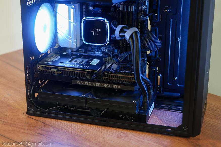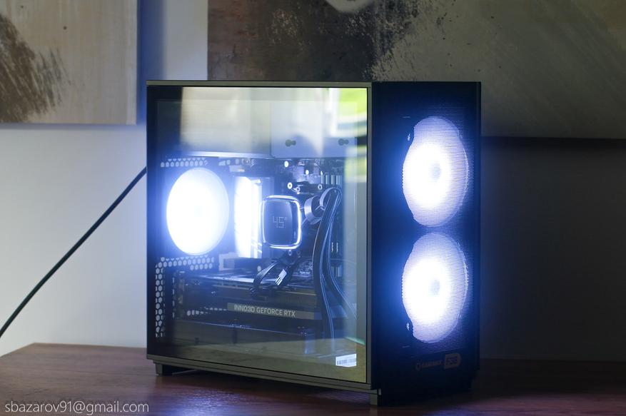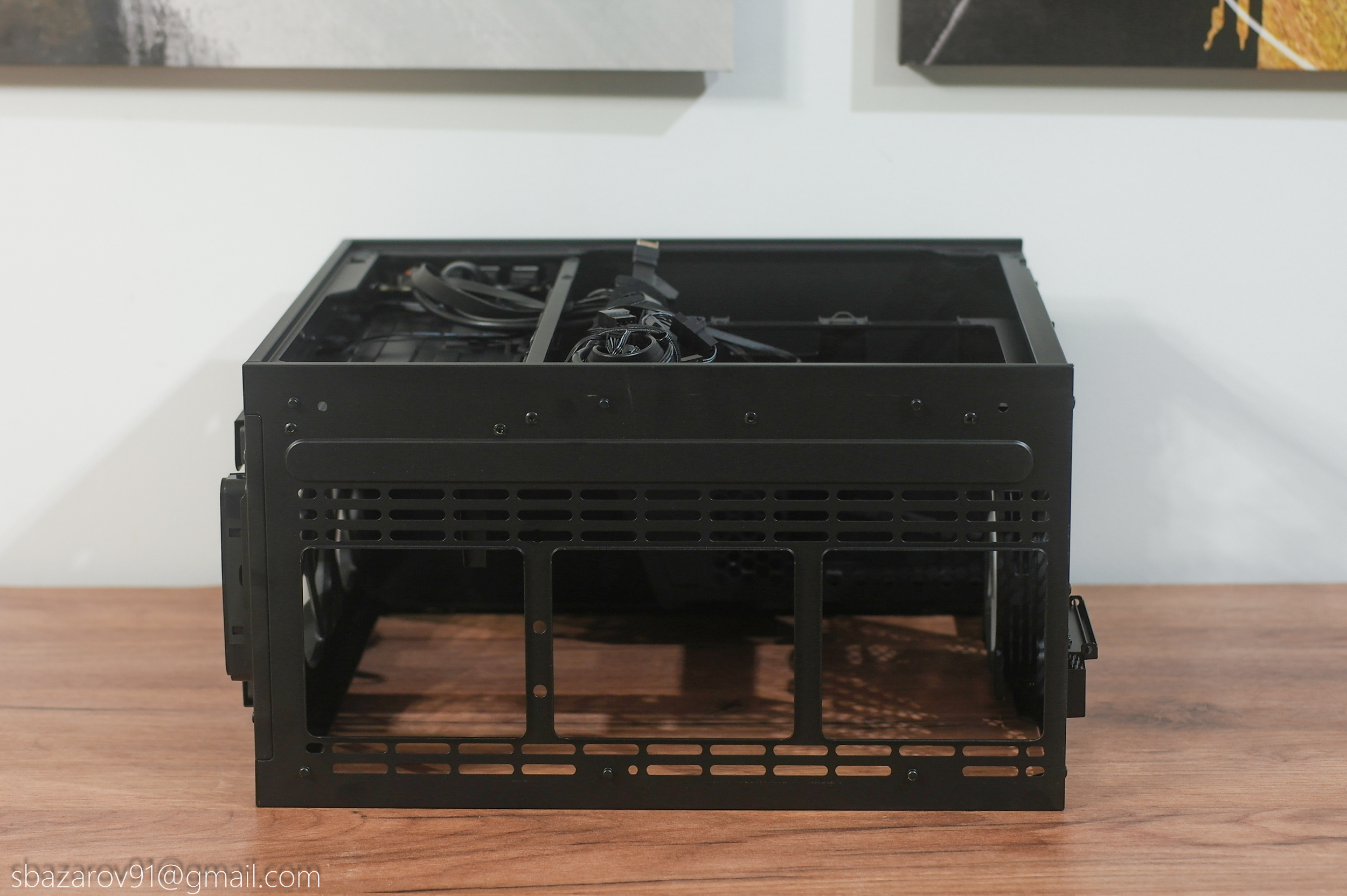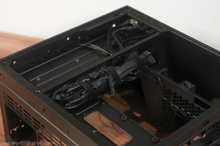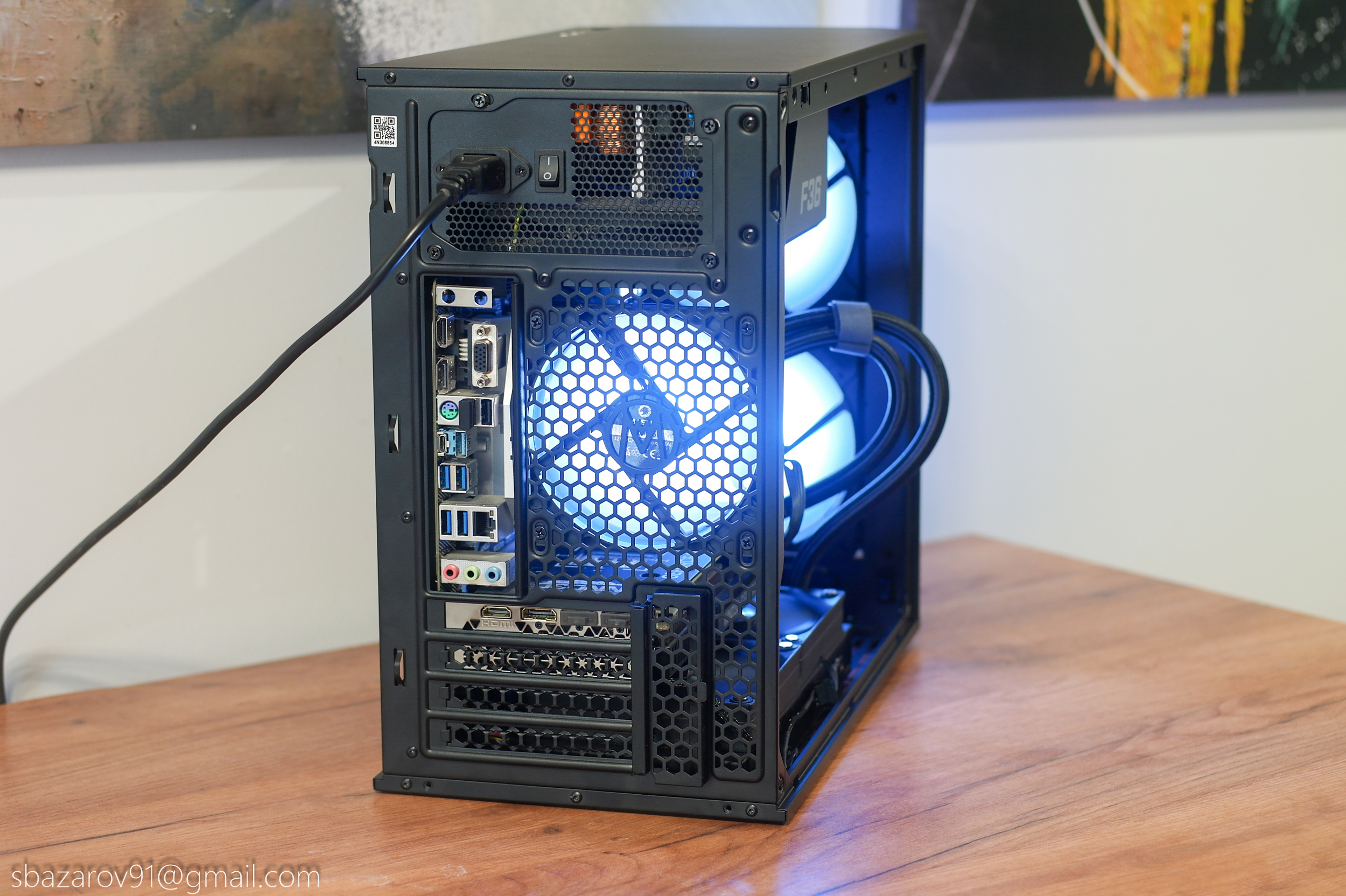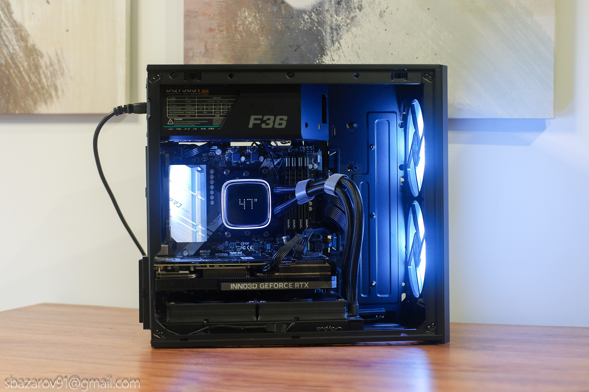 Сборка системы заняла 1.5 часа с учетом демонтажа предыдущего корпуса Mid-Tower-корпуса Hiper Gaming OB. Основная сложность — компактное пространство для кабельной организации, приходилось по несколько раз откручивать радиатор СЖО для прокладки тех или иных жгутов к разъемам. Последовательность монтажа: материнская плата, блок питания, накопители, СЖО с временной фиксацией радиатора, видеокарта с подключением питания.