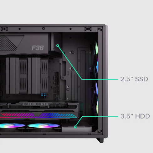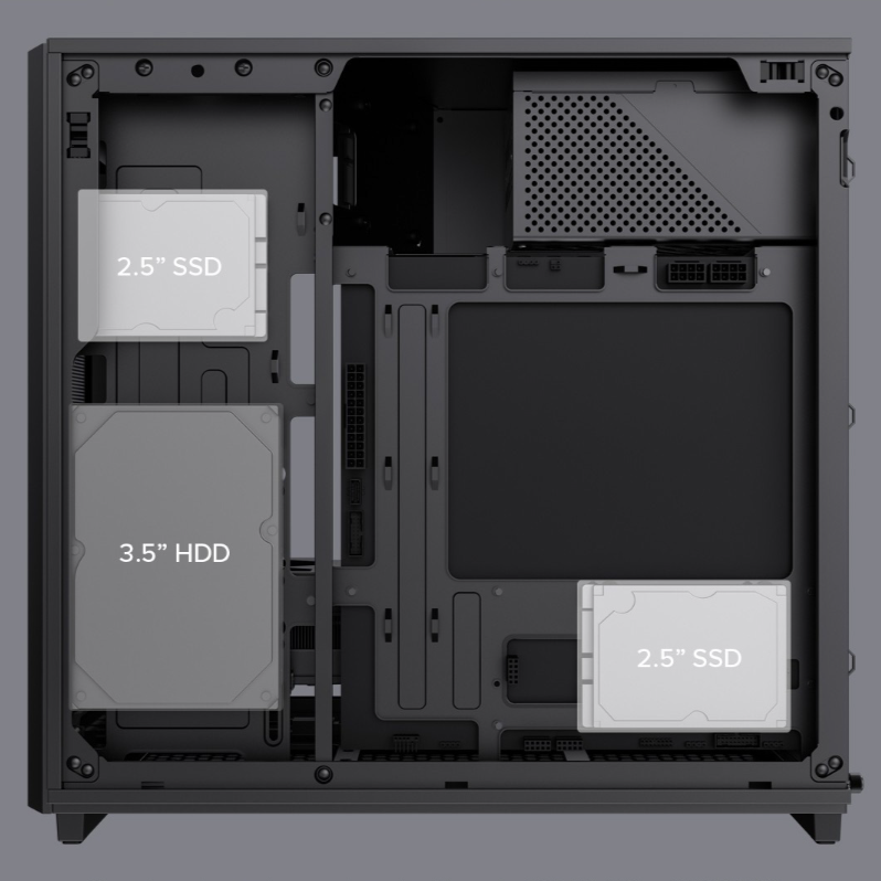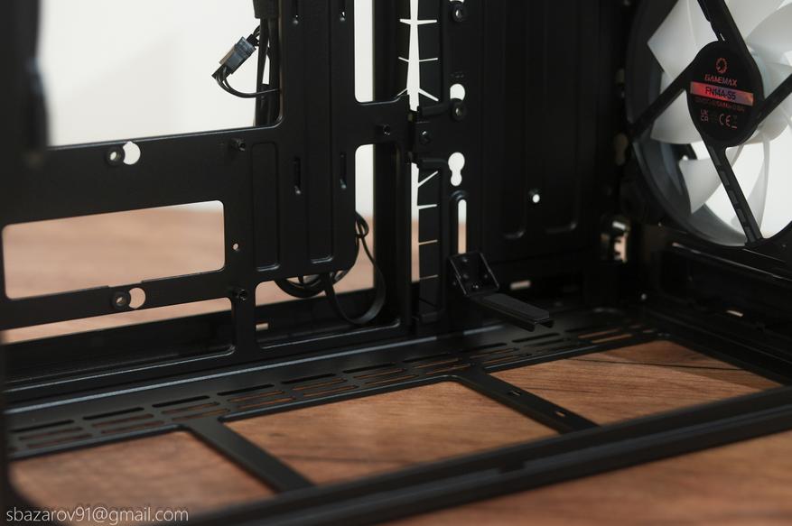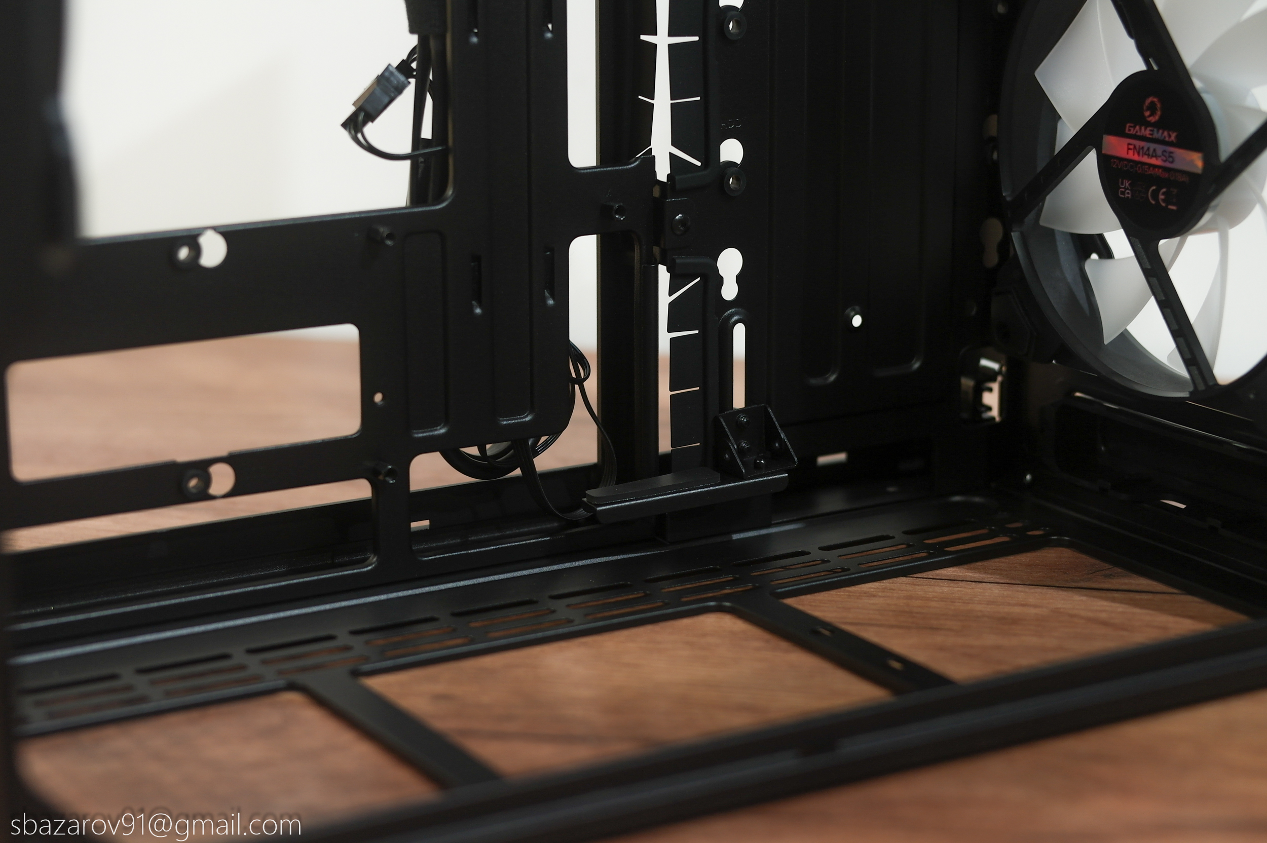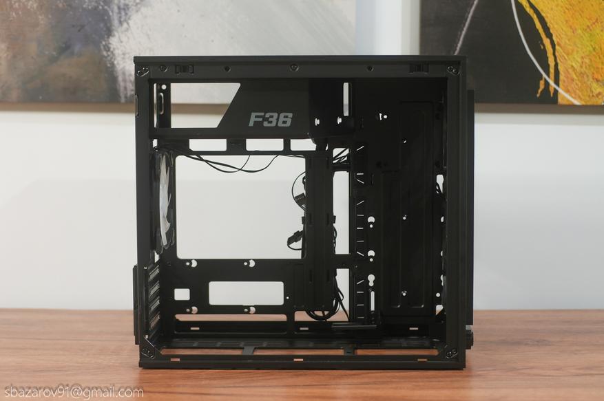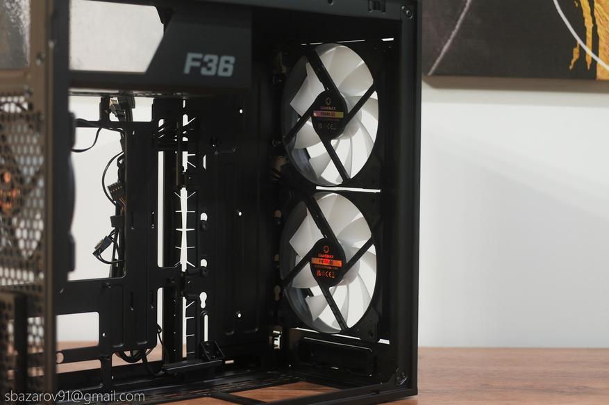 Дополнительно предусмотрено место для скрытого монтажа 2,5- и 3,5-дюймовых накопителей. Для этого имеется специальная ниша на обратной стороне корпуса с предустановленными резиновыми демпферами для гашения вибраций. Всего же в корпус GameMax F36 можно установить до 3-х 3.5'' HDD и 2-х 2.5'' SSD. Для накопителей предусмотрена скрытая ниша с виброгасящими демпферами. Также можно установить накопители в передней части корпуса, а максимальная конфигурация включает три HDD 3.5″ и два SSD 2.5″.