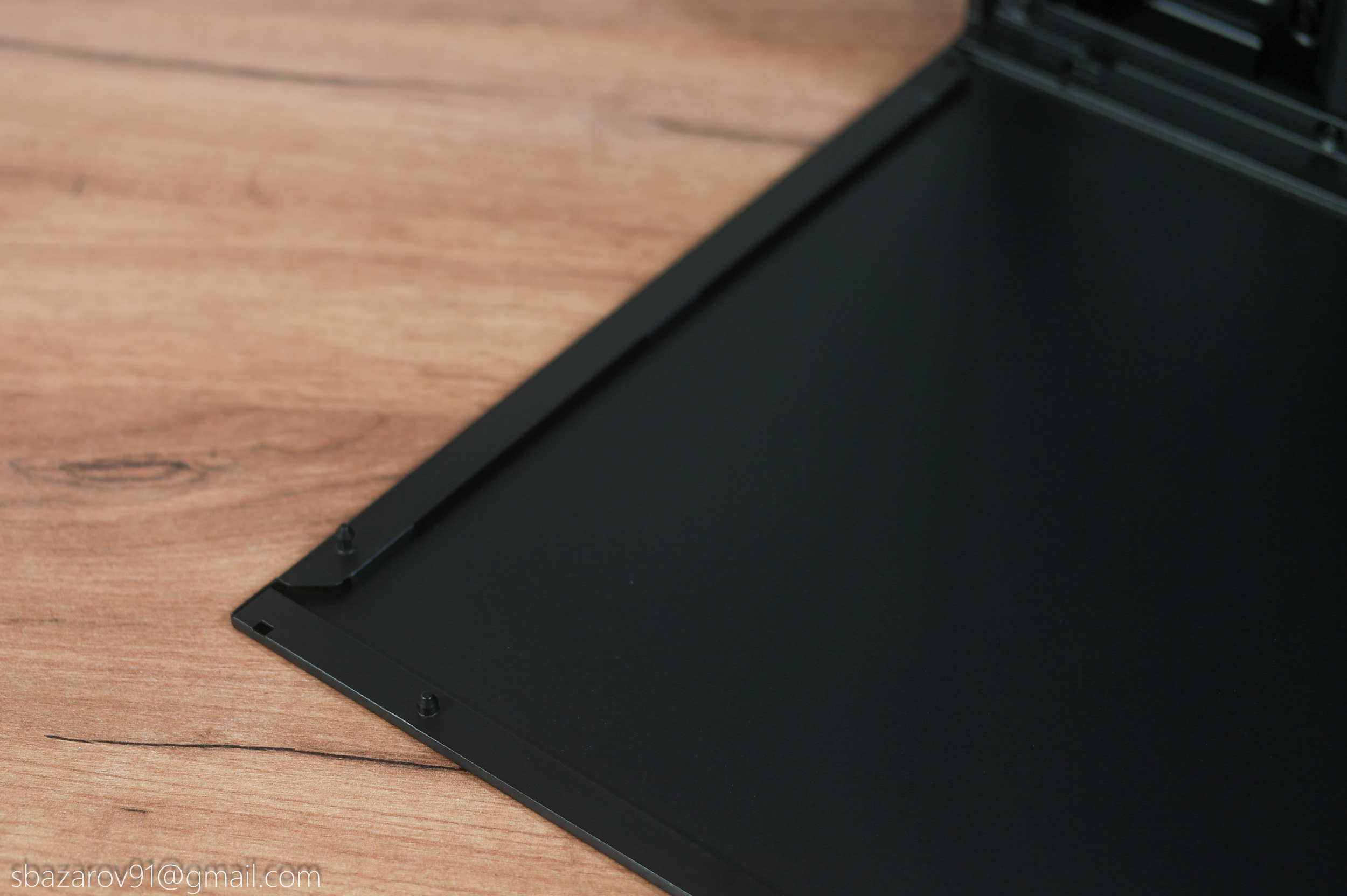 Для снятия глухой боковой панели необходимо отщелкнуть ее от верхних креплений, просто потянув на себя за специальный выступ. Сама панель имеет солидную толщину в