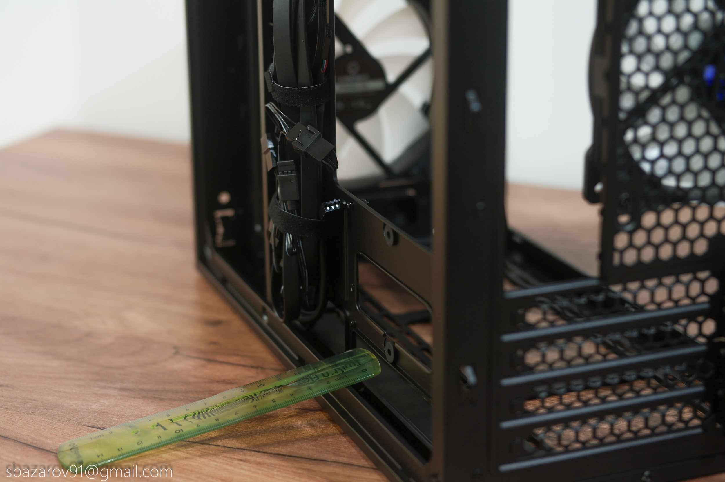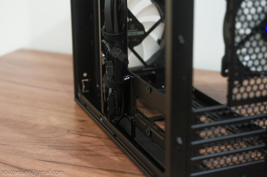 Подключение встроенной подсветки и панели I/O организовано разъемами оптимальной длины с поддержкой ARGB (5V) и питания вентиляторов (12V). Во всяком случае я легко смог подключить разъем ARGB к нижней части платы ASRock B550M PRO4. Для удобного кабельменеджмента предусмотрено 3 стяжки за центральной стойкой.