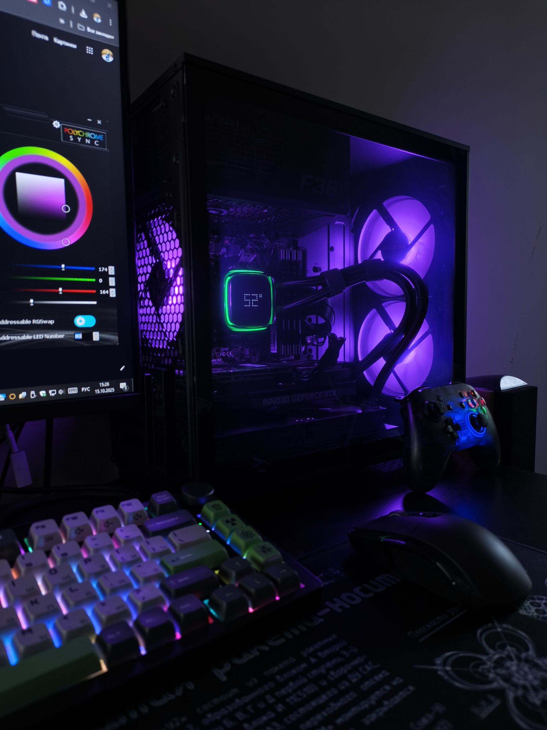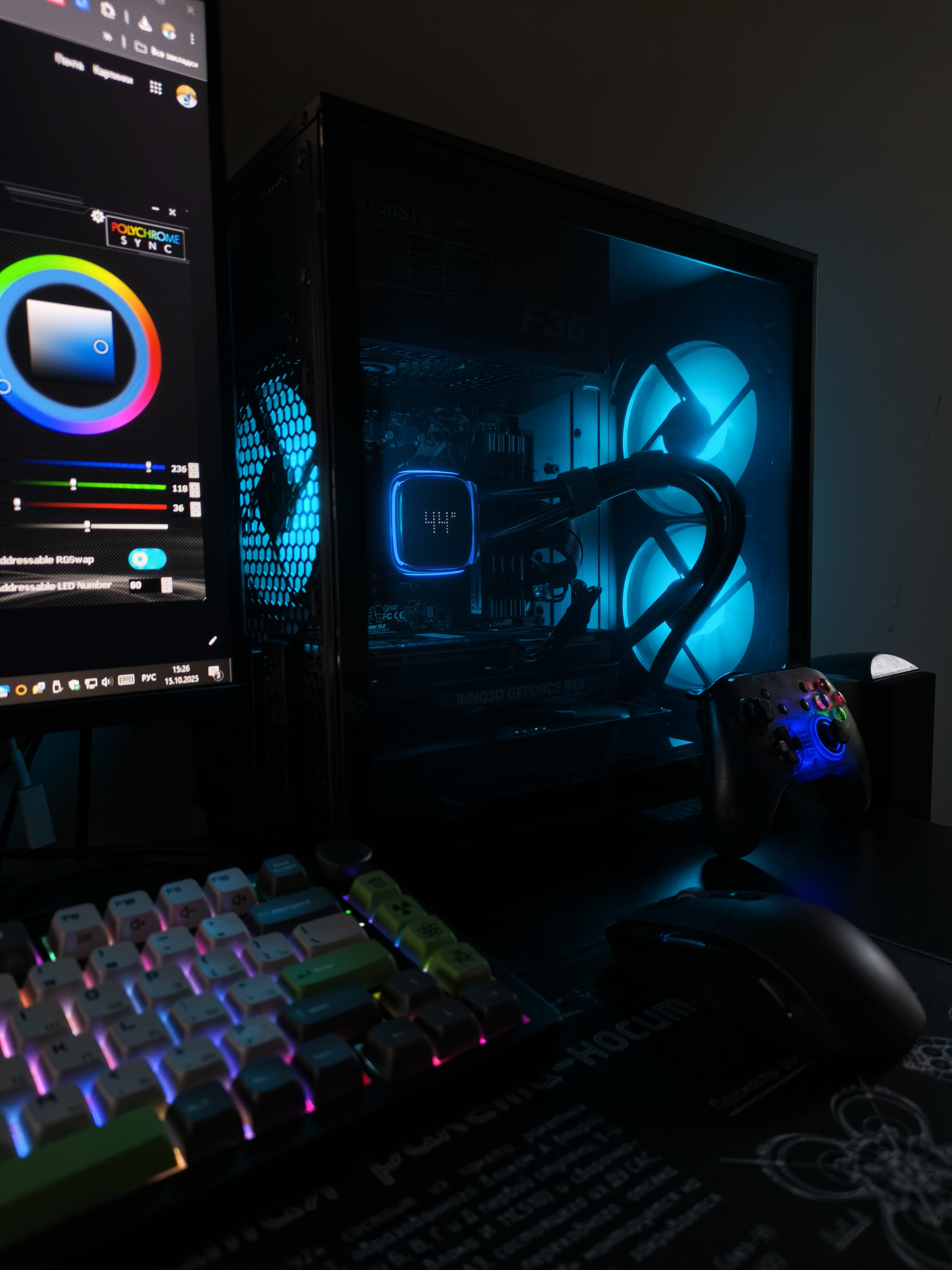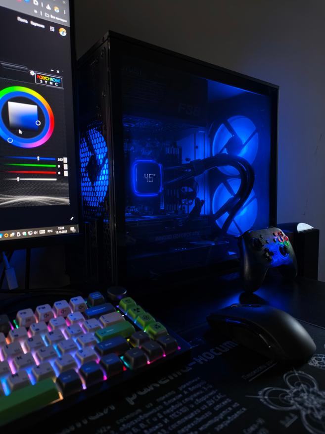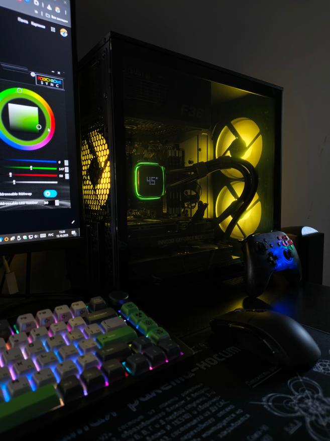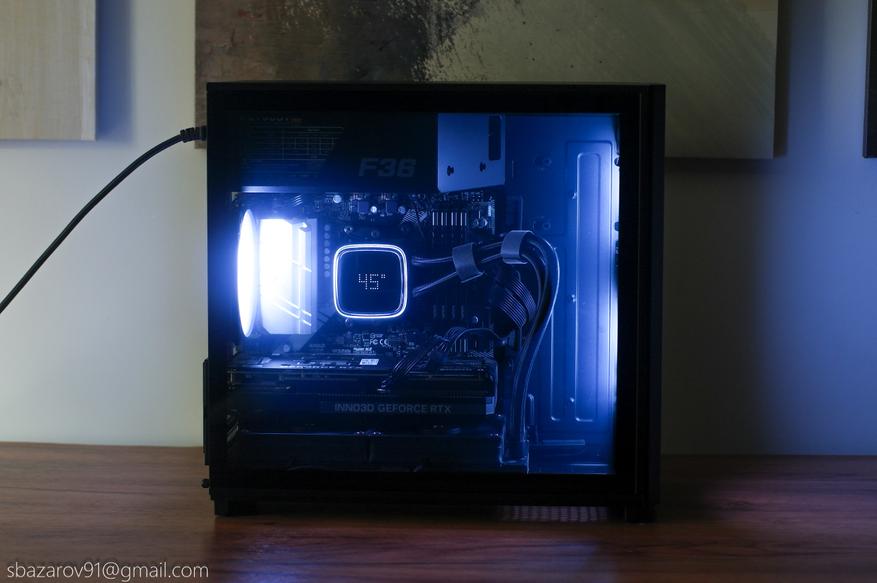 Тестовый запуск показал стабильную работу системы, демонстрируя температуру CPU на дисплее СЖО. Обе группы подсветки разделены на два независимых канала: фронтальные/задние вентиляторы и отдельно подключена подсветка помпы.