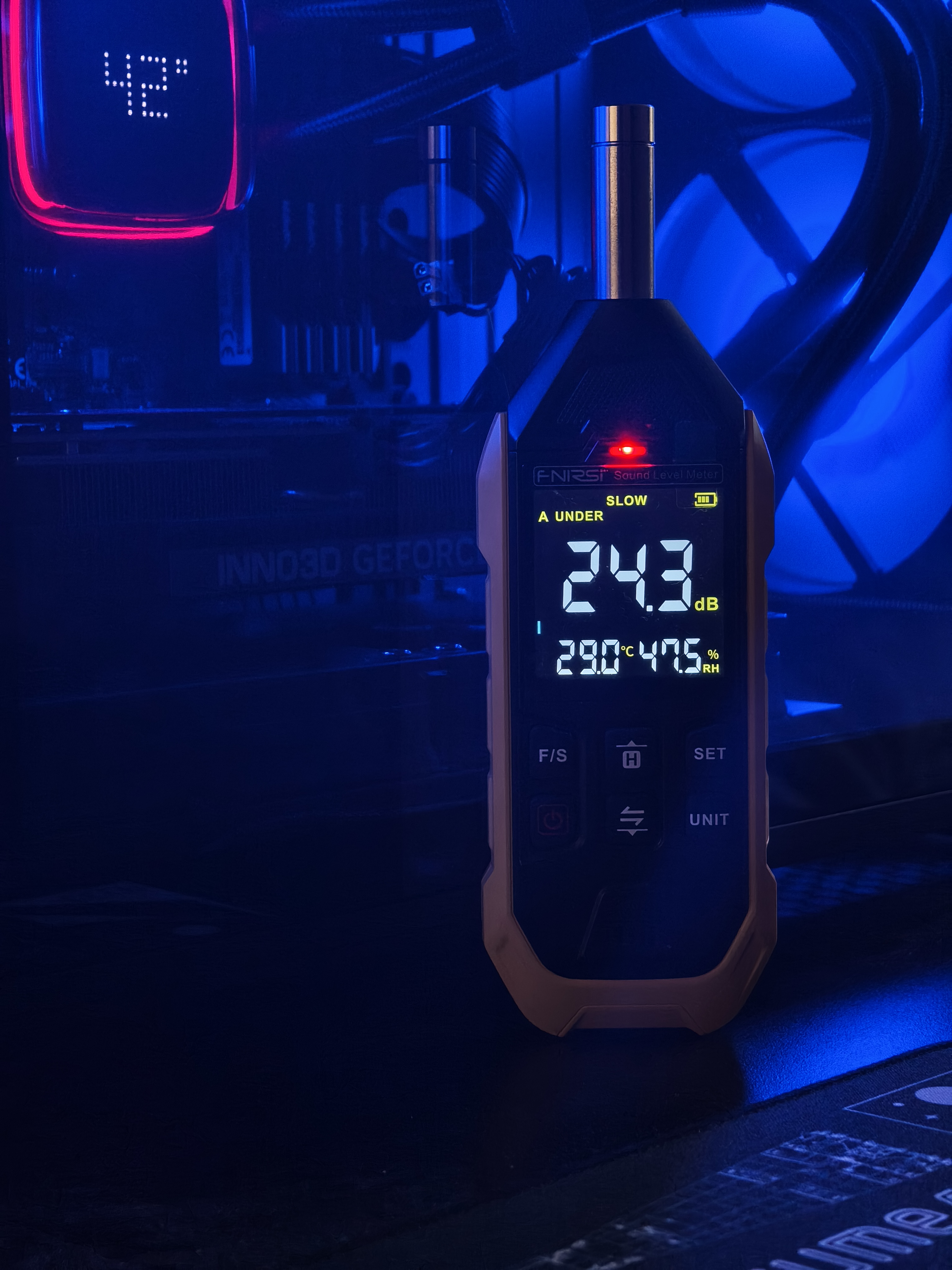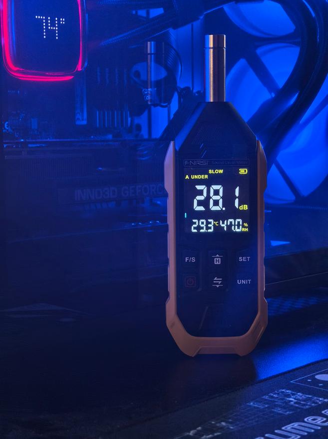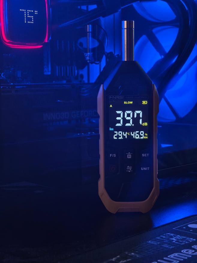 Замер уровня шума проводился рядом со стеклянной стенкой корпуса с помощью шумомера FNIRSI FDM01.